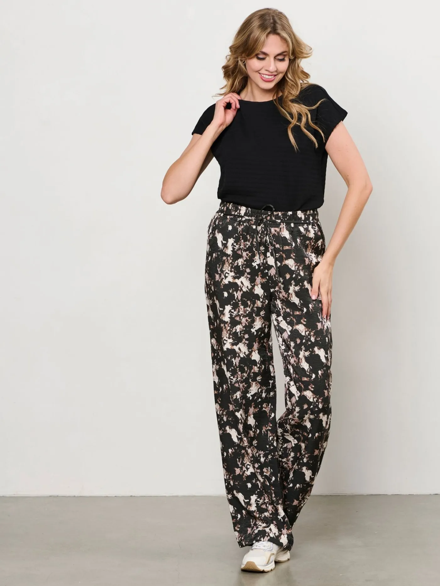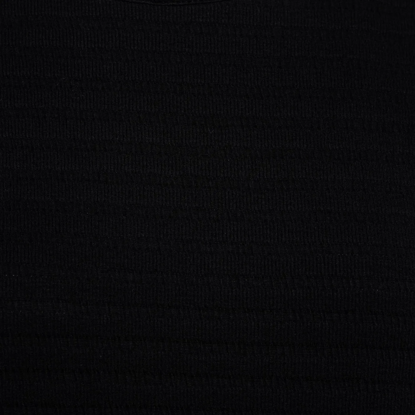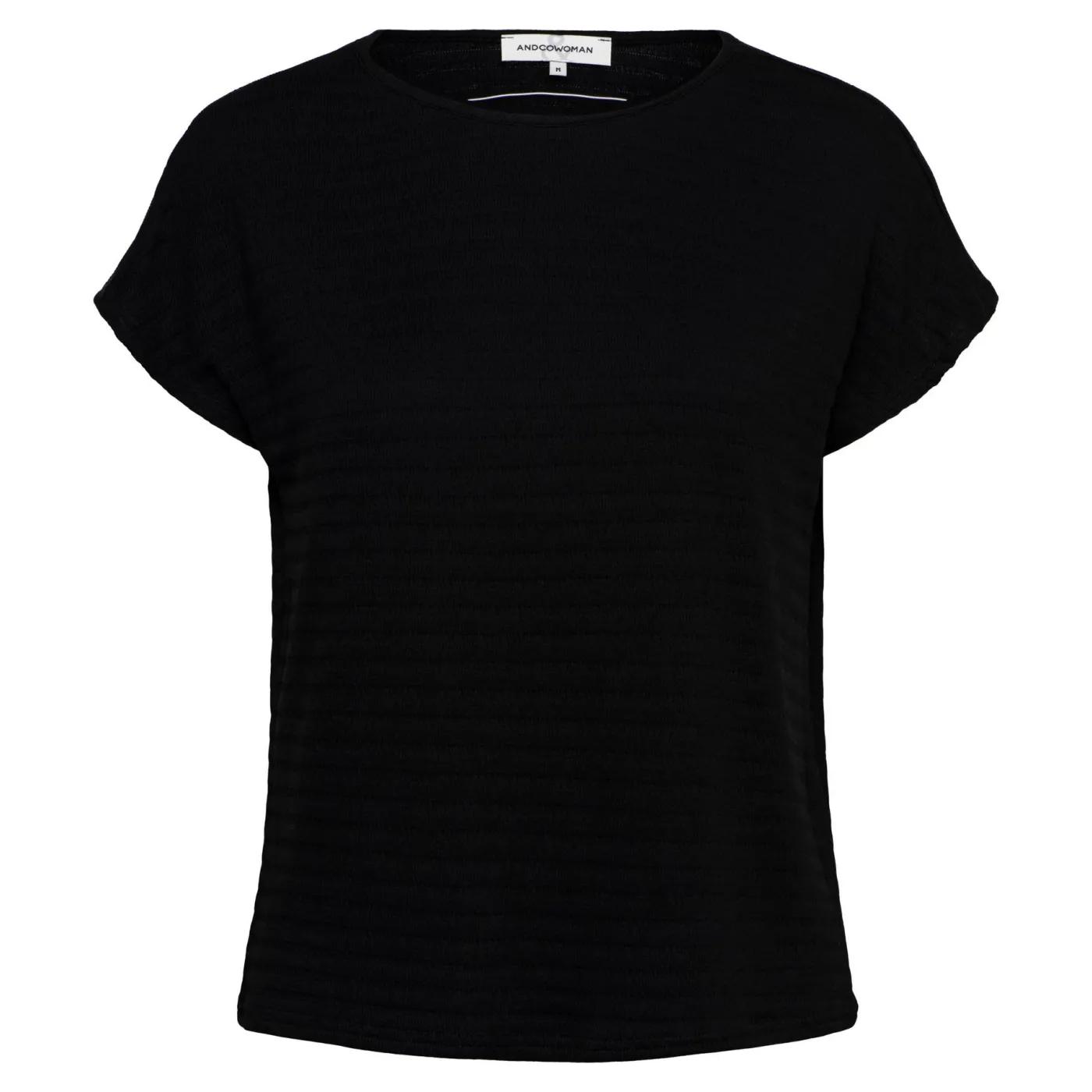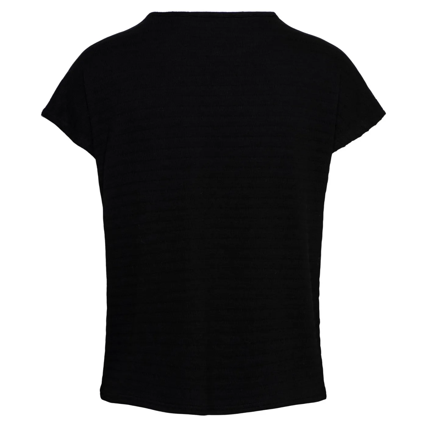 Zwarte top van &Co Woman met een subtiel patroon er in. De top heeft een ronde hals en korte mouwen. Een lekkere top voor als je het snel warm hebt.