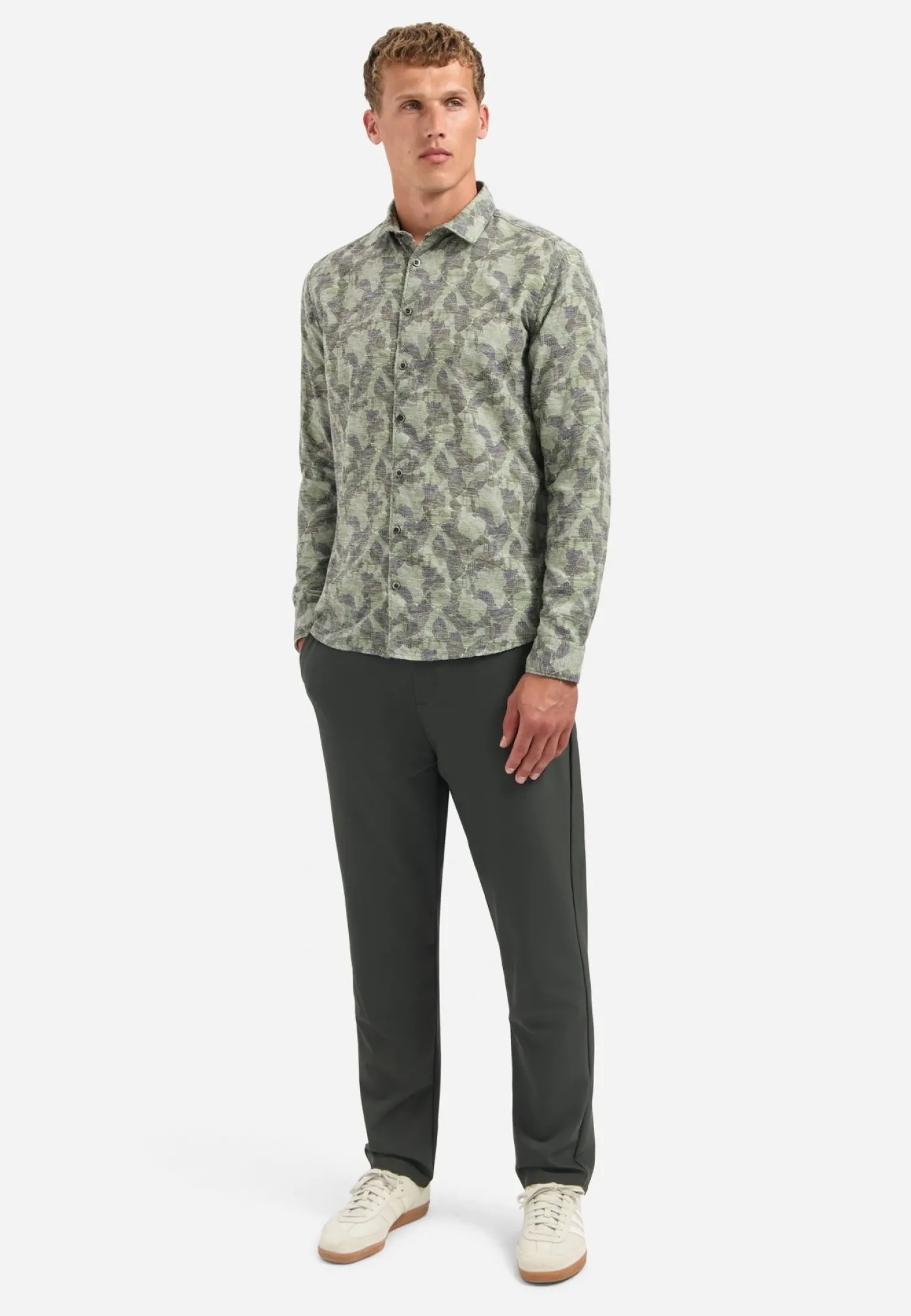 Een verfijnd herenoverhemd in een diepe donkergroene kleur, met een subtiel all over patroon. Dit overhemd combineert een klassieke kraag en knoopsluiting. De fijne textuur en moderne pasvorm maken het geschikt voor zowel zakelijke als stijlvolle casual gelegenheden. Een veelzijdige en elegante toevoeging aan de garderobe.