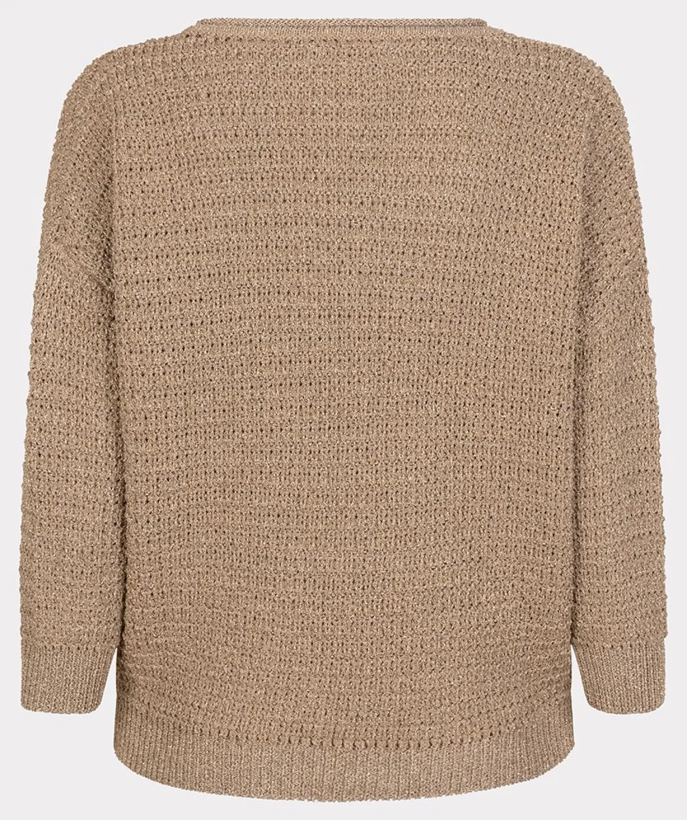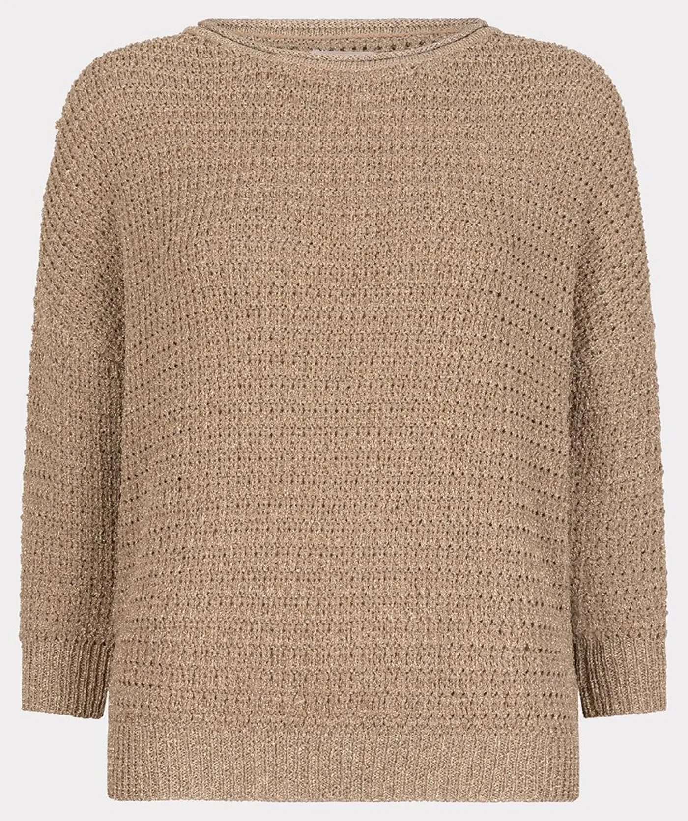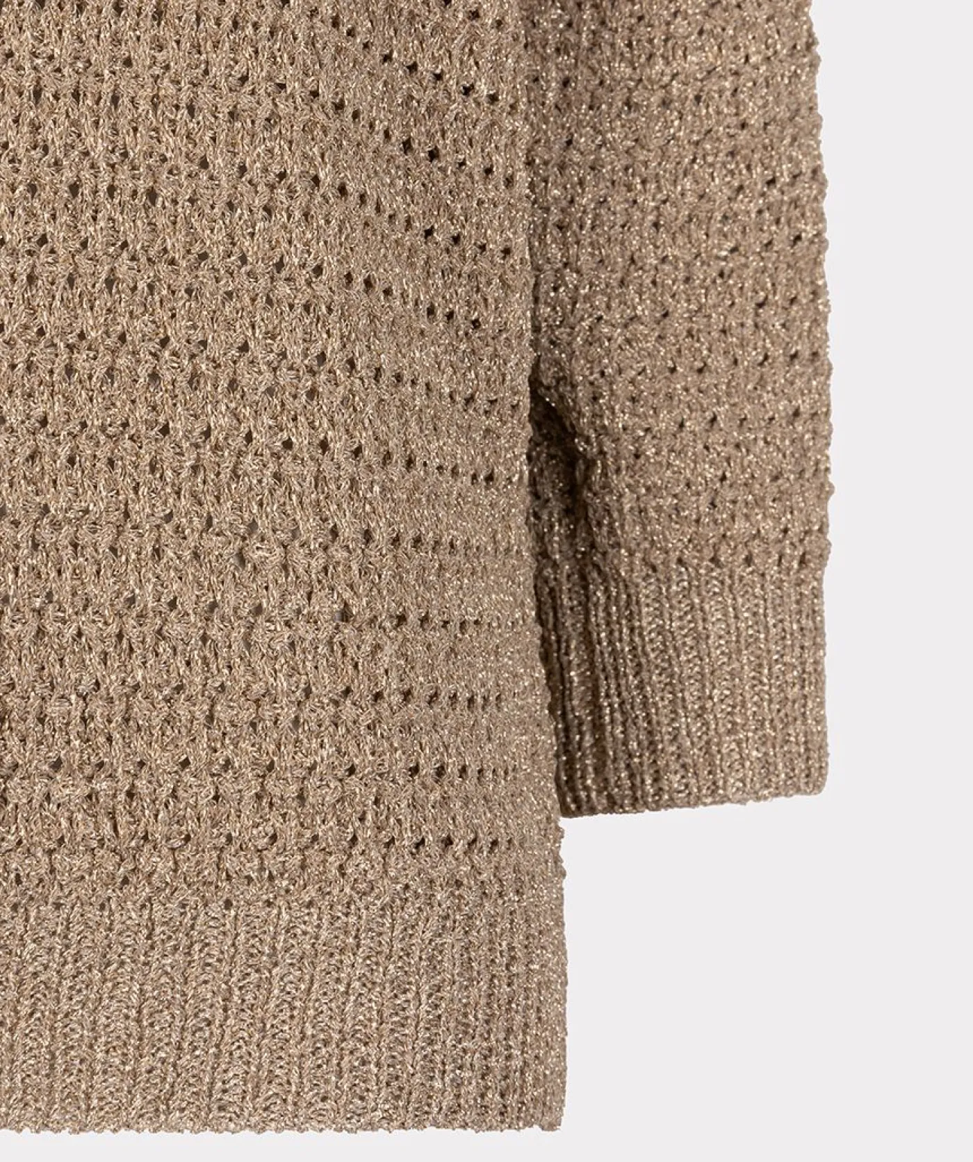 Deze stijlvolle gebreide trui combineert comfort en eenvoud met een tijdloze uitstraling. De grove structuur en subtiele ribboorden aan de zoom, mouwen en halslijn geven het ontwerp een moderne twist. De trui bevat een subtiele gouden glitter.Combineer met een jeans en enkellaarsjes voor een casual outfit, of draag het over een blouse voor een meer geklede look.