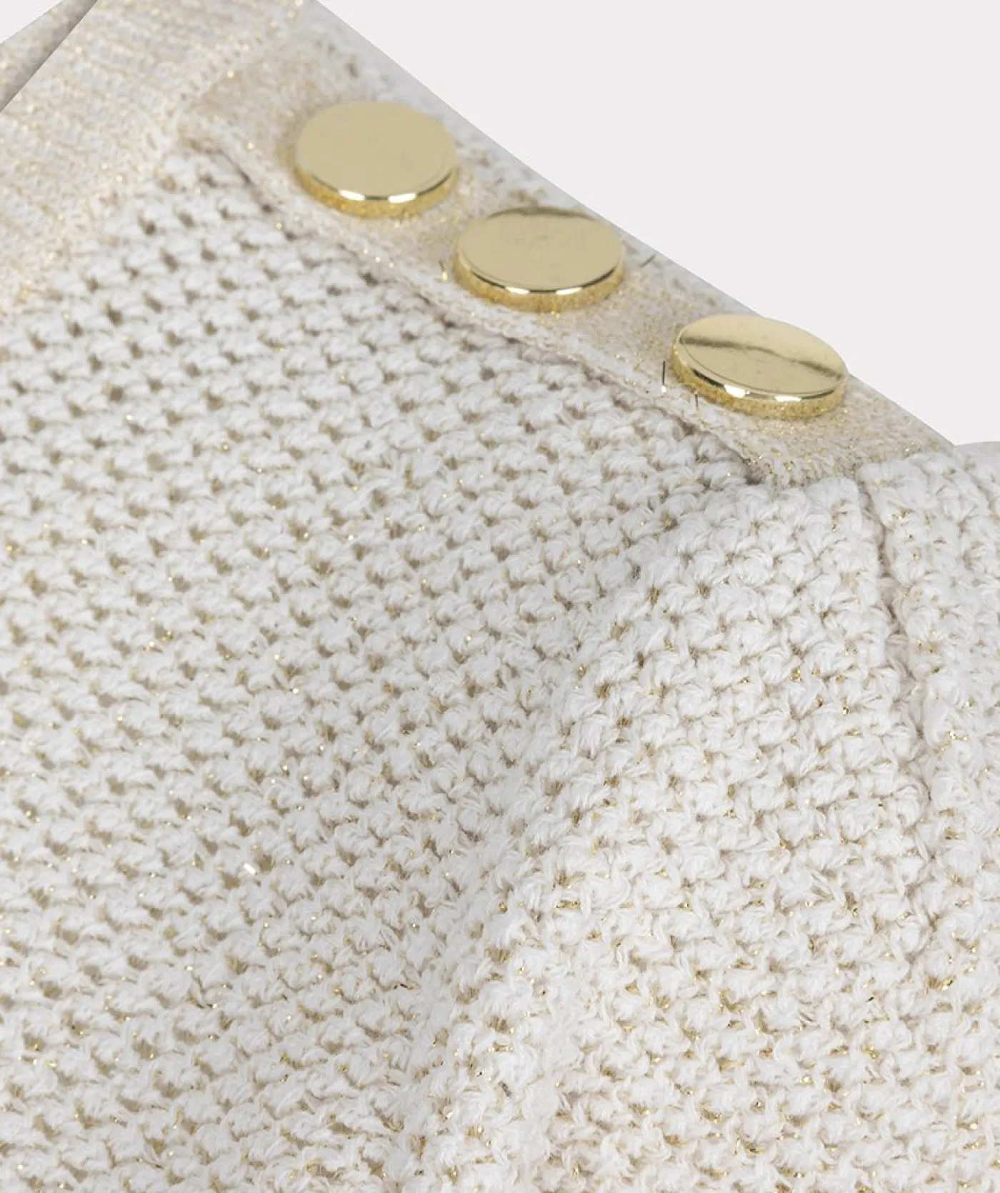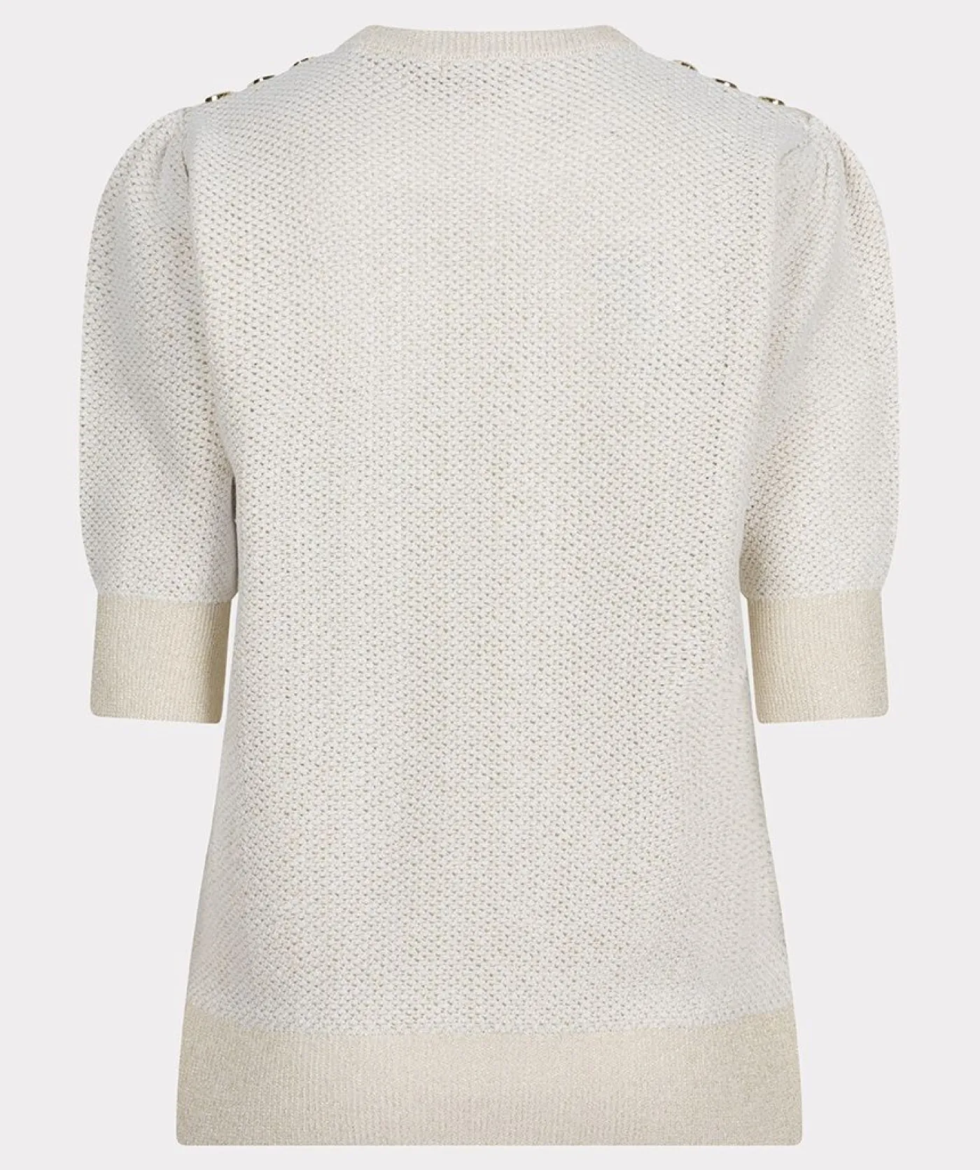 Het gehaakte T-shirt heeft een ronde hals en is voorzien van een subtiele glitter, wat het een speelse, elegante uitstraling geeft. De drie gouden knopen op de schouders voegen een chic detail toe. Het heeft een luchtige, vrouwelijke pasvorm, ideaal voor een casual maar toch verfijnde look.