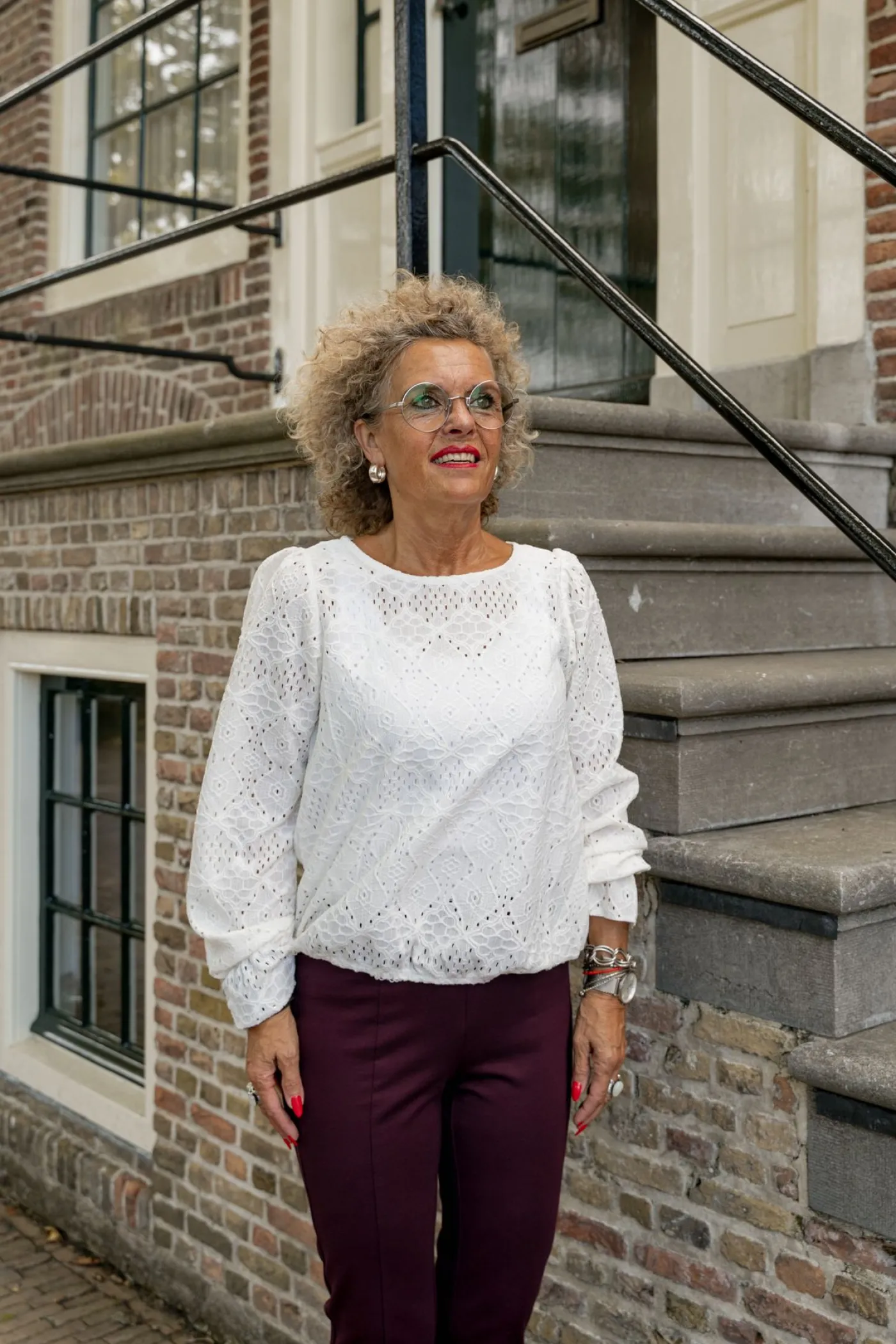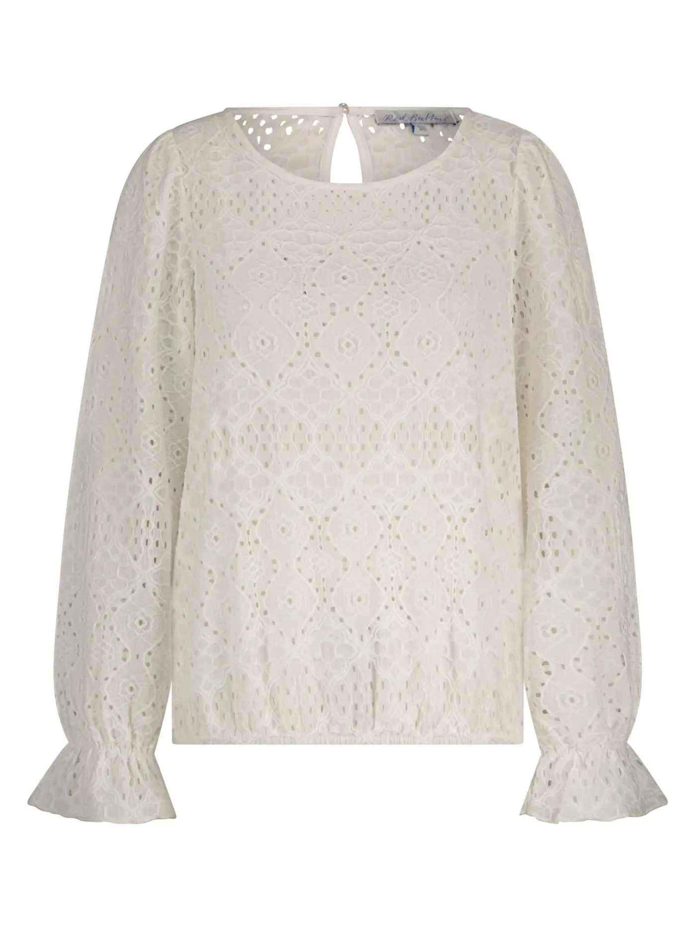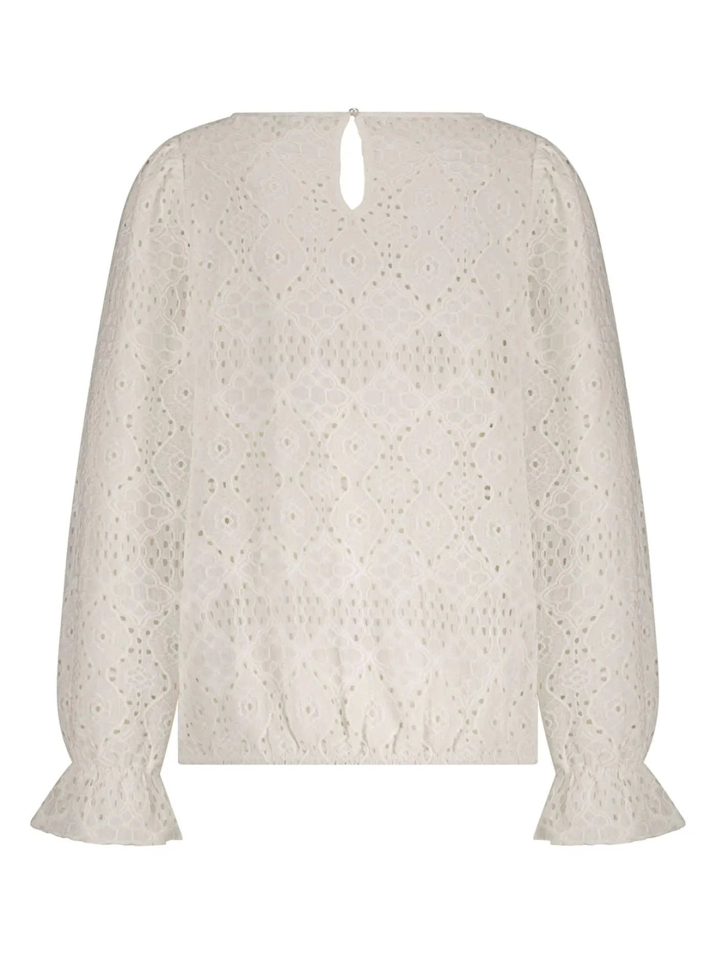 Deze crème kleurige kanten top is de perfecte mix van elegantie en comfort. Het verfijnde opengewerkte patroon geeft de top een romantische uitstraling, terwijl de ronde hals en knoopsluiting aan de achterkant zorgen voor een nette afwerking. De lange mouwen zijn voorzien van sierlijke volants aan de manchetten en de elastische zoom creëert een subtiel blousend effect voor een flatterende pasvorm.Een veelzijdig item dat moeiteloos past in elke garderobe.