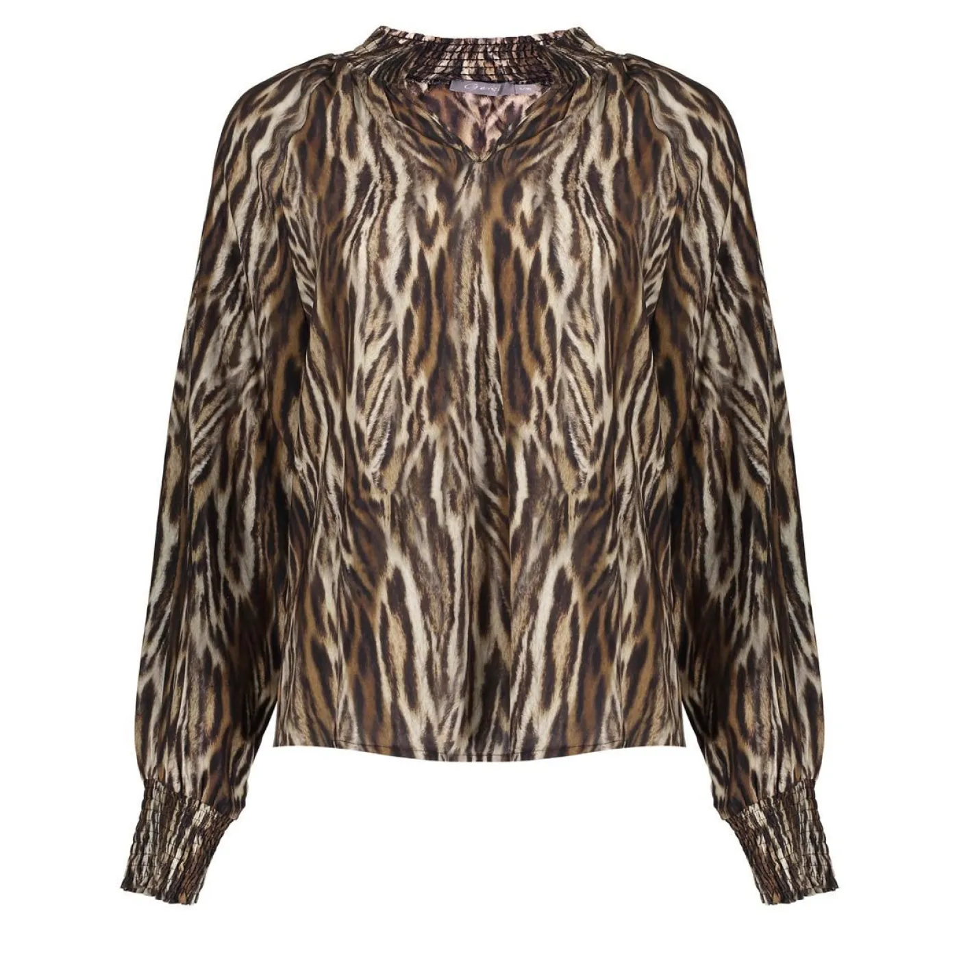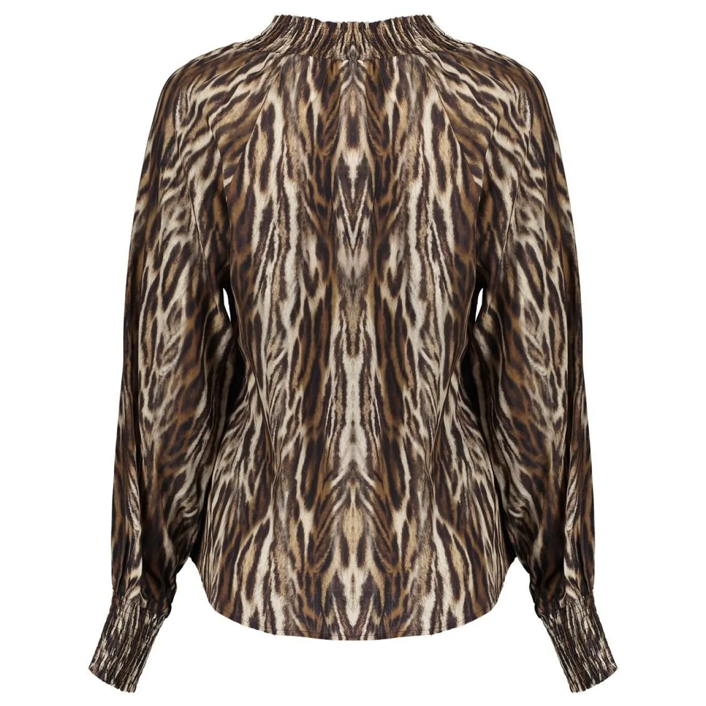 De Geisha top is voorzien van een trendy dieren‑print (“animal pattern”), wat zorgt voor een speelse en eigentijdse uitstraling. Het lichte materiaal maakt de top soepel en comfortabel om te dragen, ideaal voor warme dagen of als laagje onder een jasje. De lange mouwen geven extra bedekking en balans met het gedurfde motief. De loose fit zorgt voor een relaxed silhouet dat je zowel casual als gekleed kunt stylen. Dankzij de opvallende print vormt deze top een echte eyecatcher in je garderobe.