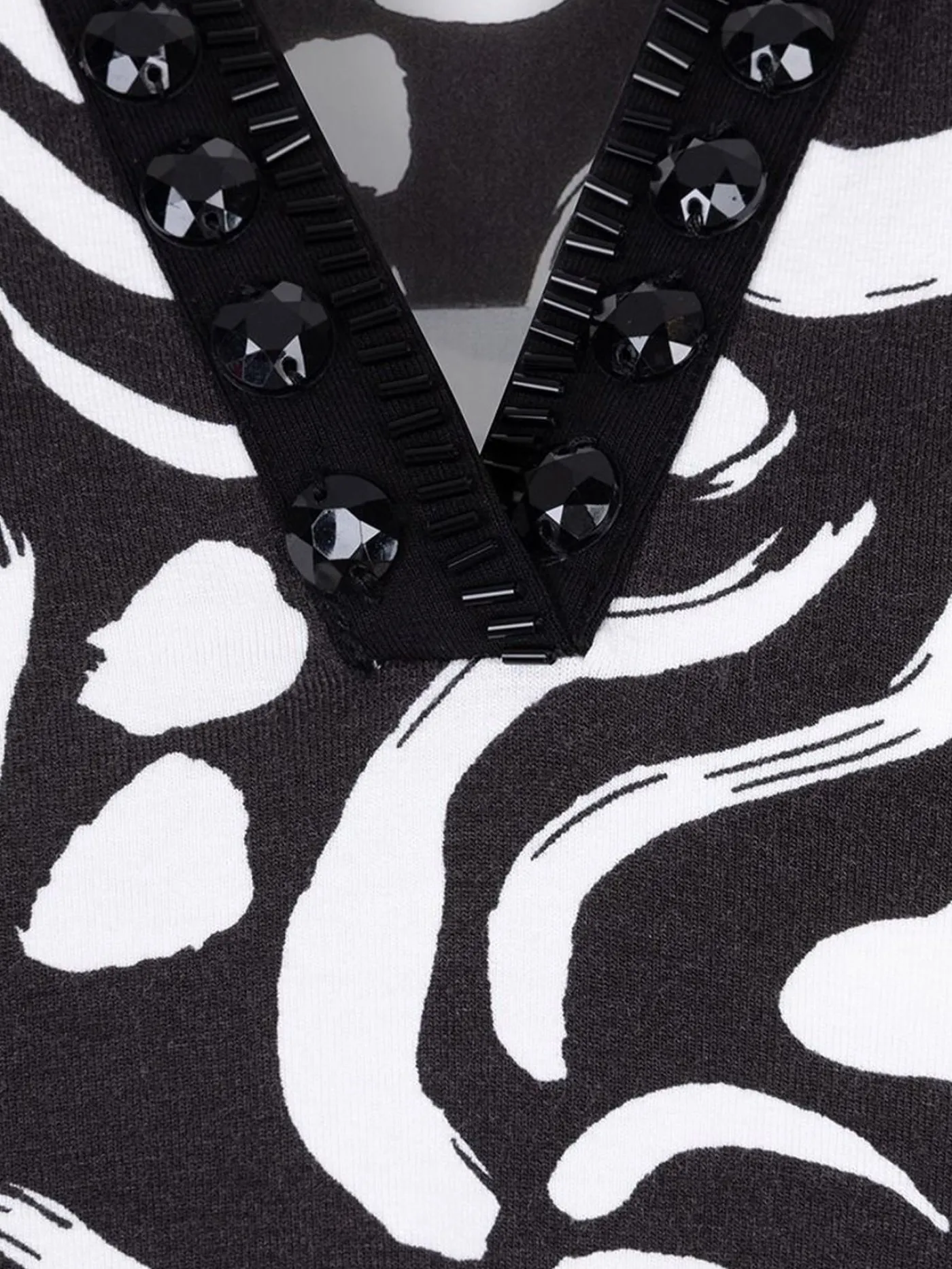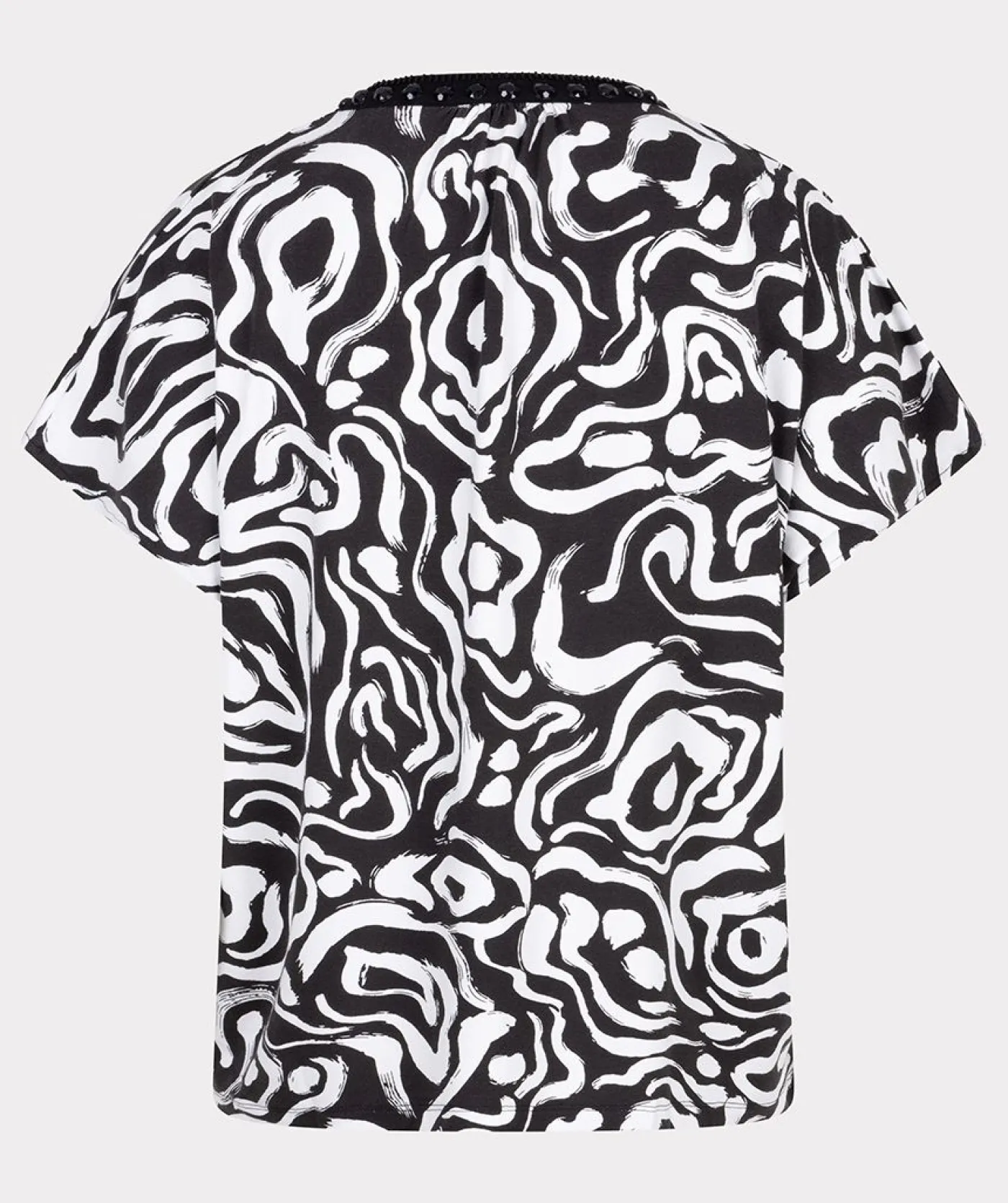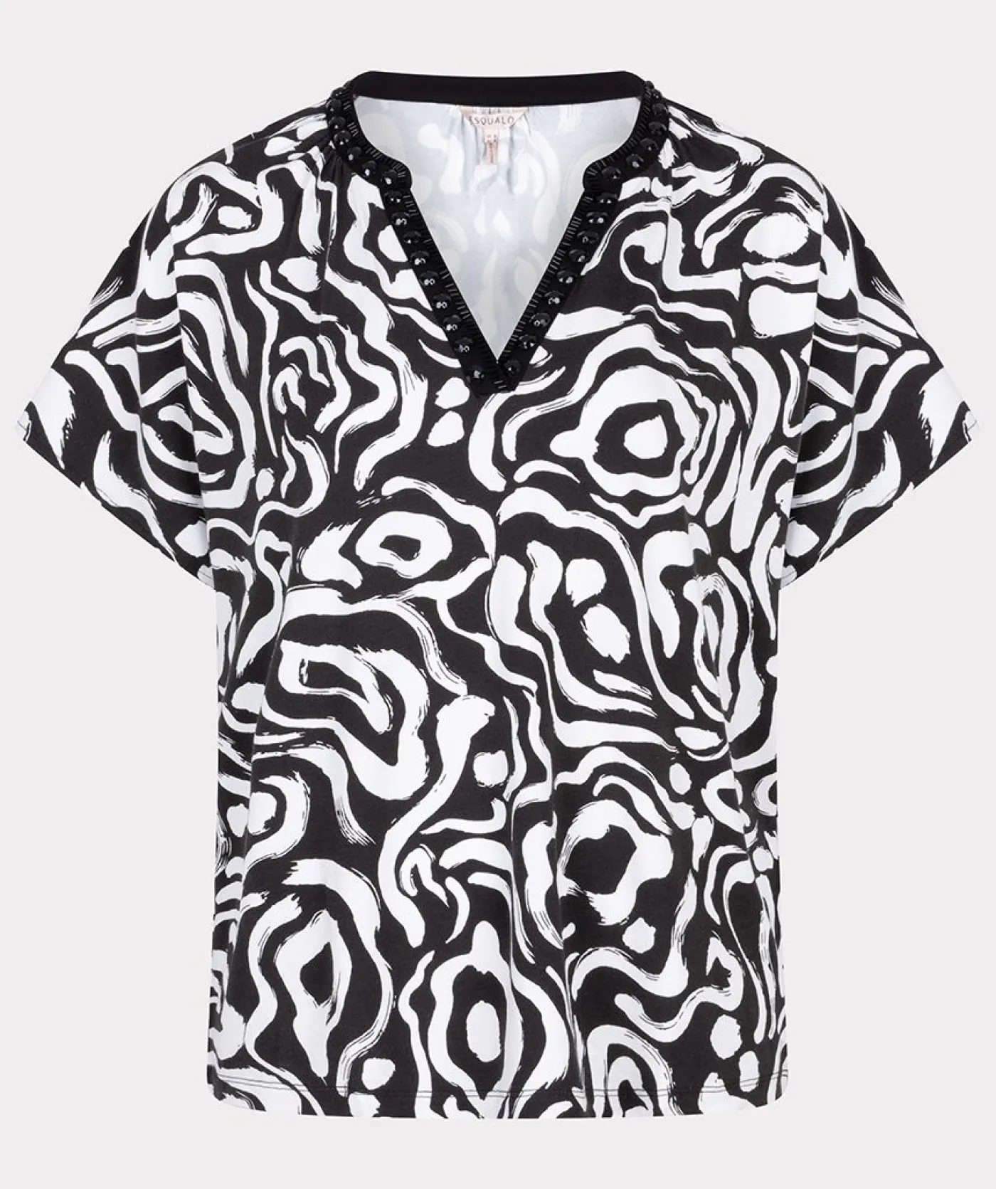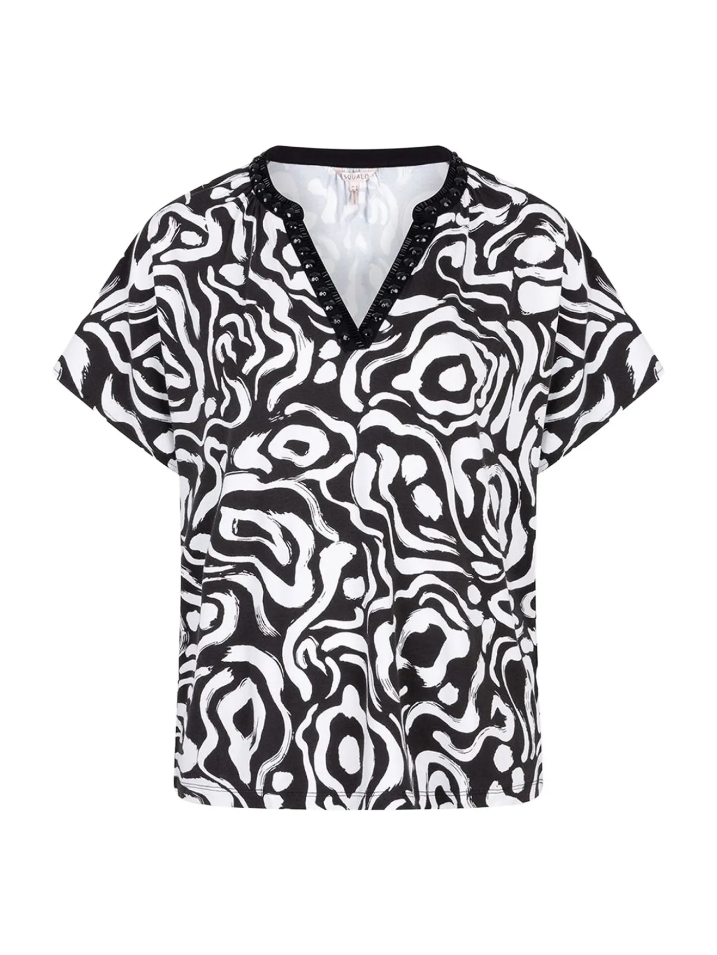 De Esqualo Top Beads Playful Print SJ is een stijlvolle damesblouse met een opvallend zwart-wit patroon en een subtiele kraaldetail langs de halslijn. Deze top is ontworpen voor een comfortabele pasvorm en is ideaal voor zowel casual als meer formele gelegenheden.