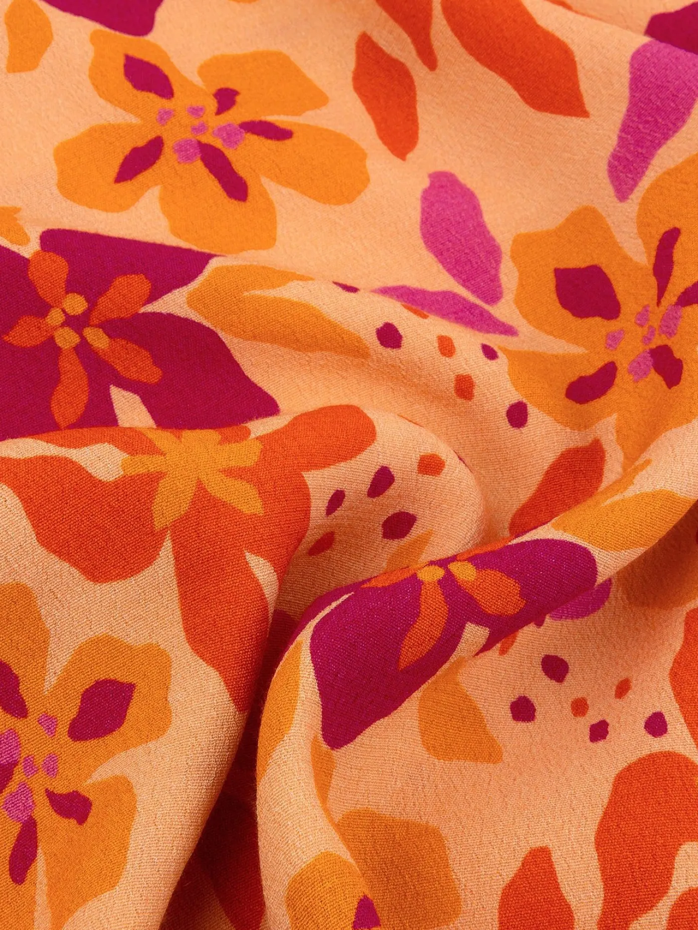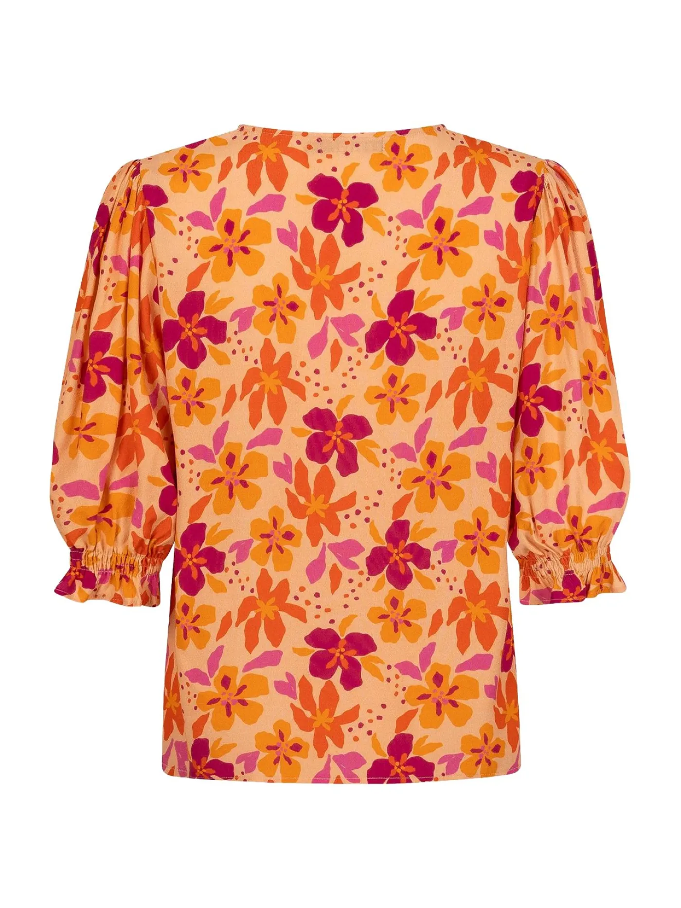 De Top Jordan is een vrouwelijke, zomerse top met een licht getailleerde pasvorm, V-hals en pofmouwtjes tot de elleboog met elastische manchetten en ruffle. Gemaakt van een soepelvallende mix van viscose en rayon, en uitgevoerd in een zomerse print voor een frisse en elegante uitstraling.