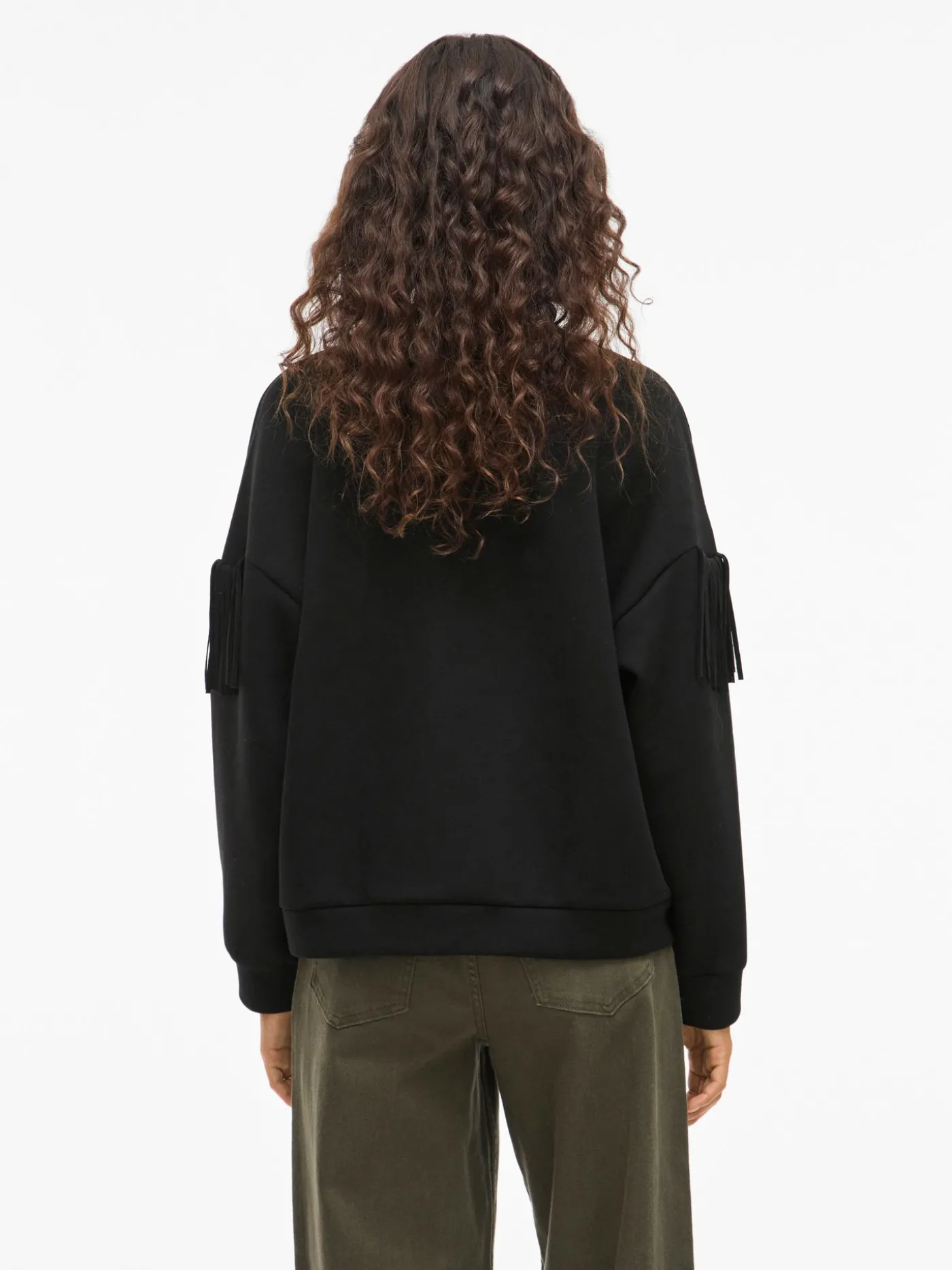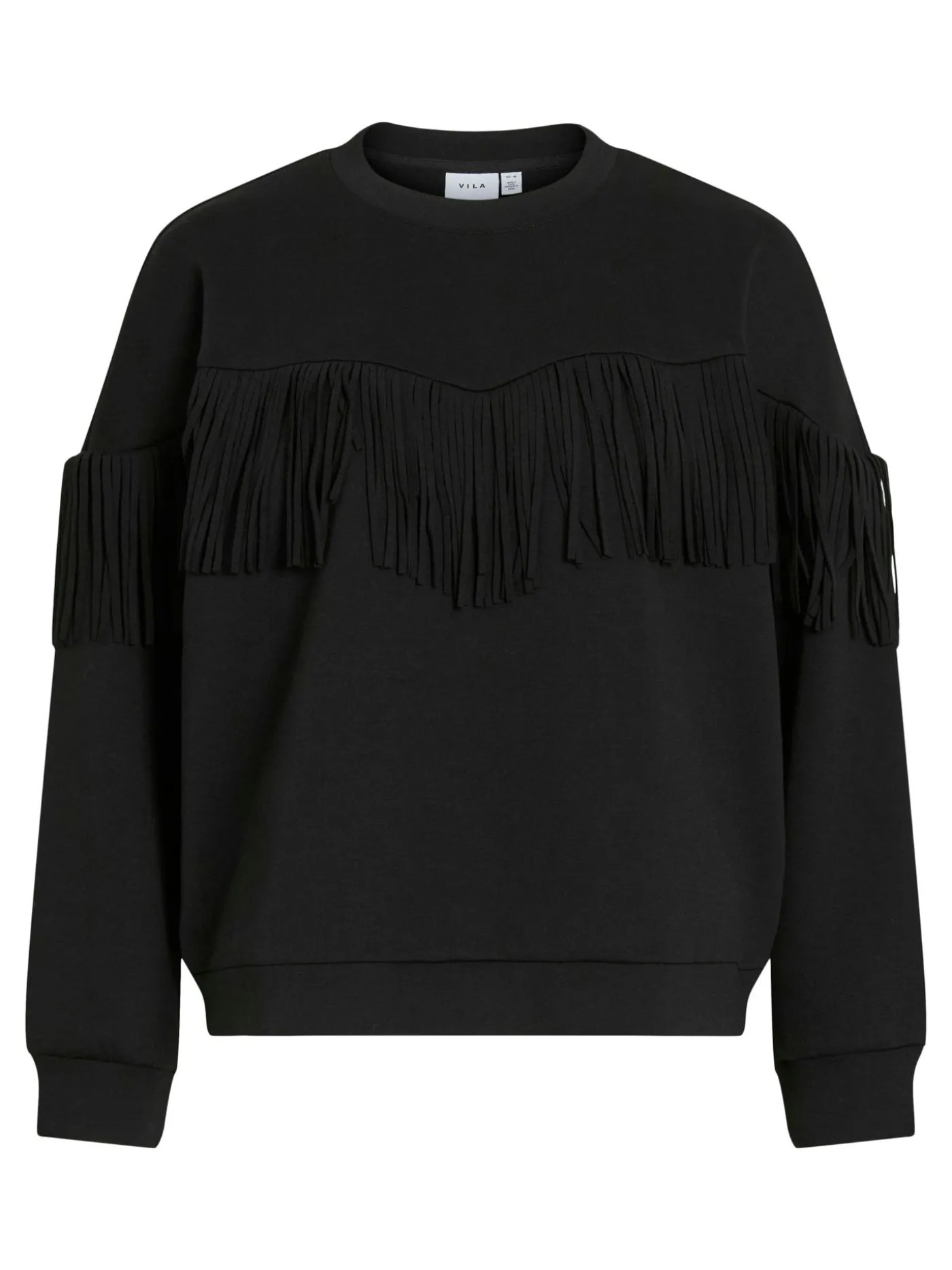 Deze zwarte rechtvallende sweater van Vila voor dames heeft een stoere en moderne uitstraling dankzij de touwtjes over de volledige breedte op borsthoogte. De touwtjes van ongeveer 7 cm lang geven de trui een speels en opvallend detail. Het zachte materiaal en de losse pasvorm zorgen voor optimaal comfort, ideaal voor dagelijks gebruik. Combineer de sweater met jeans of een pantalon voor een casual-chique look.