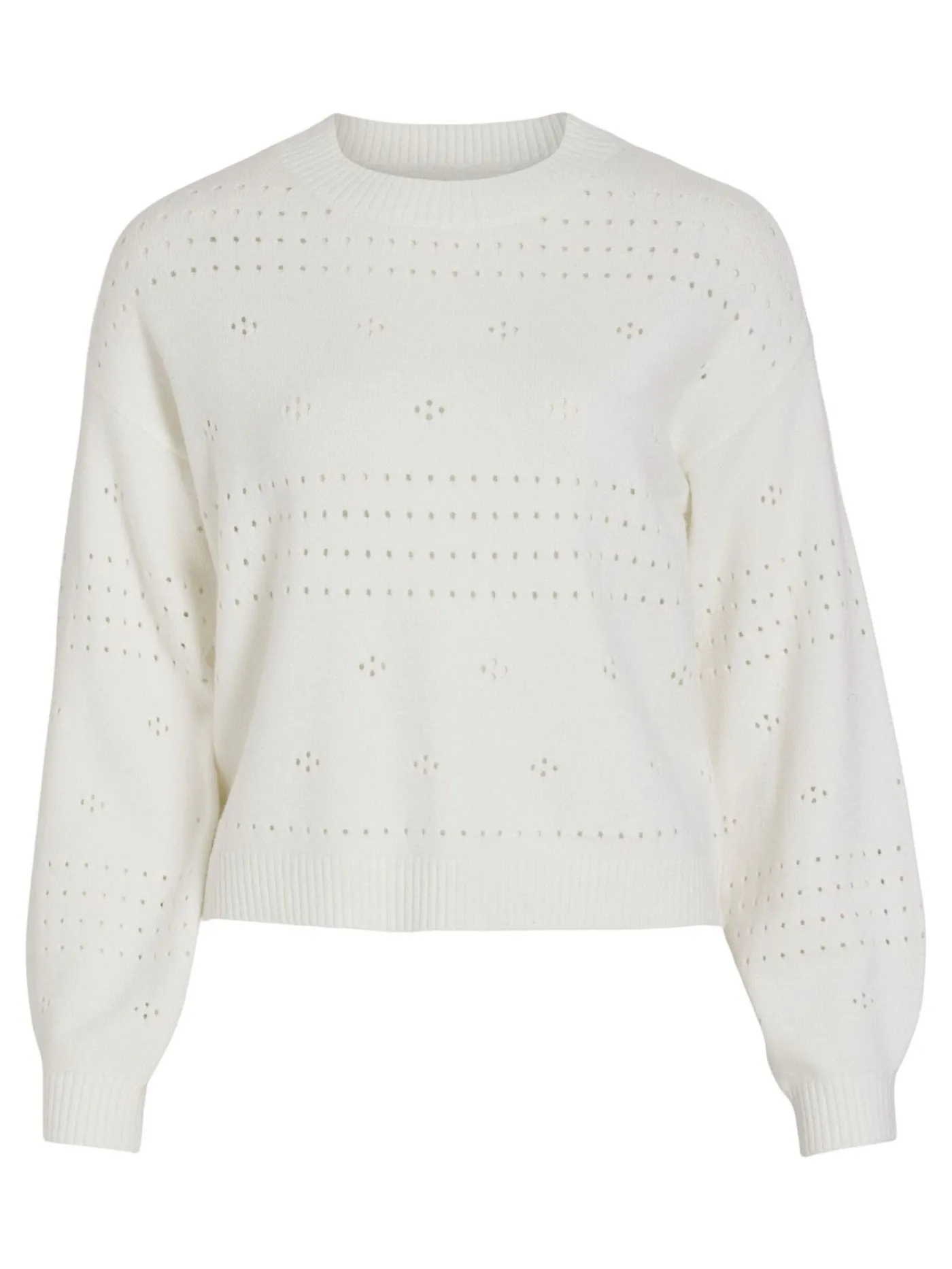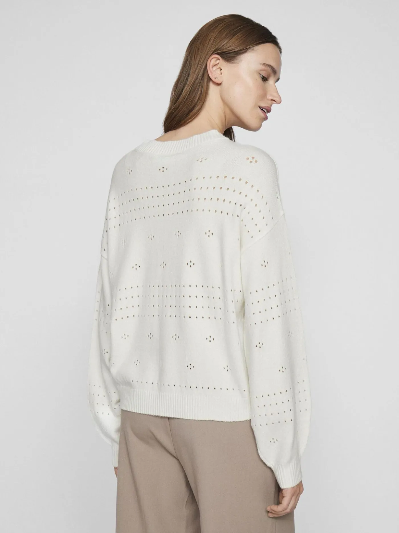 Deze heerlijke comfortabele knit trui van het merk Vila is voorzien van kleine gaatjes die een patroon vormen. De trui heeft lange mouwen en een ronde halslijn. De trui heeft een mooie witte kleur en is gemaakt van een hele zachte stof. Je kunt de trui combineren met een jeans of een mooie pantalon voor een chique look.