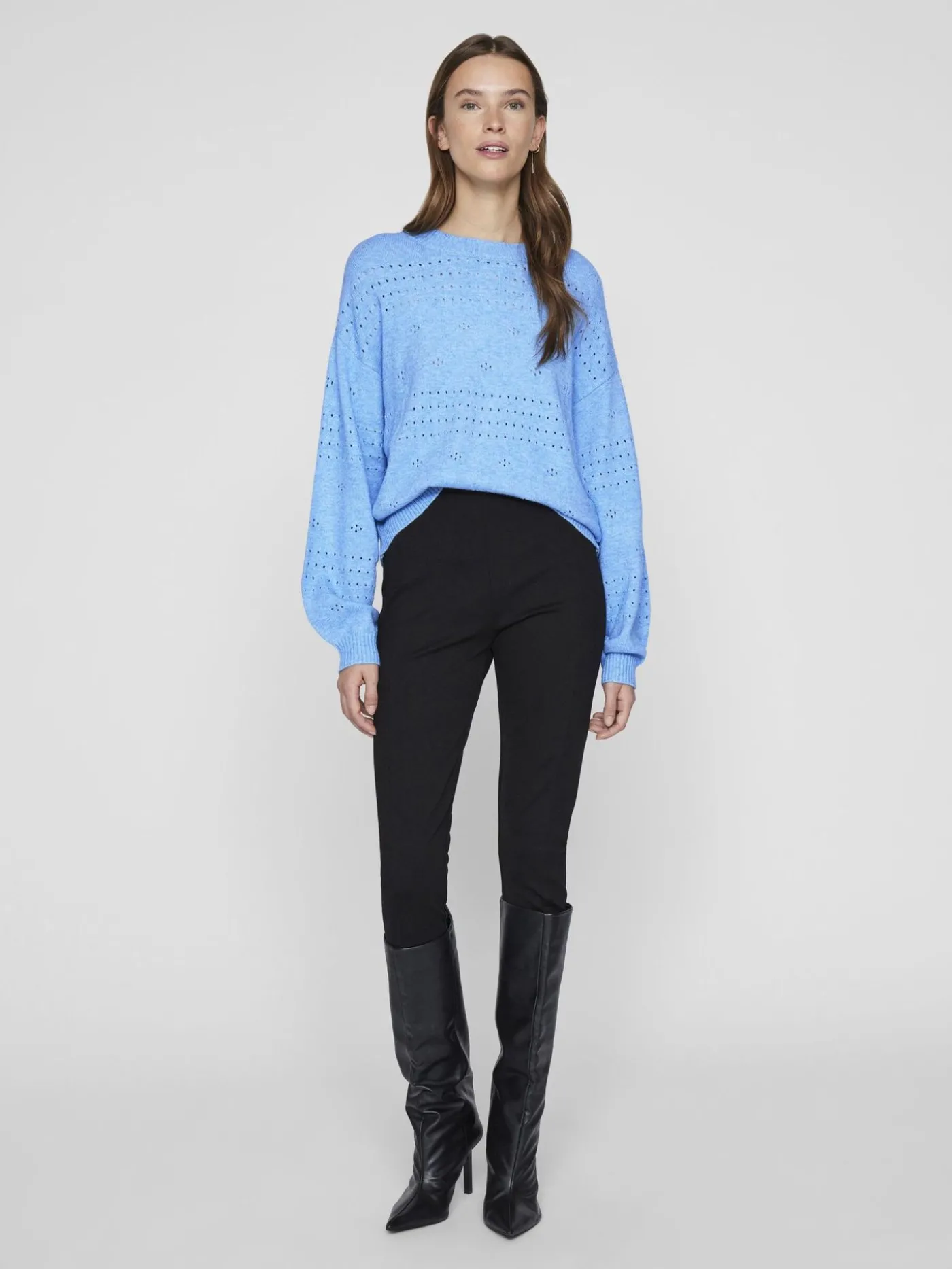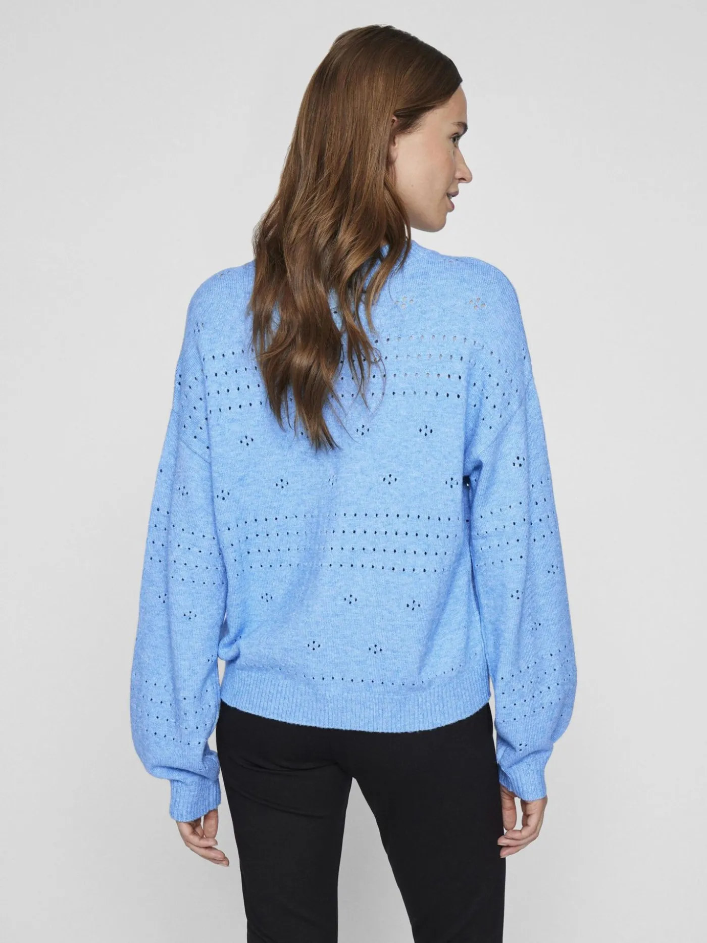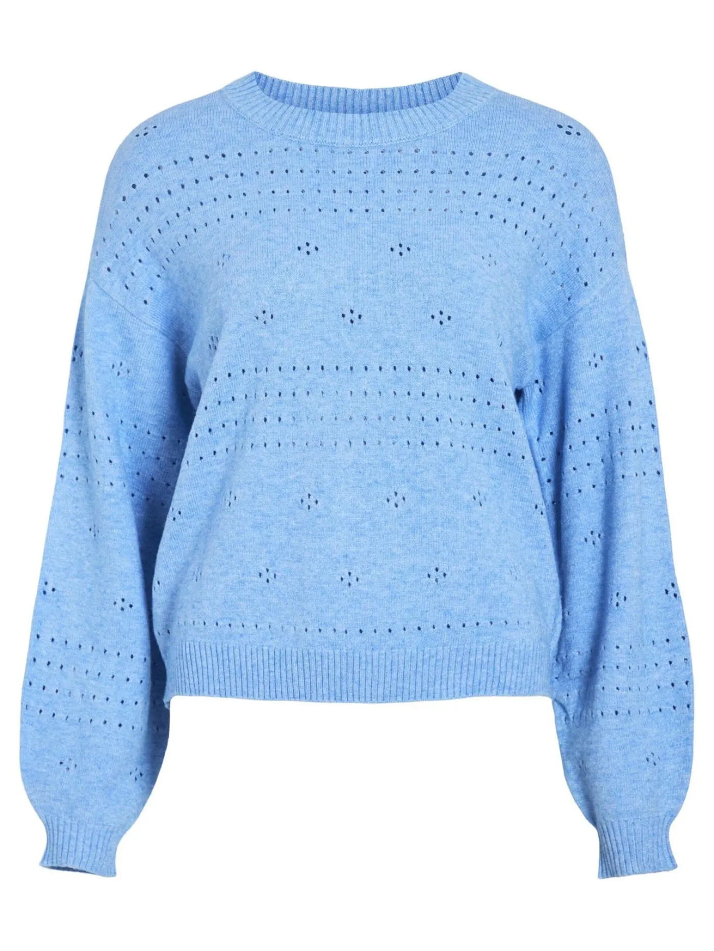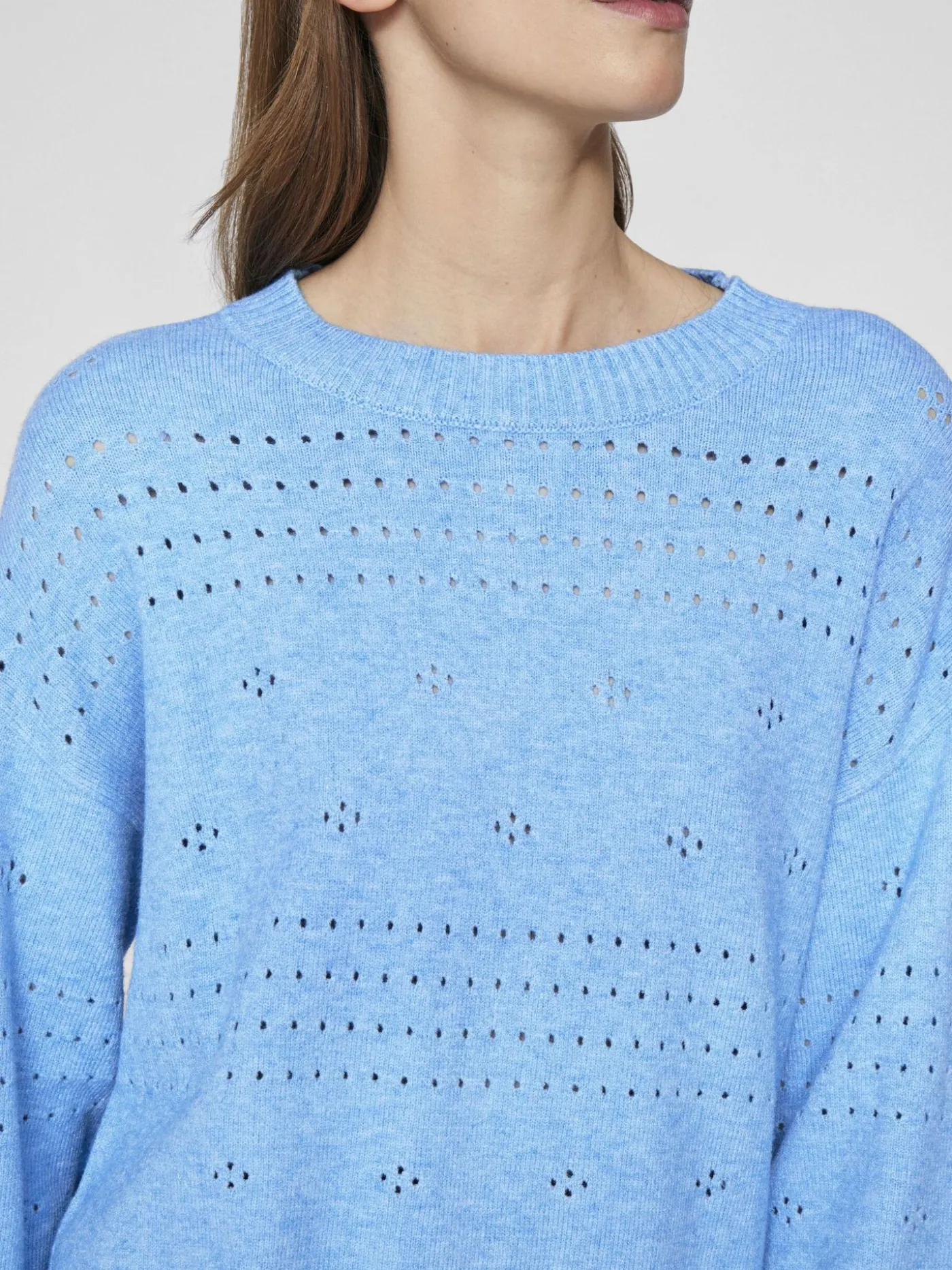 Lichtblauwe knitwear trui van het merk Vila. De trui is voorzien van een gaatjes design en heeft een ronde hals en lange mouwen. Dit item is gemaakt van een zachte stretch stof en ideaal voor de lente. De trui is verkrijgbaar in diverse zachte kleurtjes.