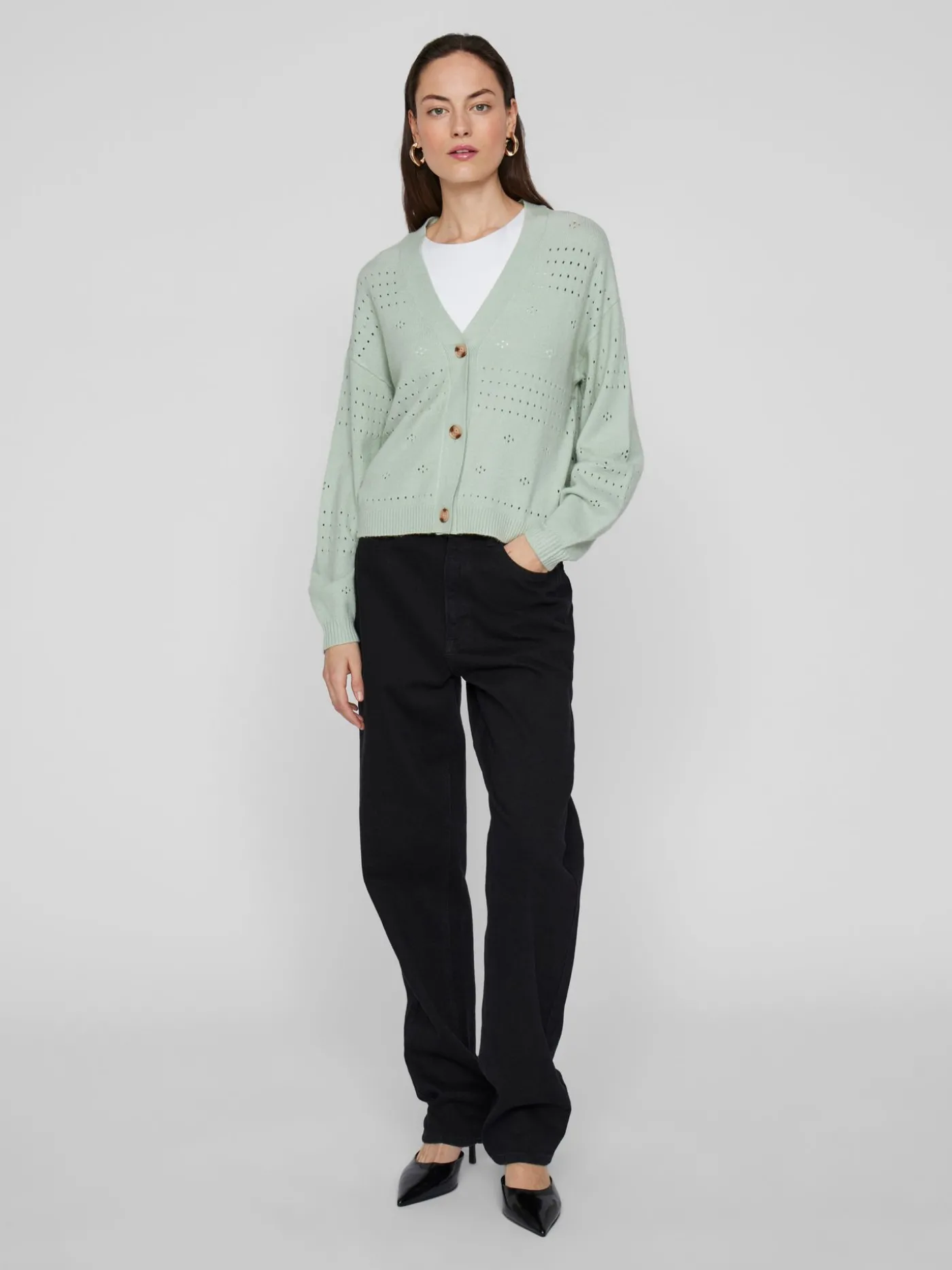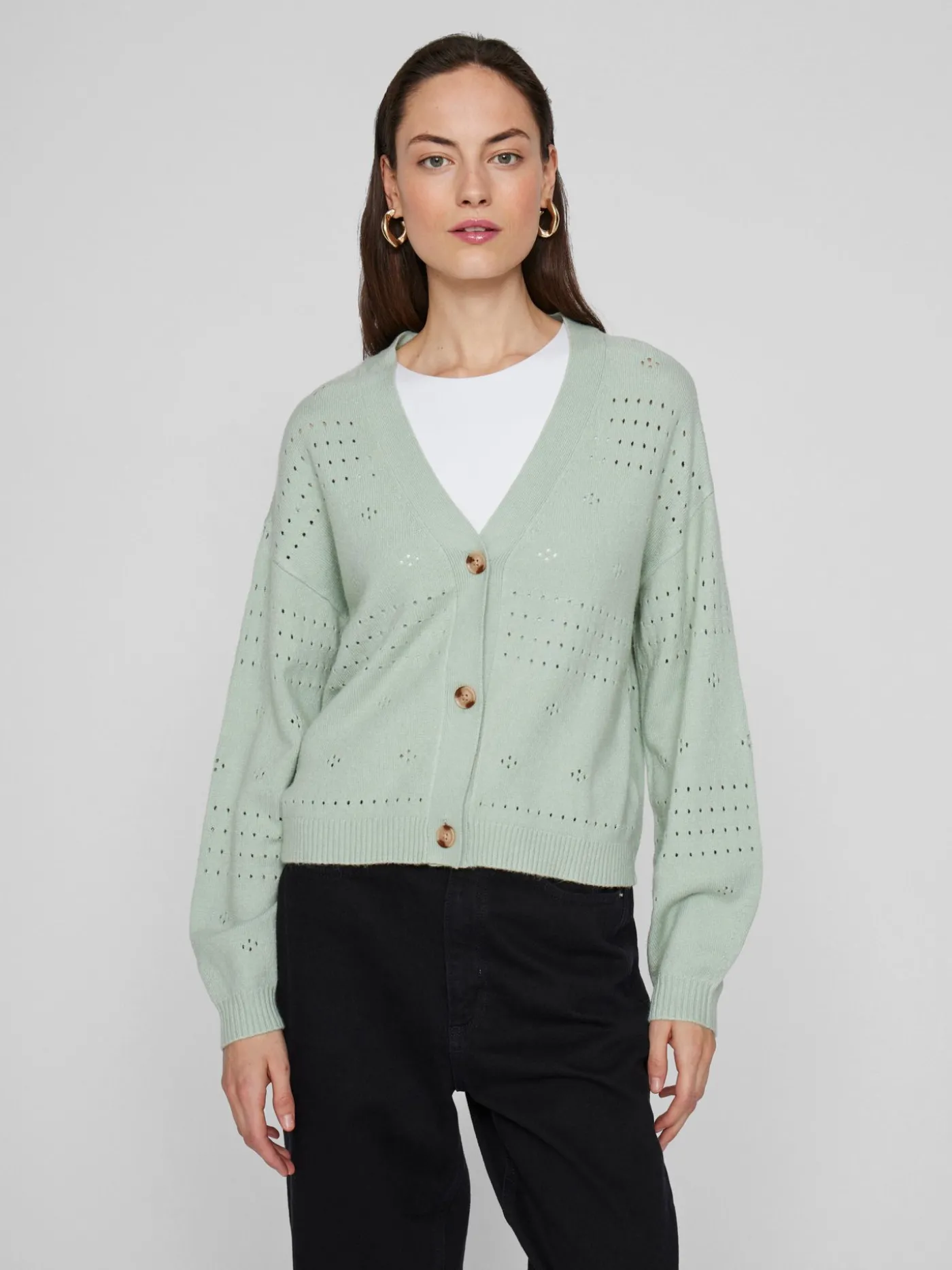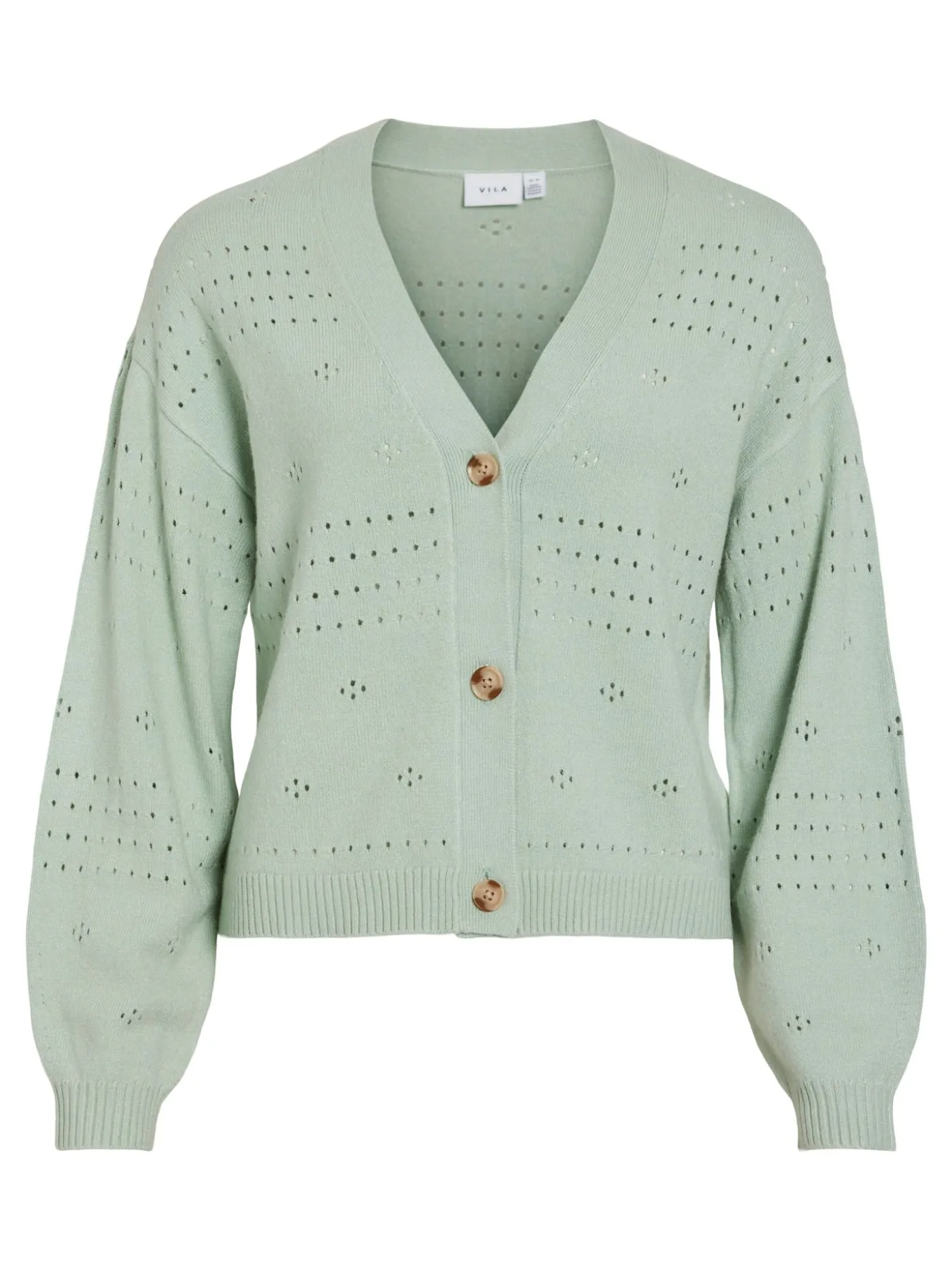 Vest van het merk Vila in een groene kleur. Dit Item heeft lange mouwen, V hals, drie knopen waarmee je het vest kan sluiten en er zit een doorzichtig patroon in de stof.