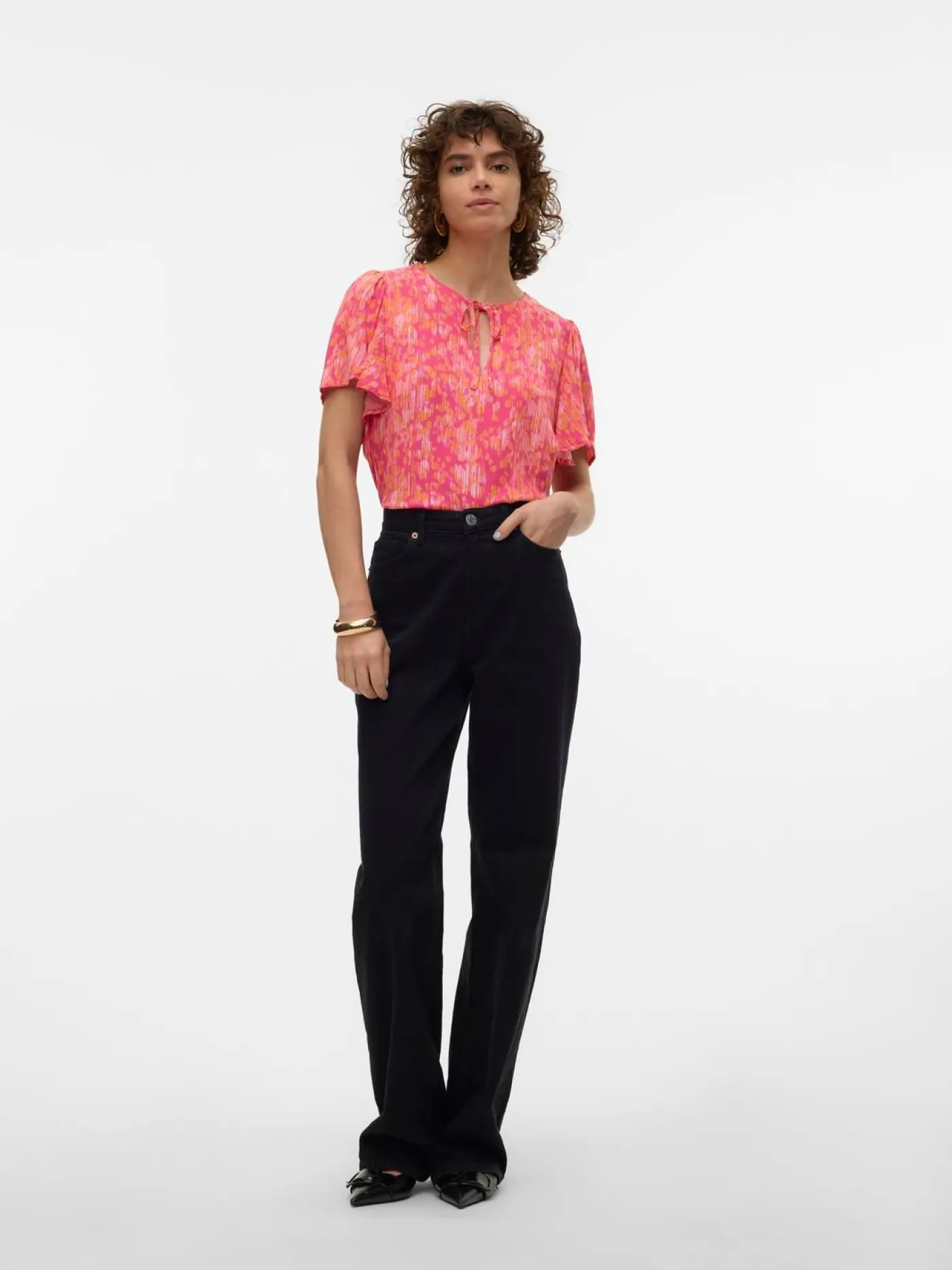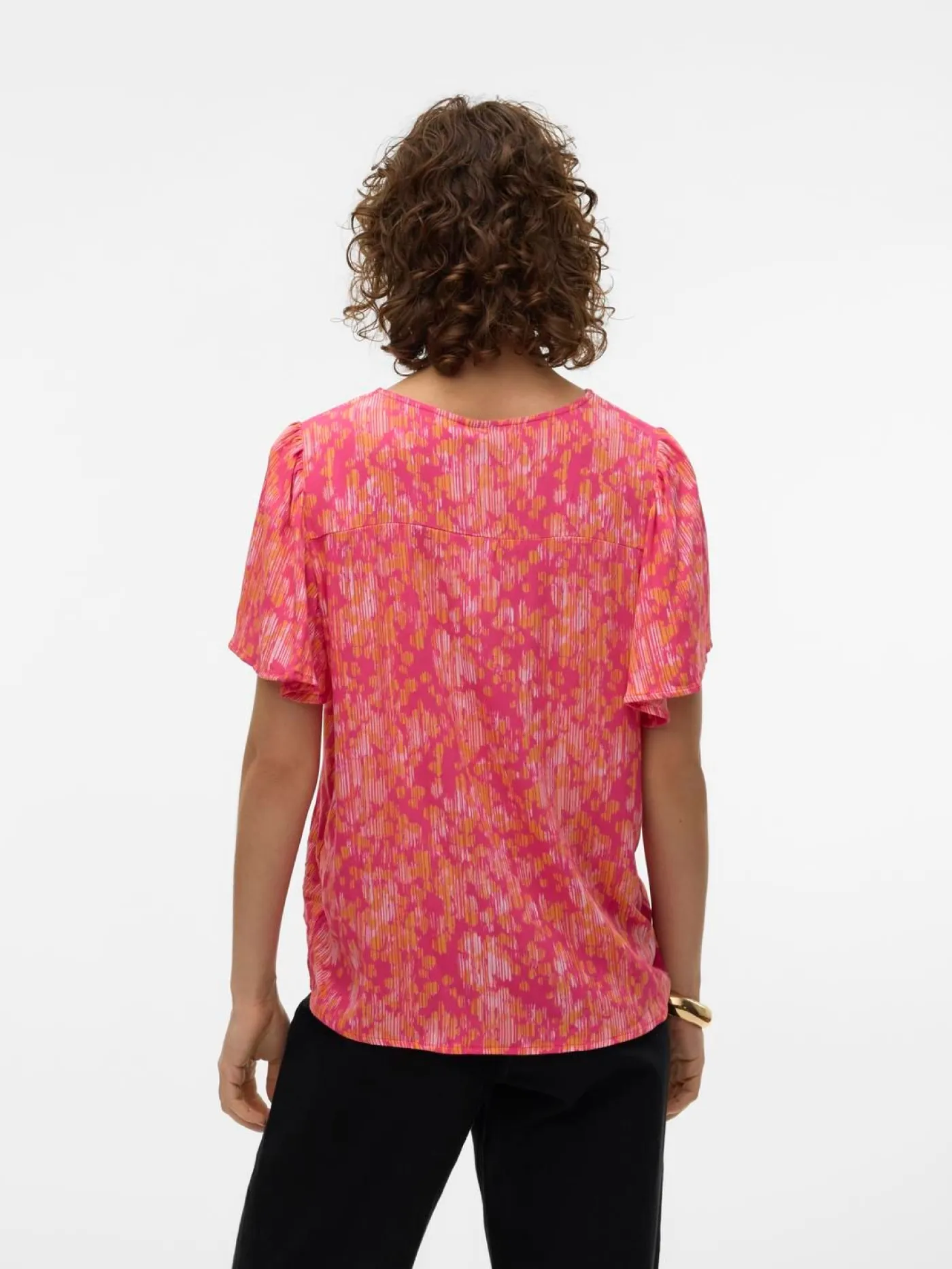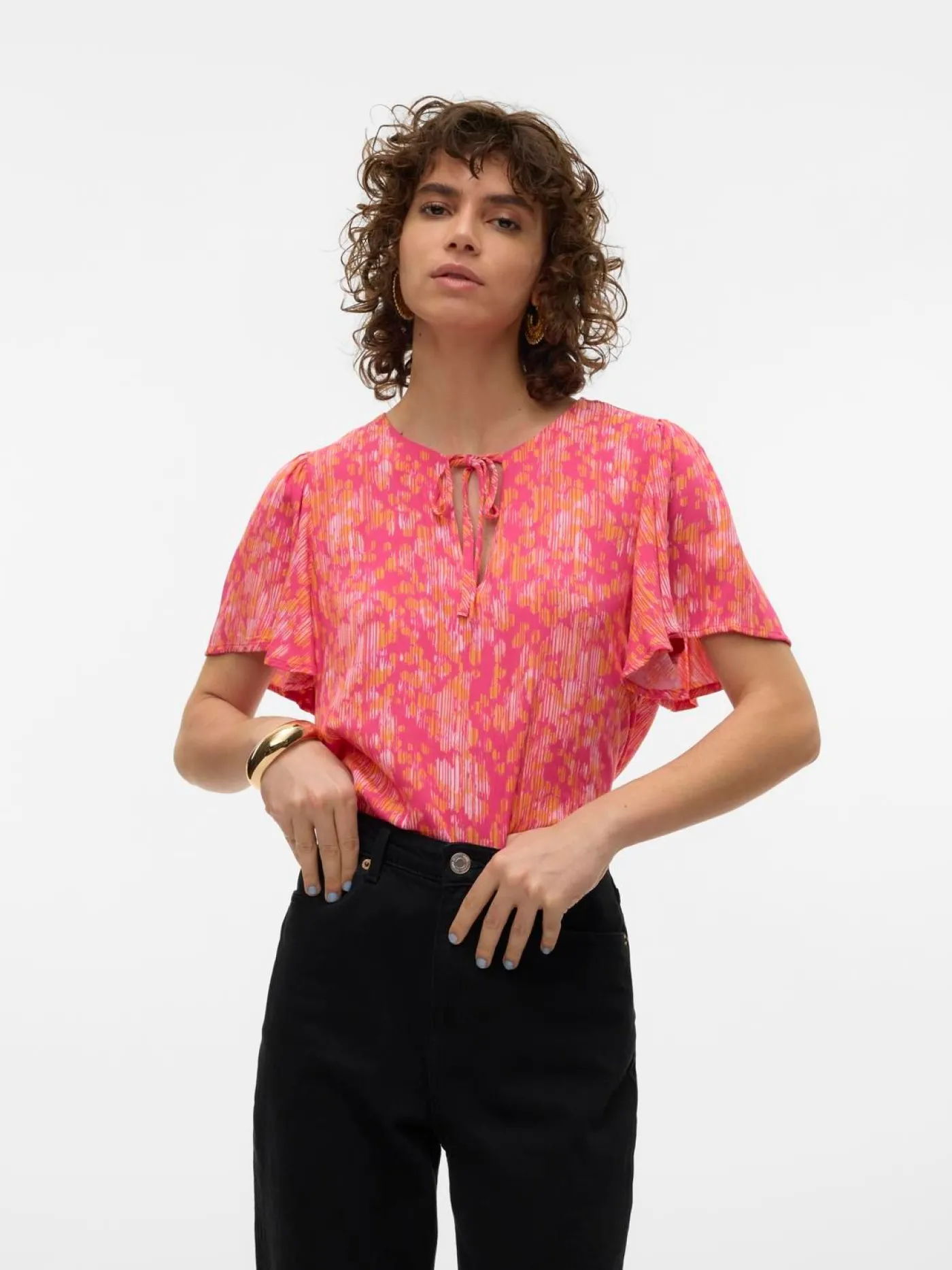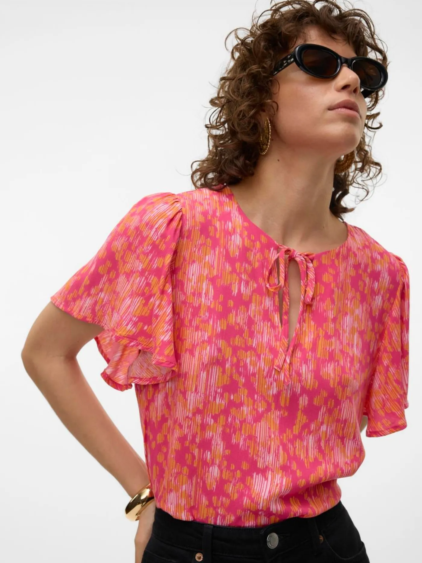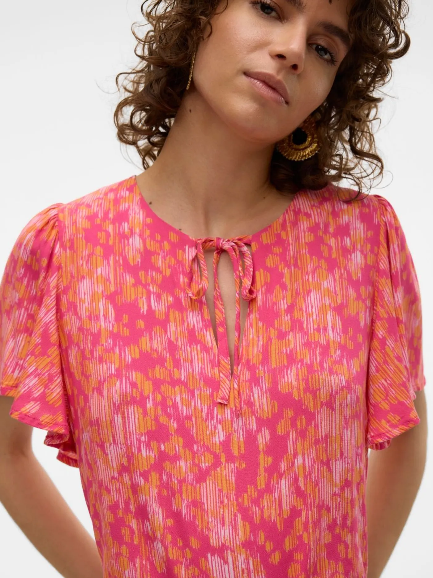 Roze top met all over print van het merk Vero Moda. Dit loose fit shirt heeft korte flair mouwen, een diepe v-hals met strikdetail. Deze top is eindeloos te combineren met diverse items.