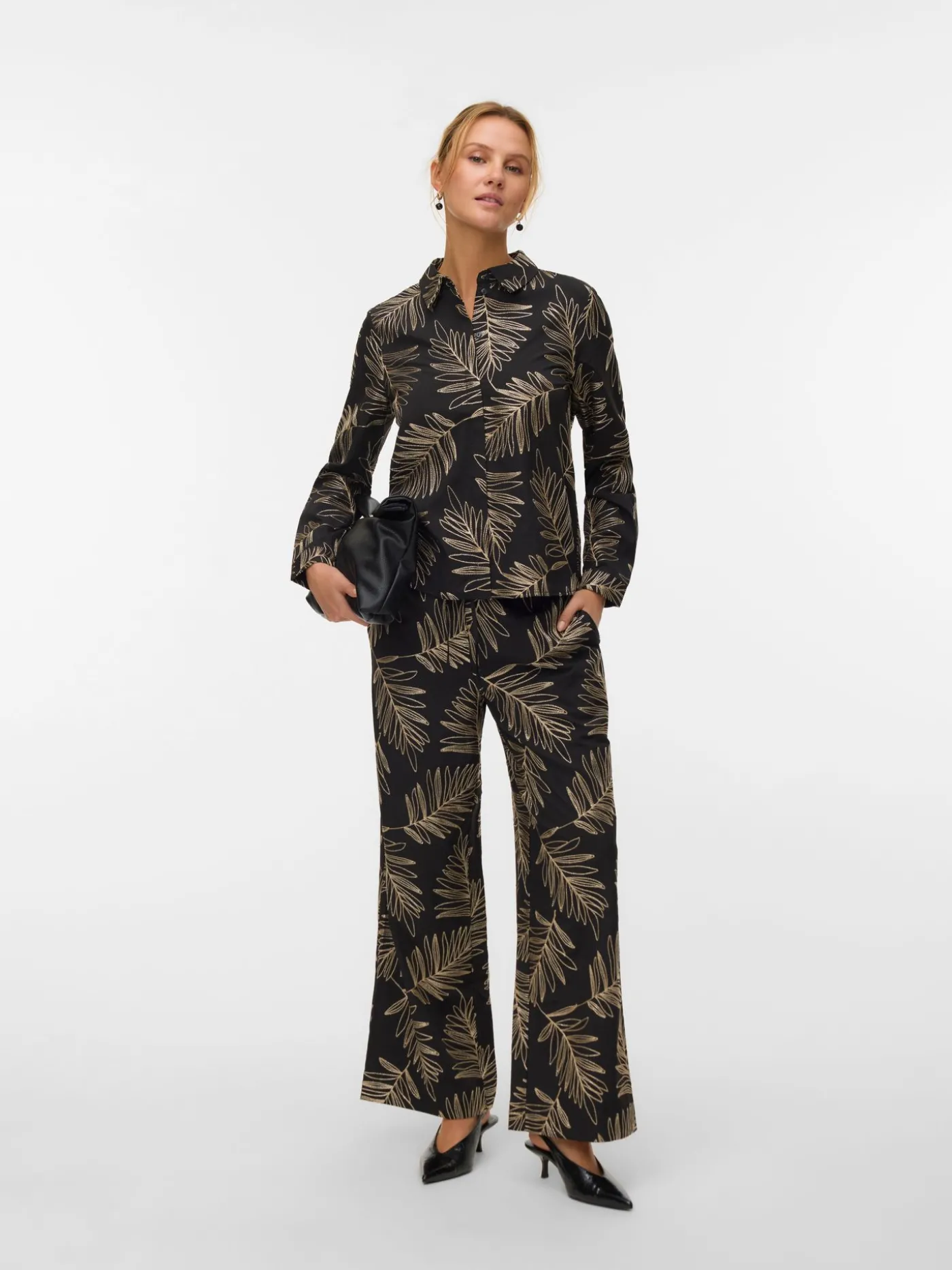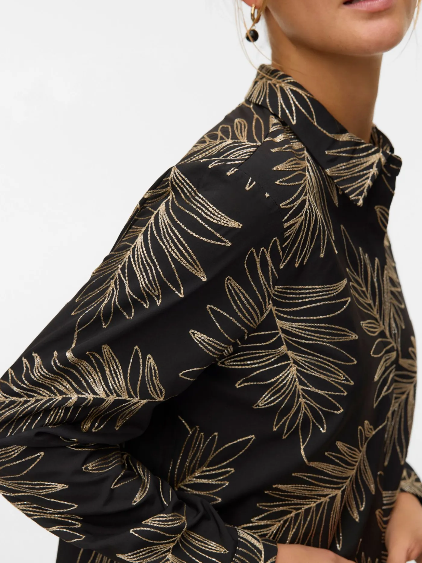 Deze zwarte blouse van Vero Moda valt op door het subtiele patroon van gouden plantbladeren. Het zachte, lichte materiaal voelt prettig aan op de huid en valt losvallend voor een comfortabele pasvorm. De blouse heeft een elegante uitstraling, perfect voor zowel casual als chique combinaties. Combineer hem met een jeans, rok of pantalon voor een stijlvolle outfit. Een veelzijdige toevoeging aan je garderobe met een unieke, natuurlijke touch.
