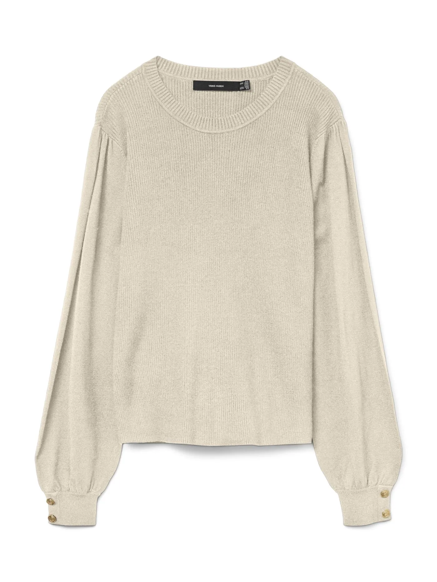 Deze verfijnde trui in een zachte, lichtbeige tint is een elegante aanvulling op elke garderobe. Het model is vervaardigd uit een soepel en comfortabel fijngebreid materiaal dat een luxueuze uitstraling geeft. De trui heeft een klassieke ronde halslijn en subtiel verlaagde schouders, wat zorgt voor een moderne en ontspannen pasvorm.De lange, licht geplooide mouwen creëren een vrouwelijke en sierlijke look, terwijl de manchetten zijn afgewerkt met twee goudkleurige knoopjes voor een stijlvolle, verfijnde touch. Dankzij de rechte pasvorm laat deze trui zich moeiteloos combineren met zowel casual als geklede outfits.