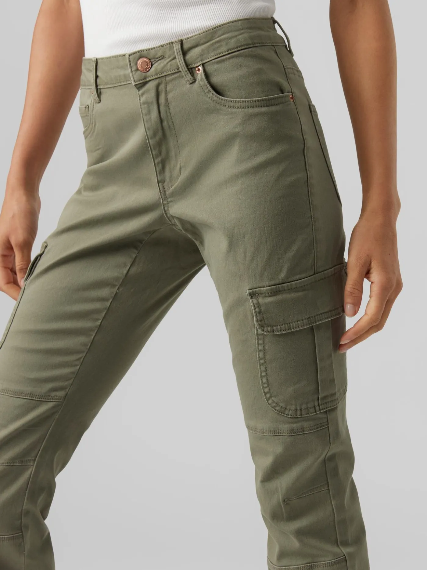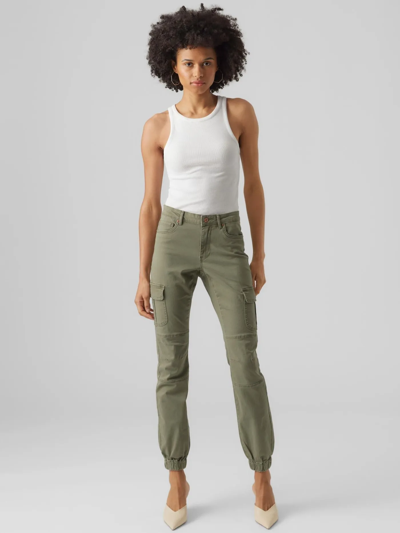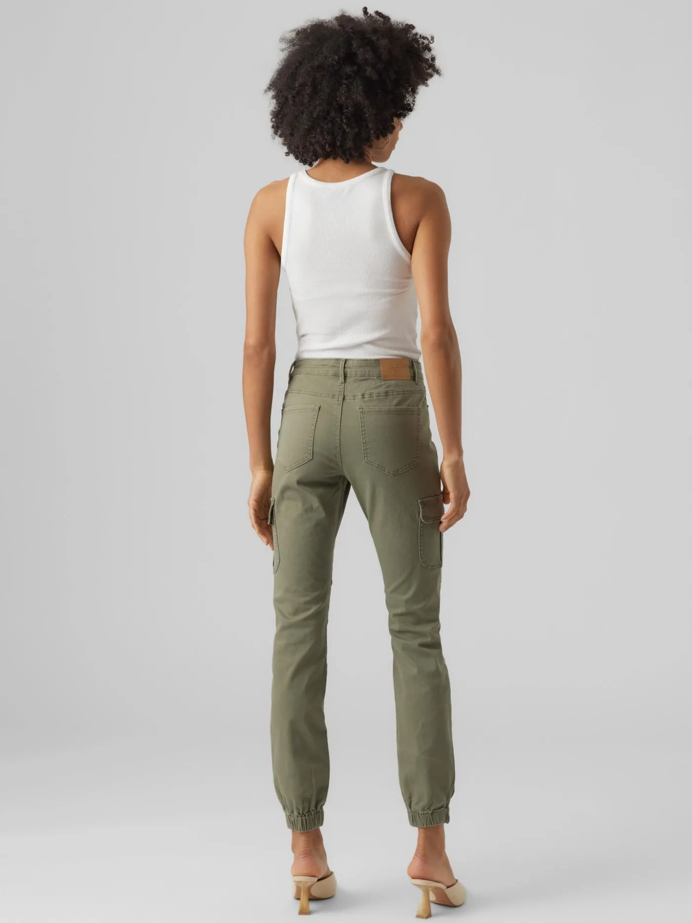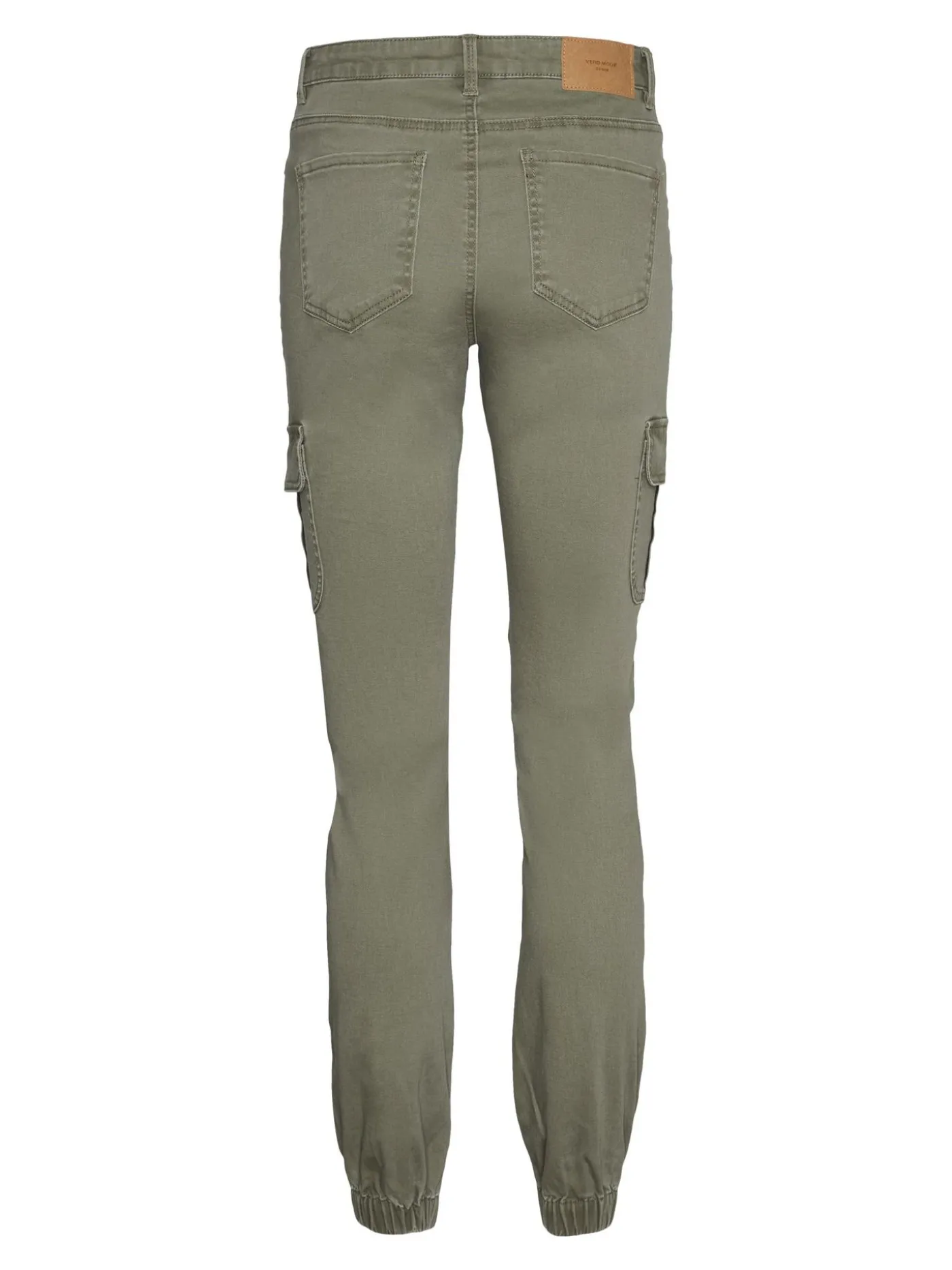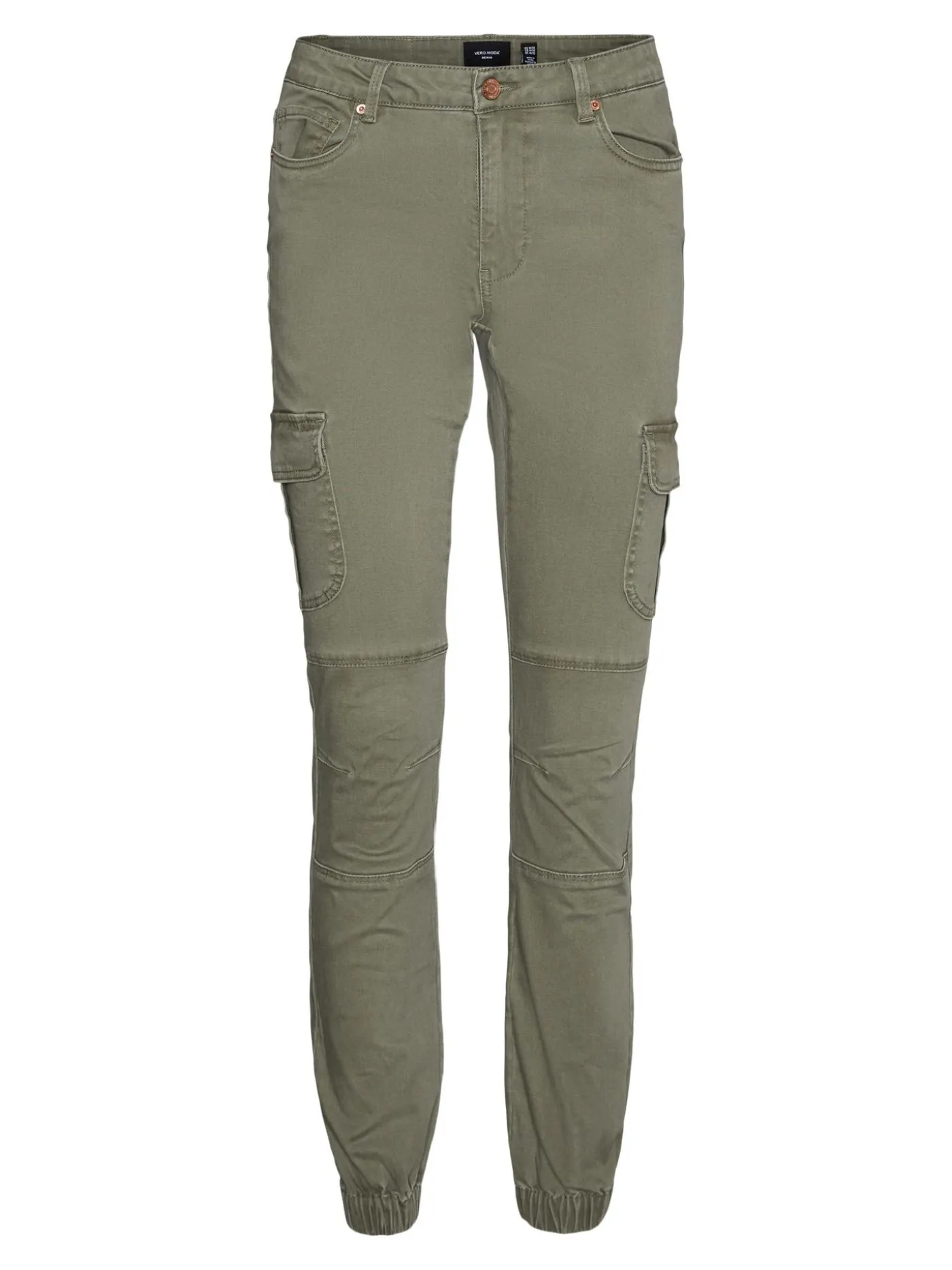 Een groene cargo pants van de Vero Moda die heerlijk zit. Hij valt als een slim fit jeans. De broek bevat achter- en voorzakken en een muntzakje. De pijpen aan de onderkant zijn elastisch. Een kledingstuk dat overal bij past.
