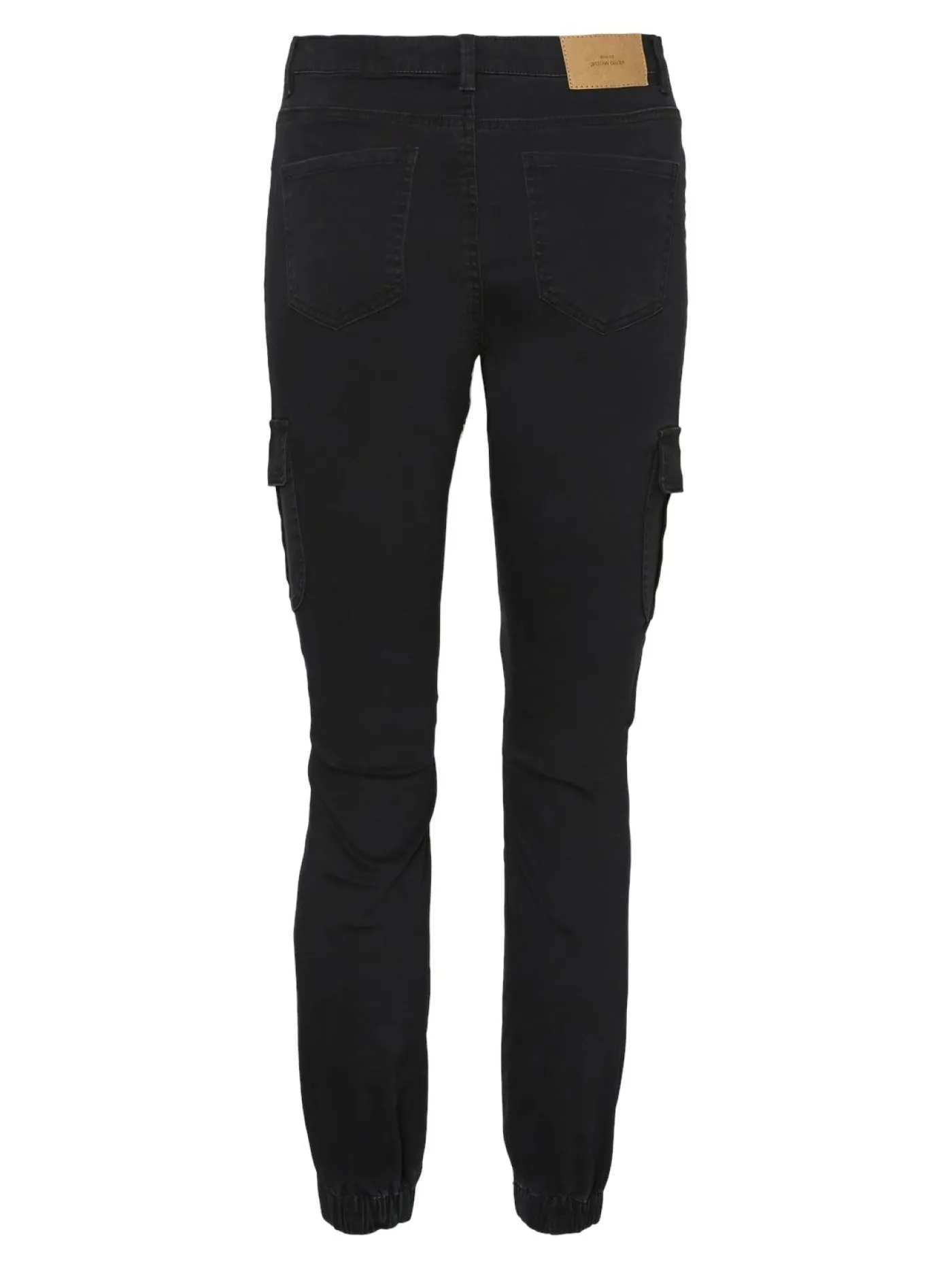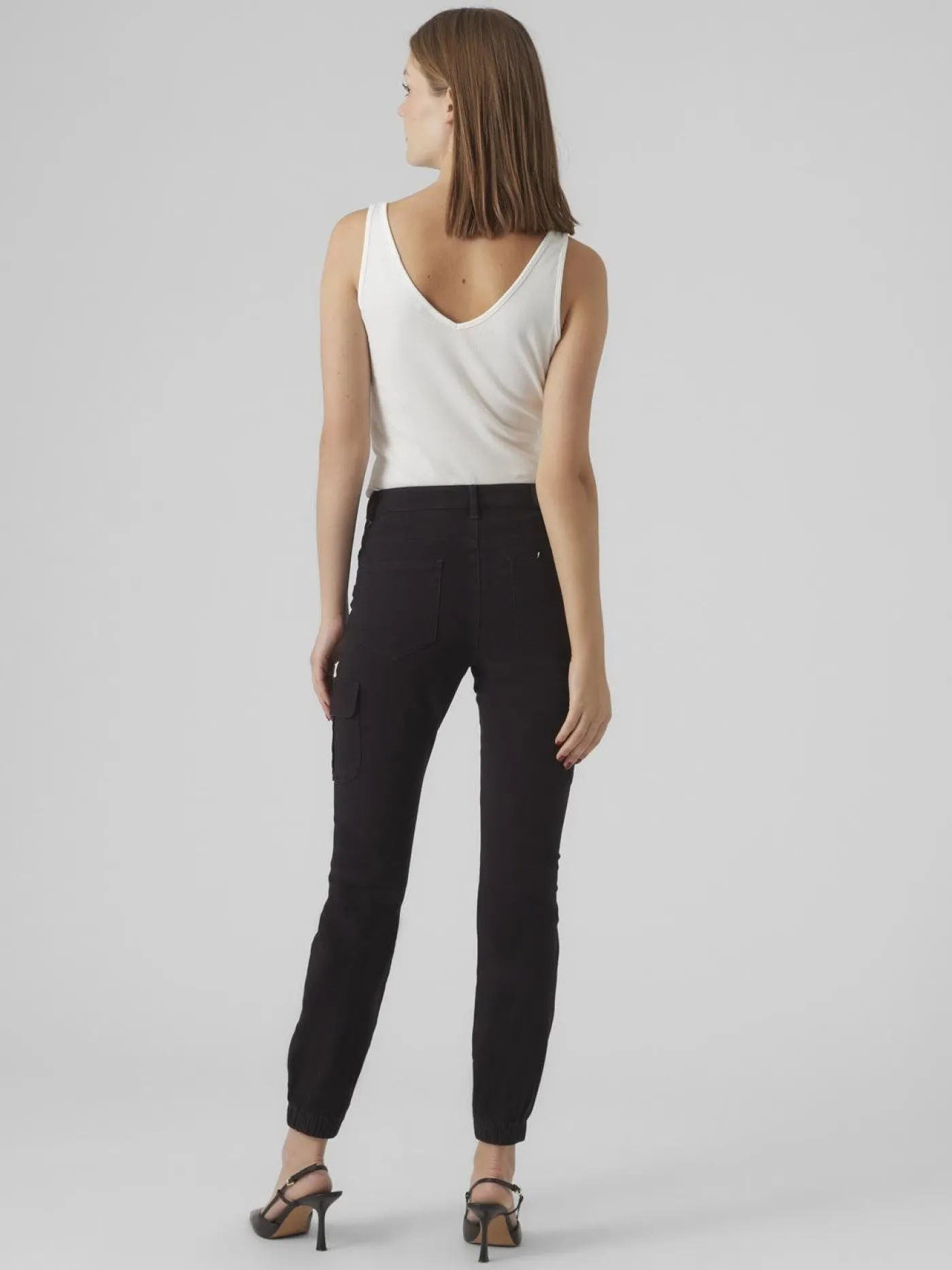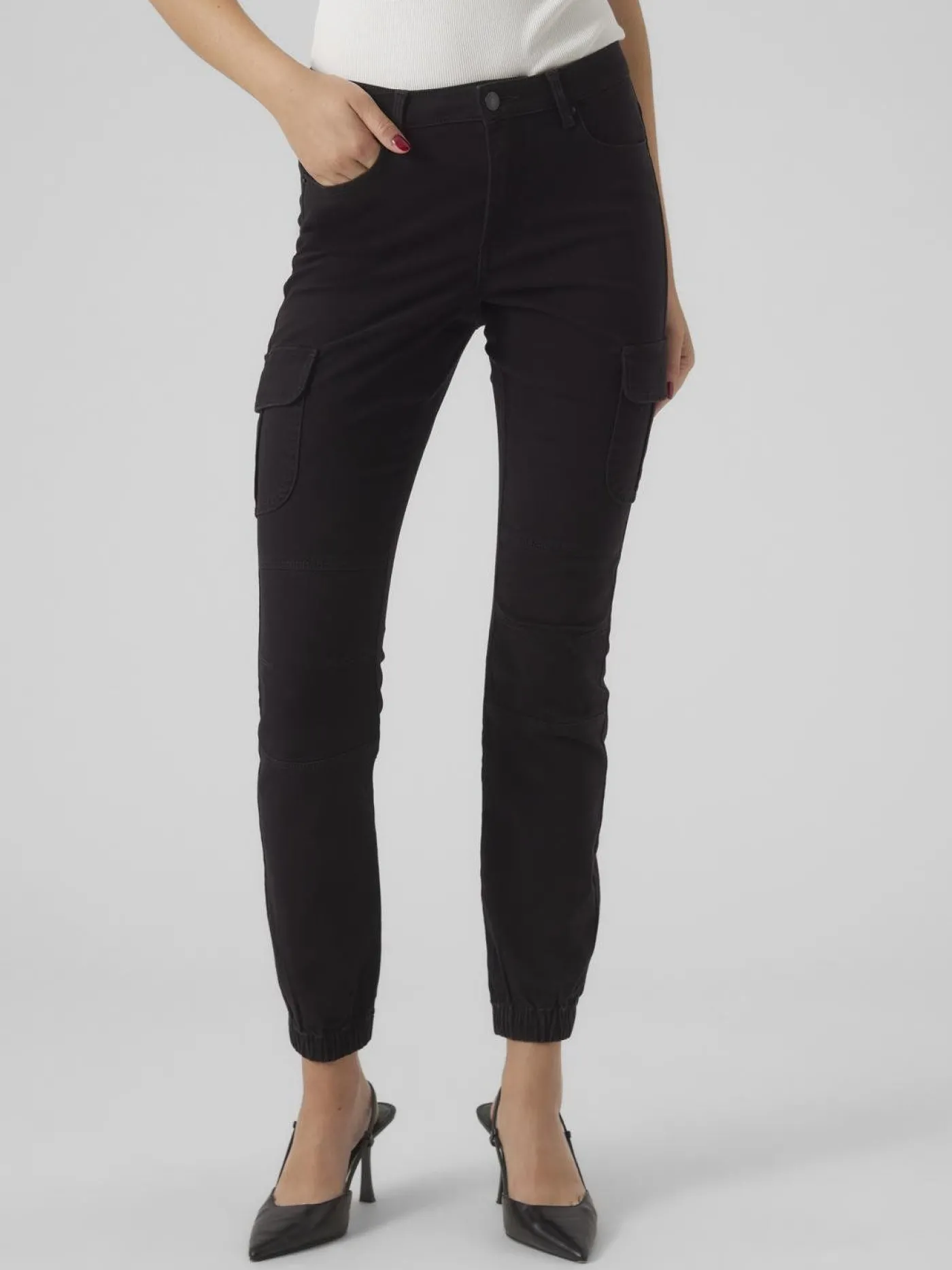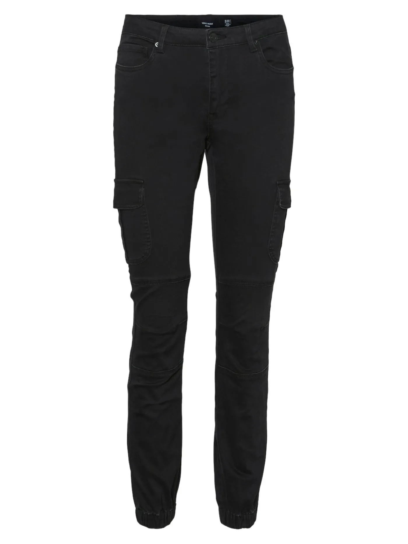 Een zwarte cargo pants van de Vero Moda die heerlijk zit. Hij valt als een slim fit jeans. De broek bevat achter- en voorzakken en een muntzakje. De pijpen aan de onderkant zijn elastisch. Een kledingstuk dat overal bij past.