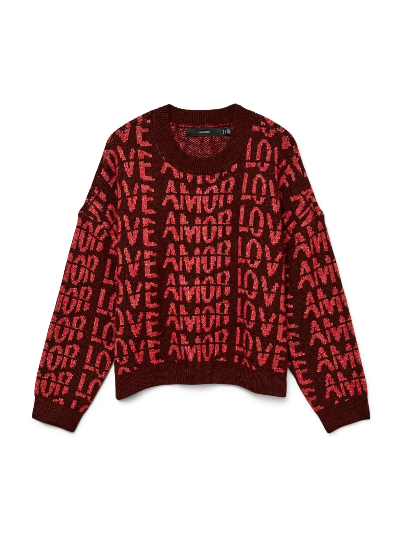 Deze opvallende gebreide trui is een echte eyecatcher voor het najaar en de winter. De warme bordeauxrode basiskleur wordt gecombineerd met een speels patroon waarin de woorden “LOVE” en “AMOR” in contrasterende roodtinten herhaald worden. Dit zorgt voor een levendige, grafische uitstraling die elke outfit een vrolijke en moderne twist geeft.De trui heeft een comfortabele rechtvallende pasvorm. De ronde hals en geribde boorden aan de mouwen en zoom zorgen voor een mooie afwerking en houden de vorm van het kledingstuk perfect in balans. De trui is ook verkrijgbaar in zwart/wit