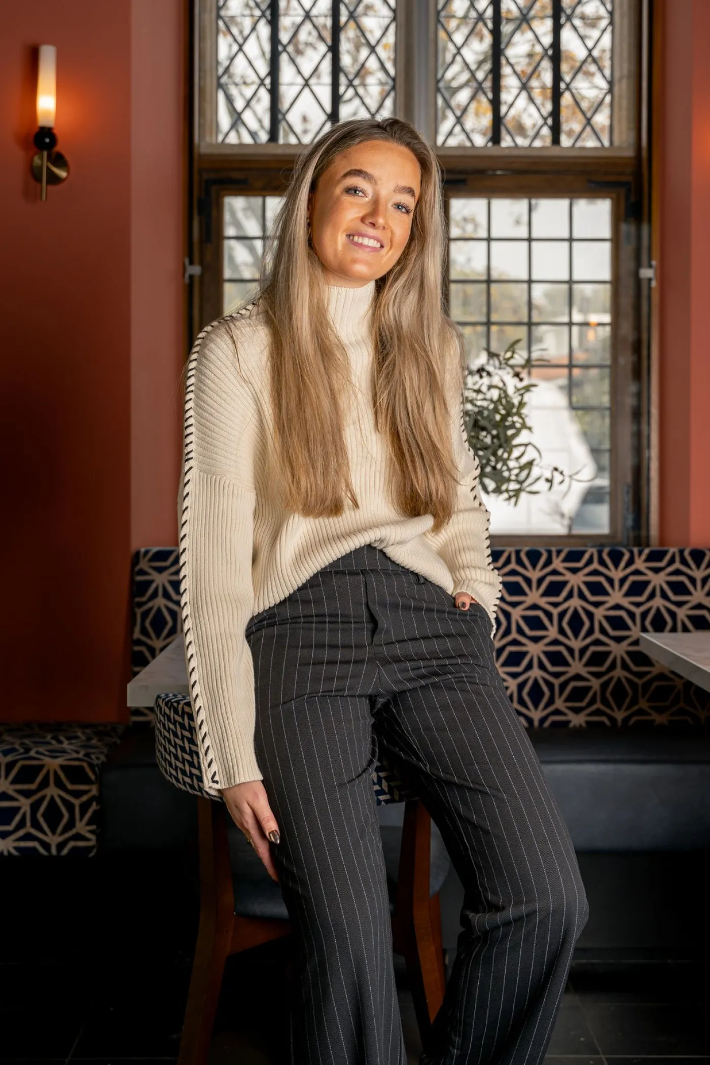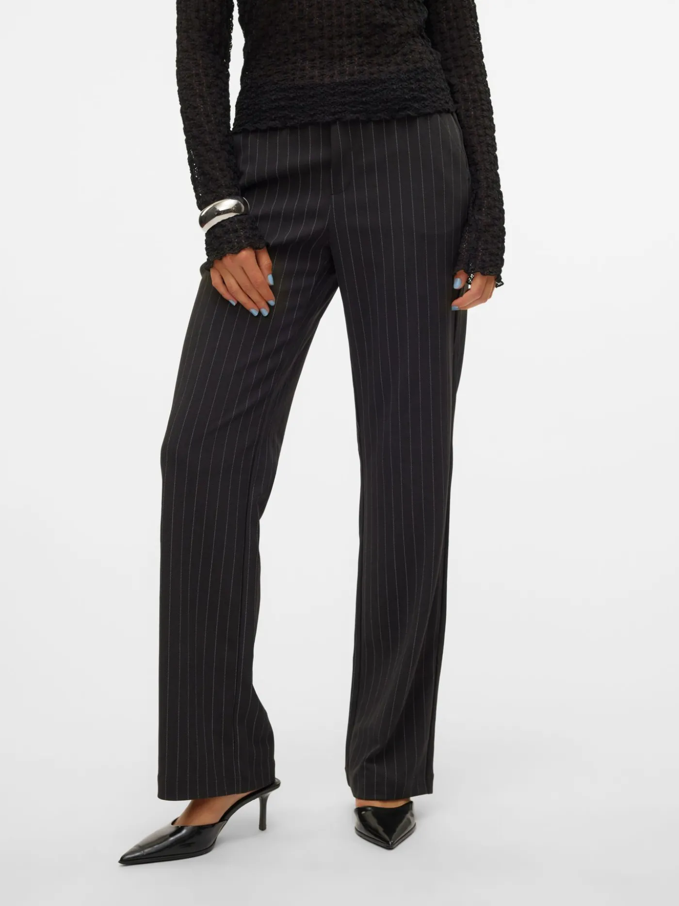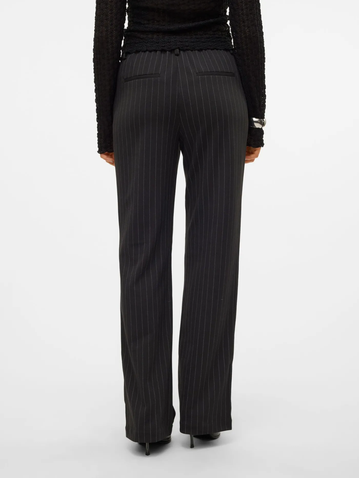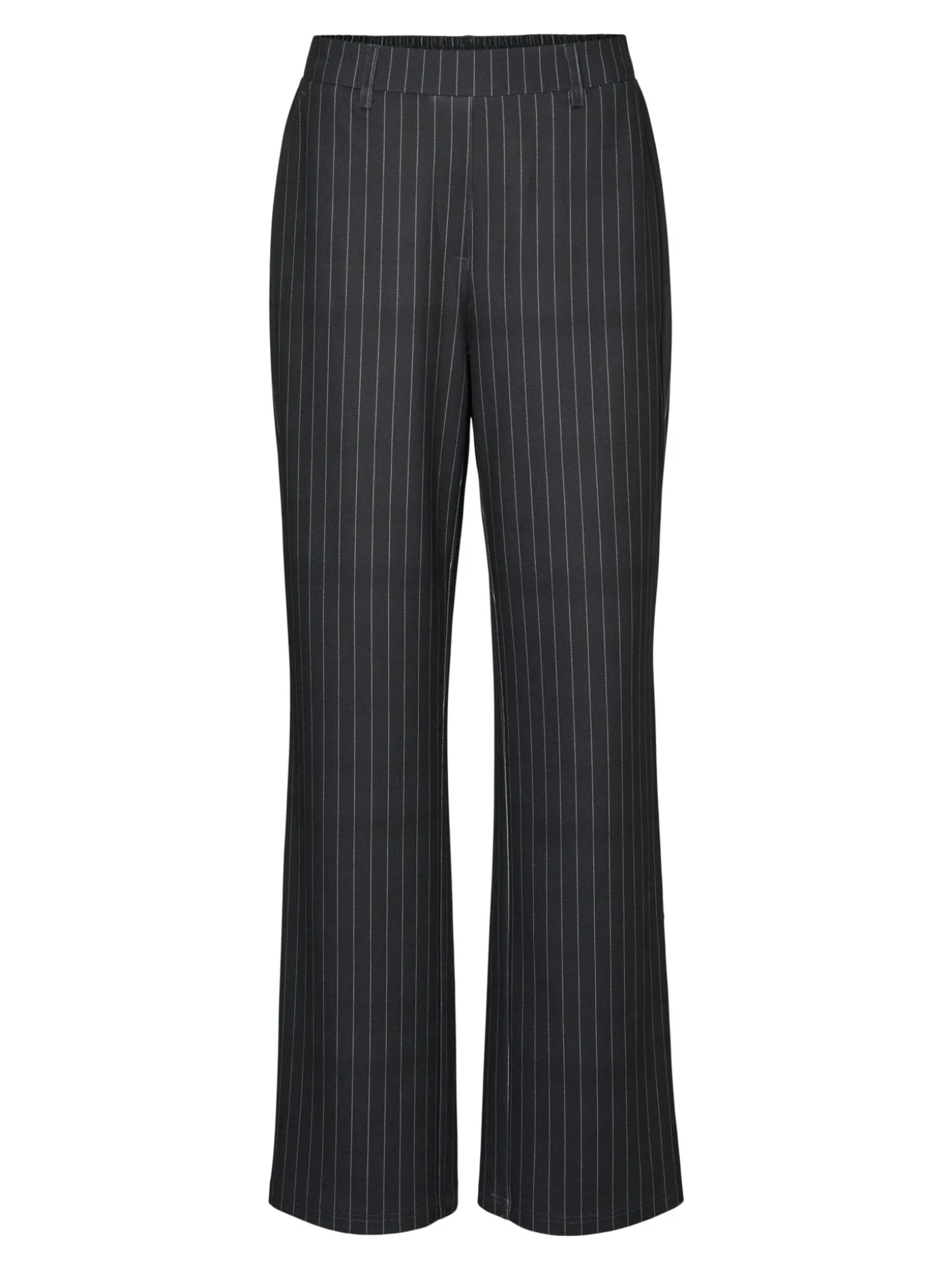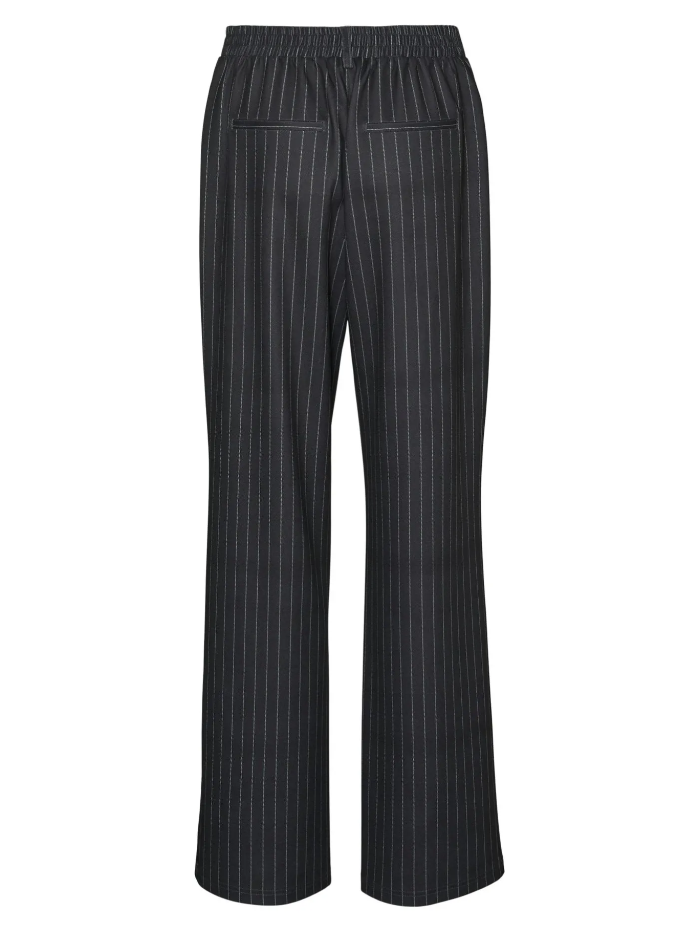Deze zwarte pantalon met witte krijtstreep is van het merk Vero Moda. Het is een pantalon met een elastische tailleband, steekzakken aan de voorkant en rechte broekspijpen.