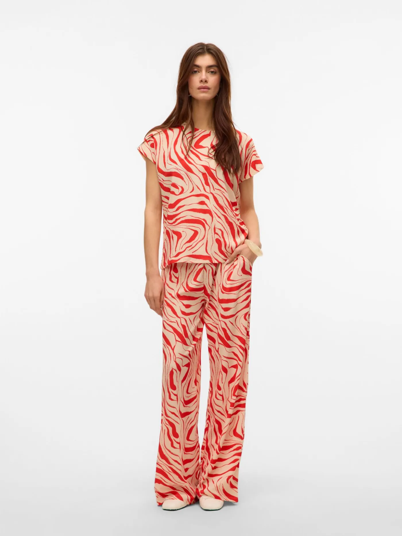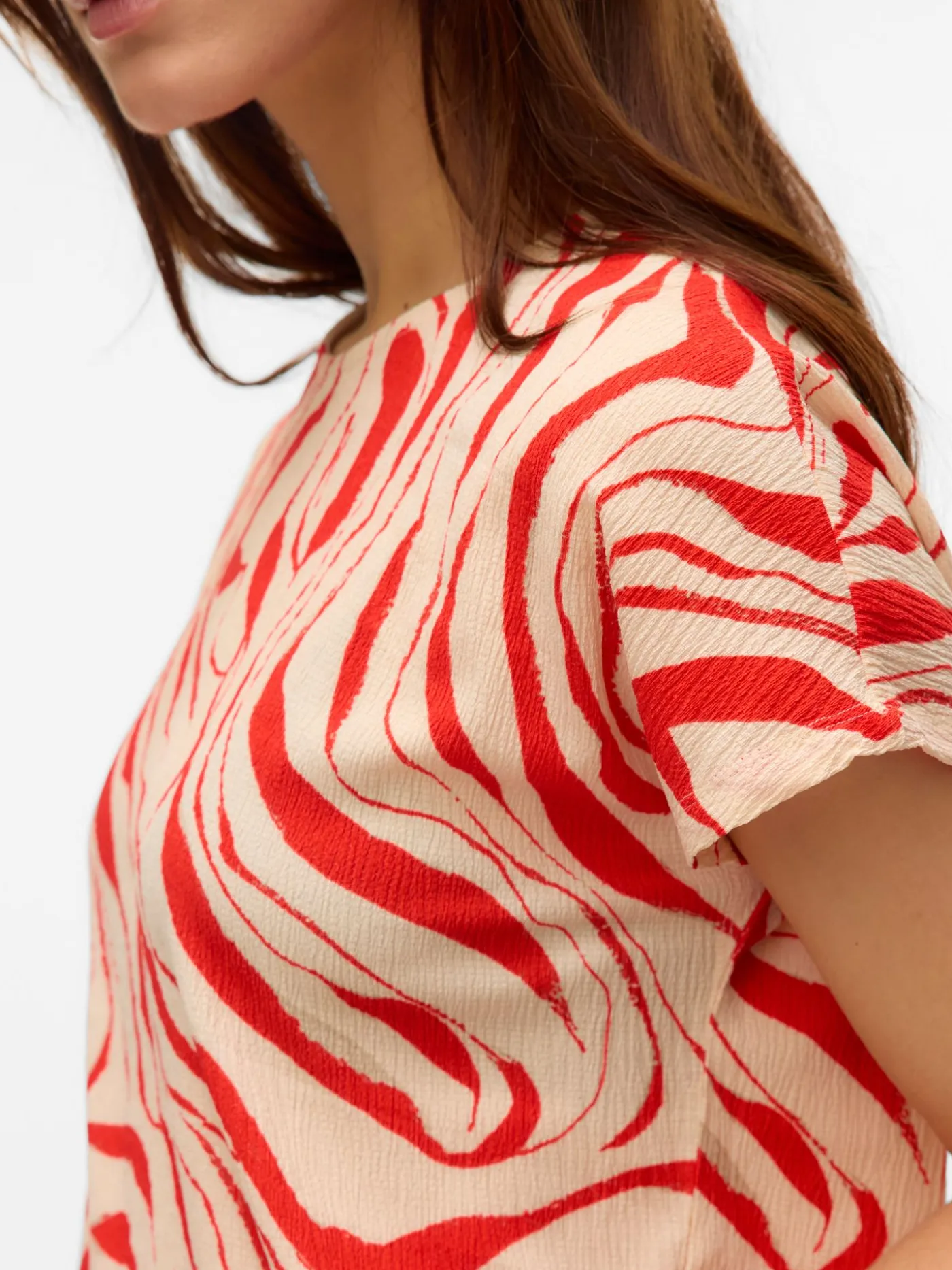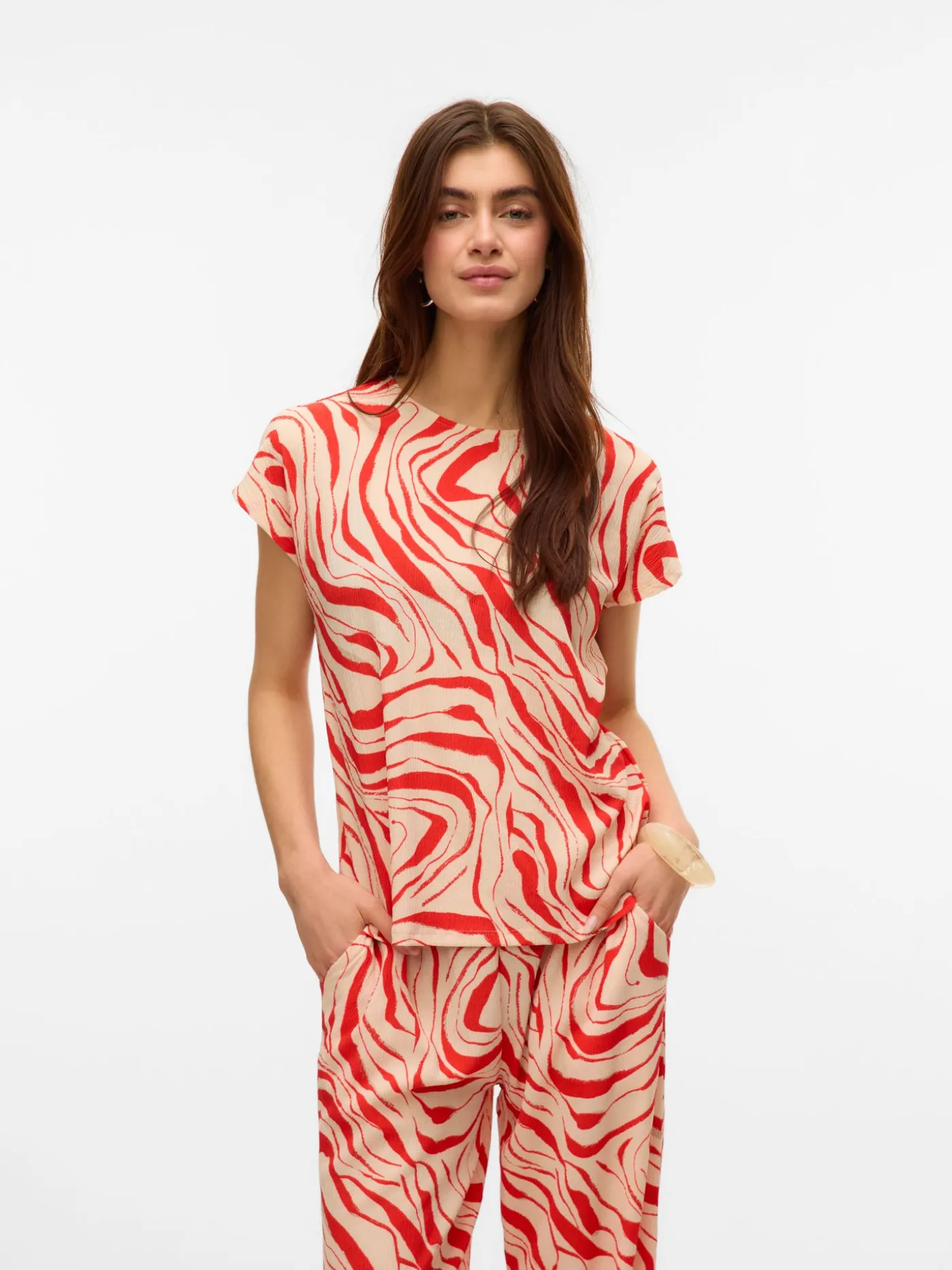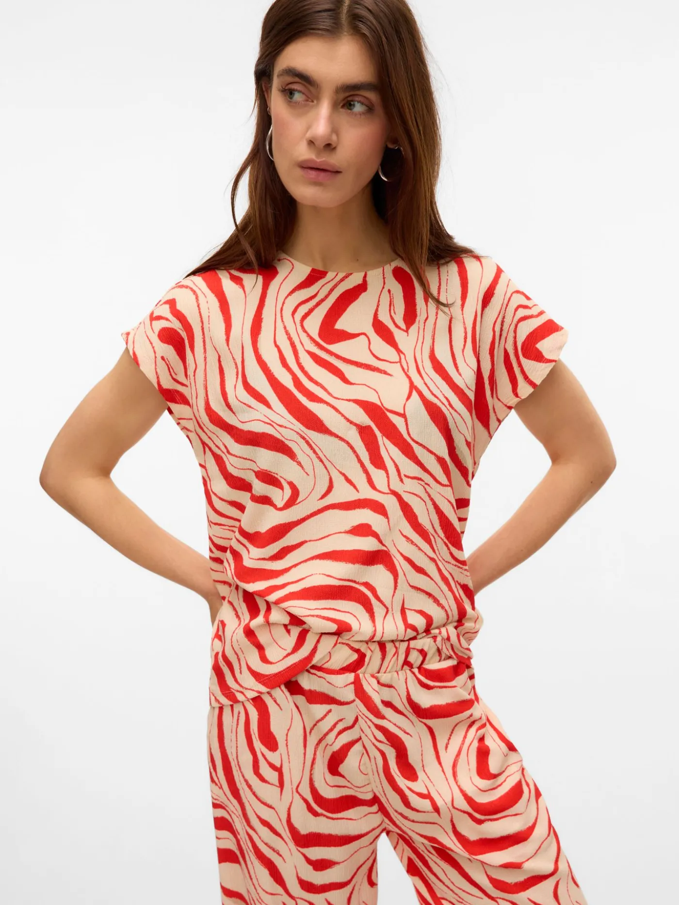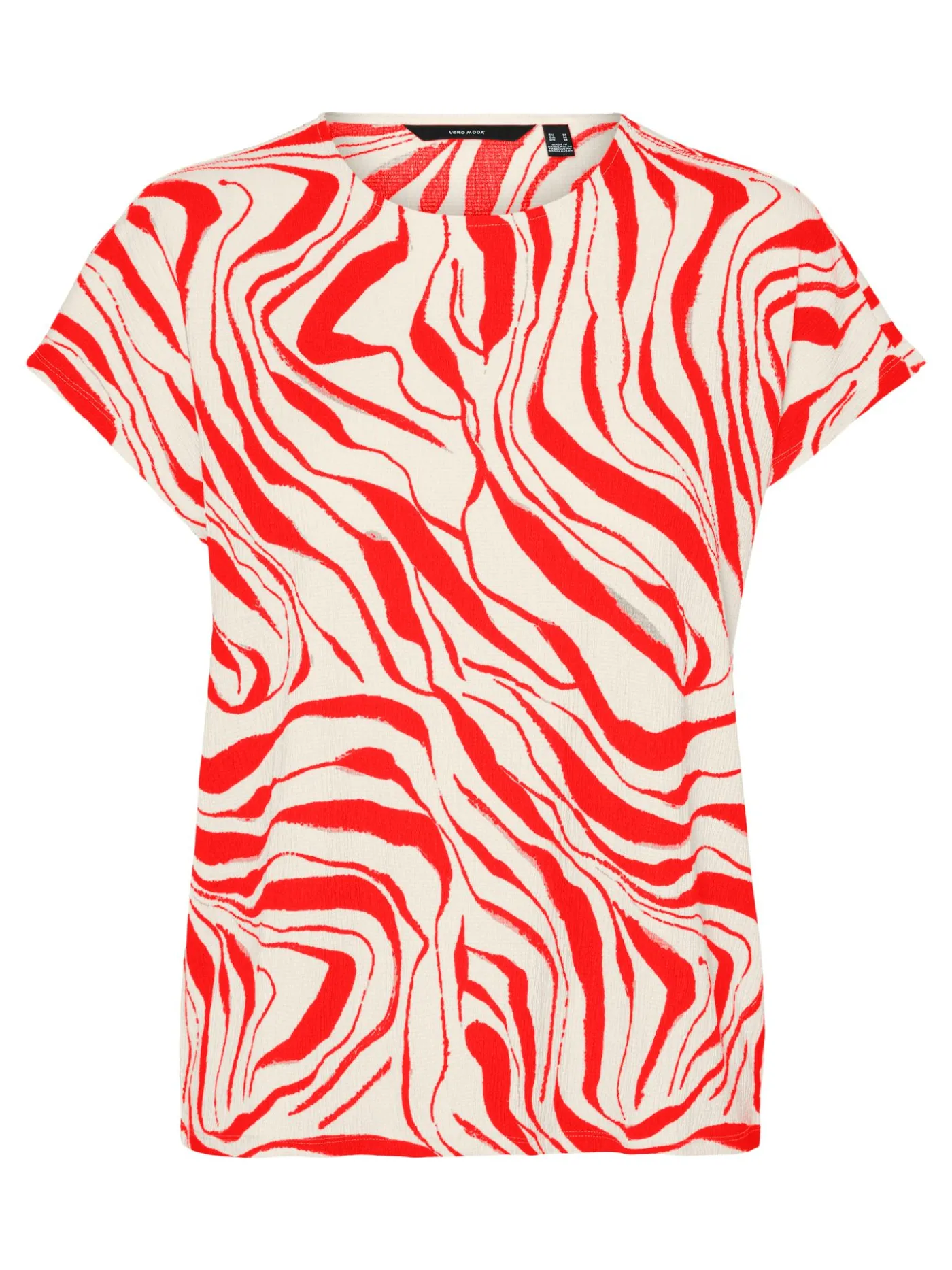 Creme kleurige top met rode all over print van het merk Vero Moda. Dit item is voorzien van korte kapmouwtjes en een ronde halslijn. Het item bevat stretch waardoor hij comfortabel draagt.
