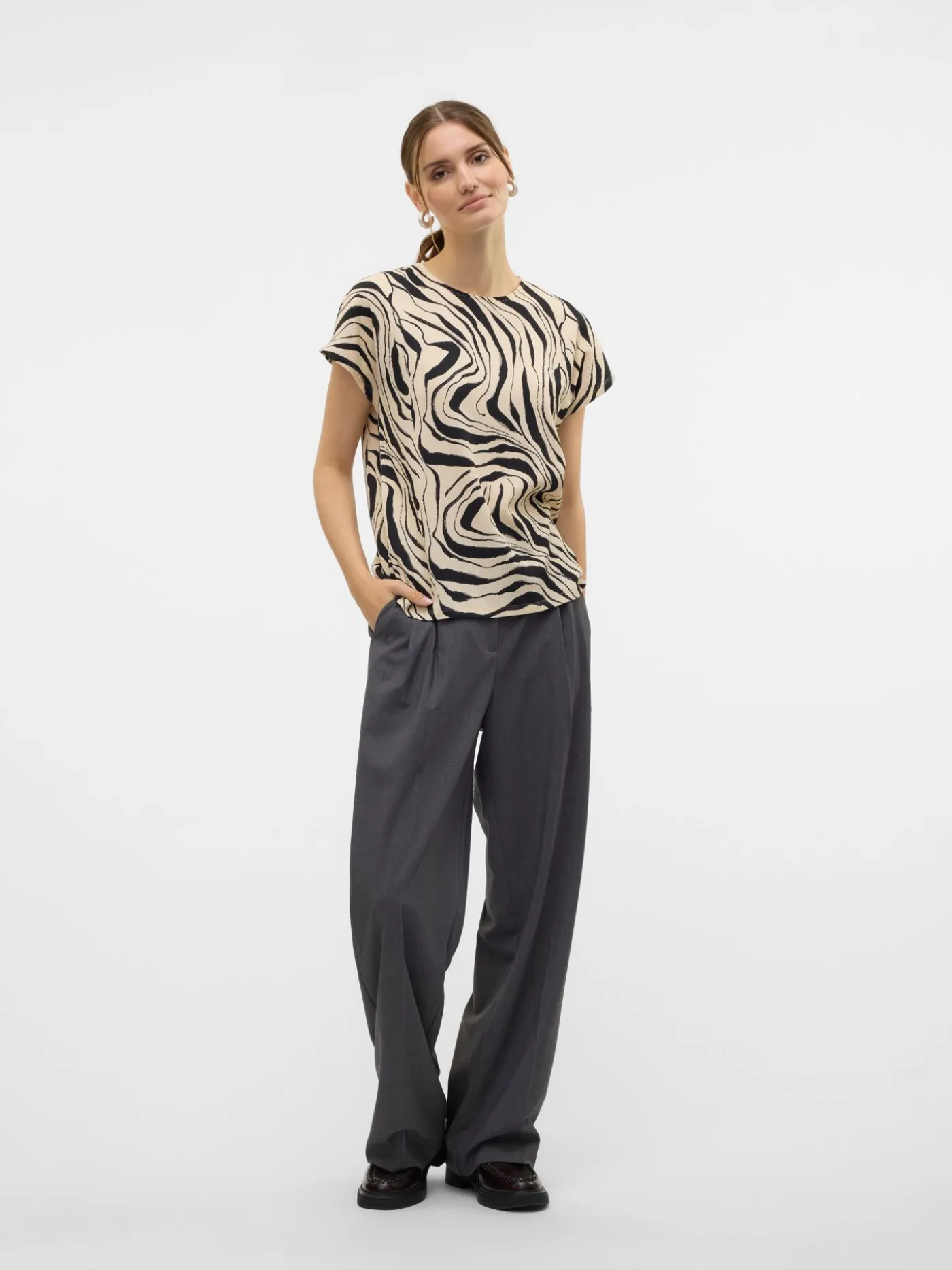 Beige shirt met zwarte print van het merk Vero Moda. Dit item is voorzien van kapmouwtjes een ronde hals en bevat stretch waardoor hij comfortabel draagt.