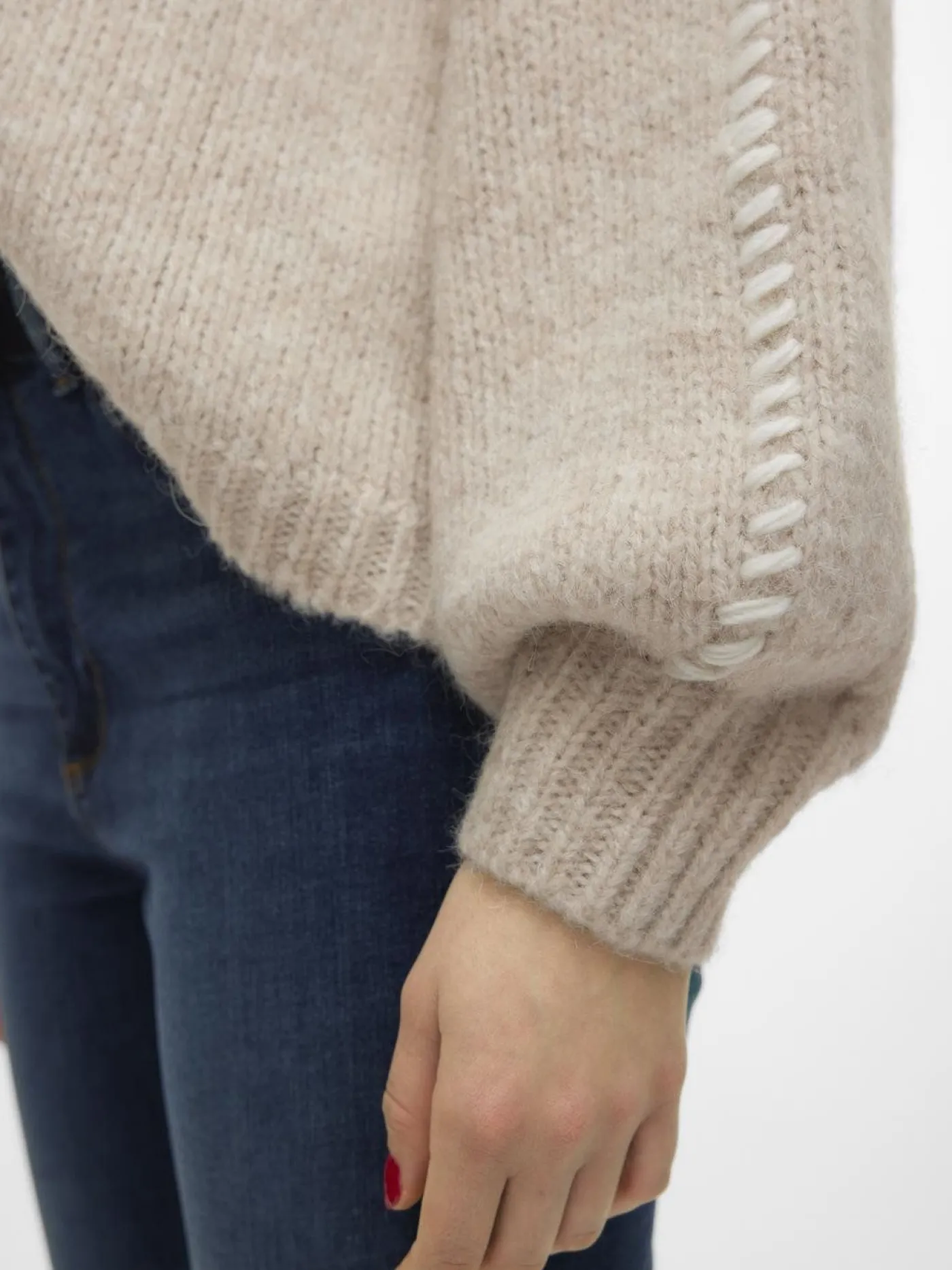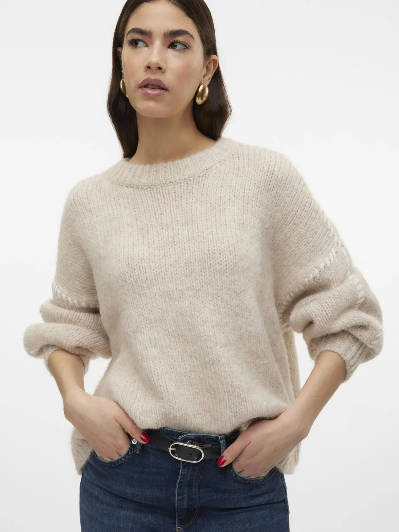 Deze heerlijke trui van Vero Moda heeft een beige kleur en witte opvallende stiksels. Hierdoor is het een echt trenditem. De trui heeft een ronde hals en wijde lange mouwen. Combineer de trui met een mooie jeans voor een casual, maar trendy outfit.