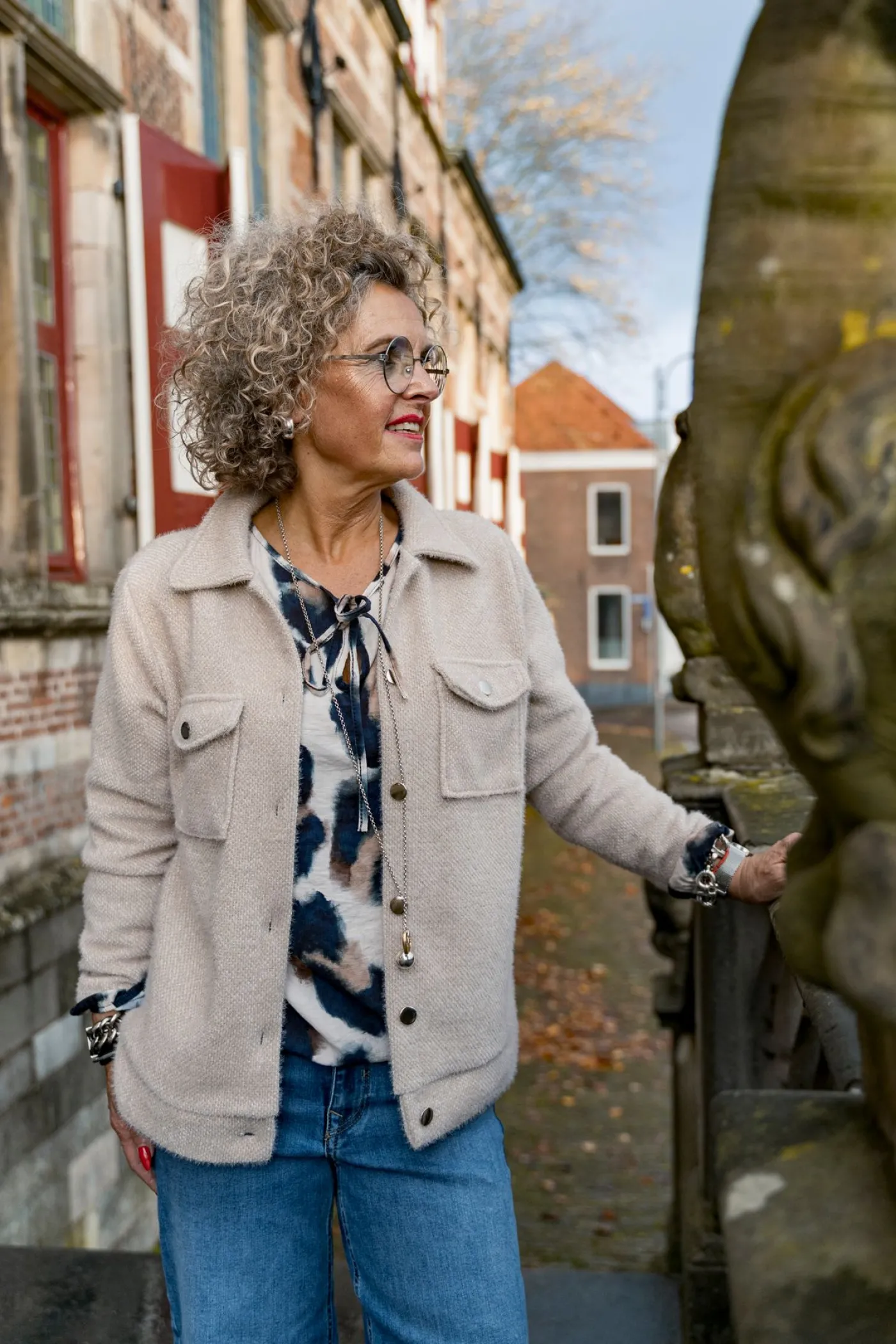 De Lizzy Duffel Lurex in beige van FOS Amsterdam is een stijlvol jasje in de kleur beige met subtiel lurex, knoopsluiting en zakken, geschikt voor casual en feestelijke gelegenheden.