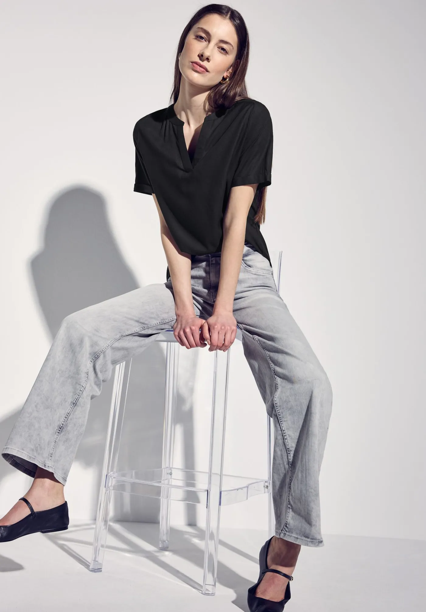 Dit is een T-shirt van Street One in de kleur zwart met een V-hals en korte mouwen. Dit is echt een perfecte T-shirt voor jou zomer omdat het zo lekker luchtig is.