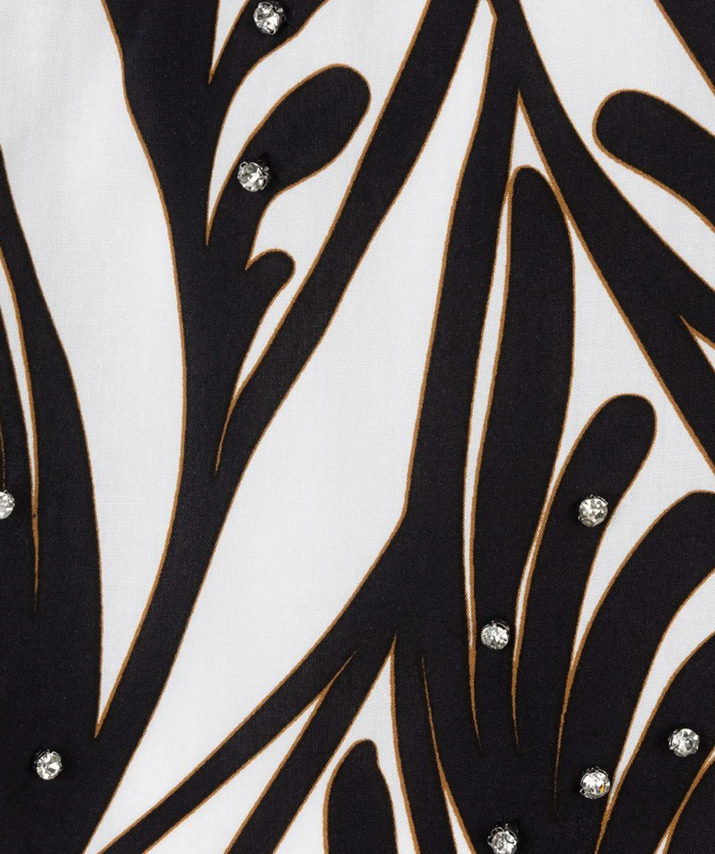 De Esqualo Blouse slv/lss Summer Vibes is een stijlvolle, mouwloze blouse met een opvallend zwart-wit bladmotief, geïnspireerd op palmbomen. Deze blouse is een chique toevoeging aan je zomergarderobe en kan zowel casual als formeel gedragen worden.