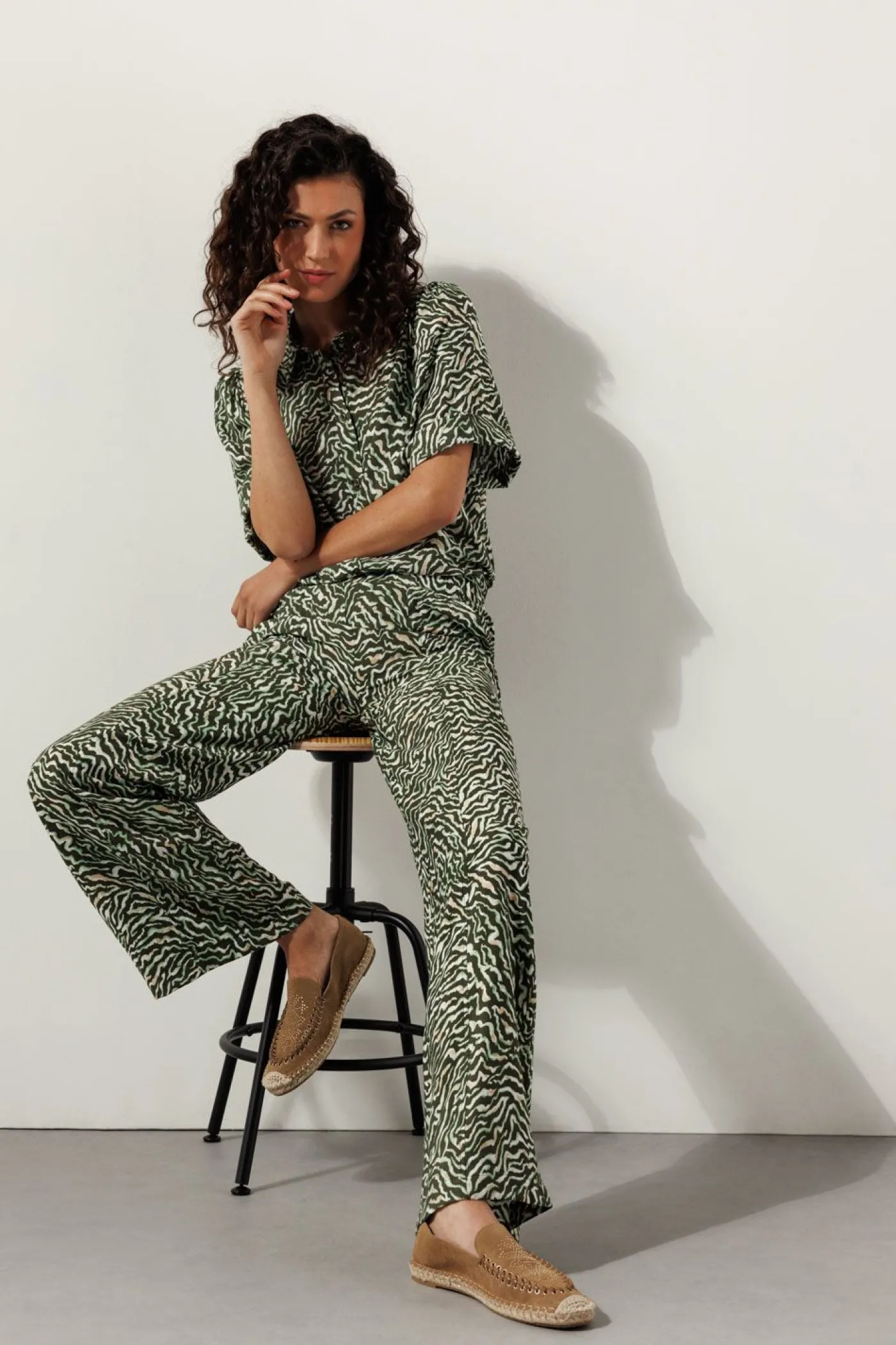 Blouse met groene zebraprint van het merk Tramontana. De blouse heeft korte pofmouwen, een klassieke kraag en sluit aan de hand van knoopjes. Aan de onderkant zit ook een elastiek waarmee je de blouse in model kan brengen. Deze luchtige blouse is het ideale item voor een warme lenteavond en makkelijk te combineren met verschillende items. Combineer bijvoorbeeld met bijpassende pantalon of een jeans.