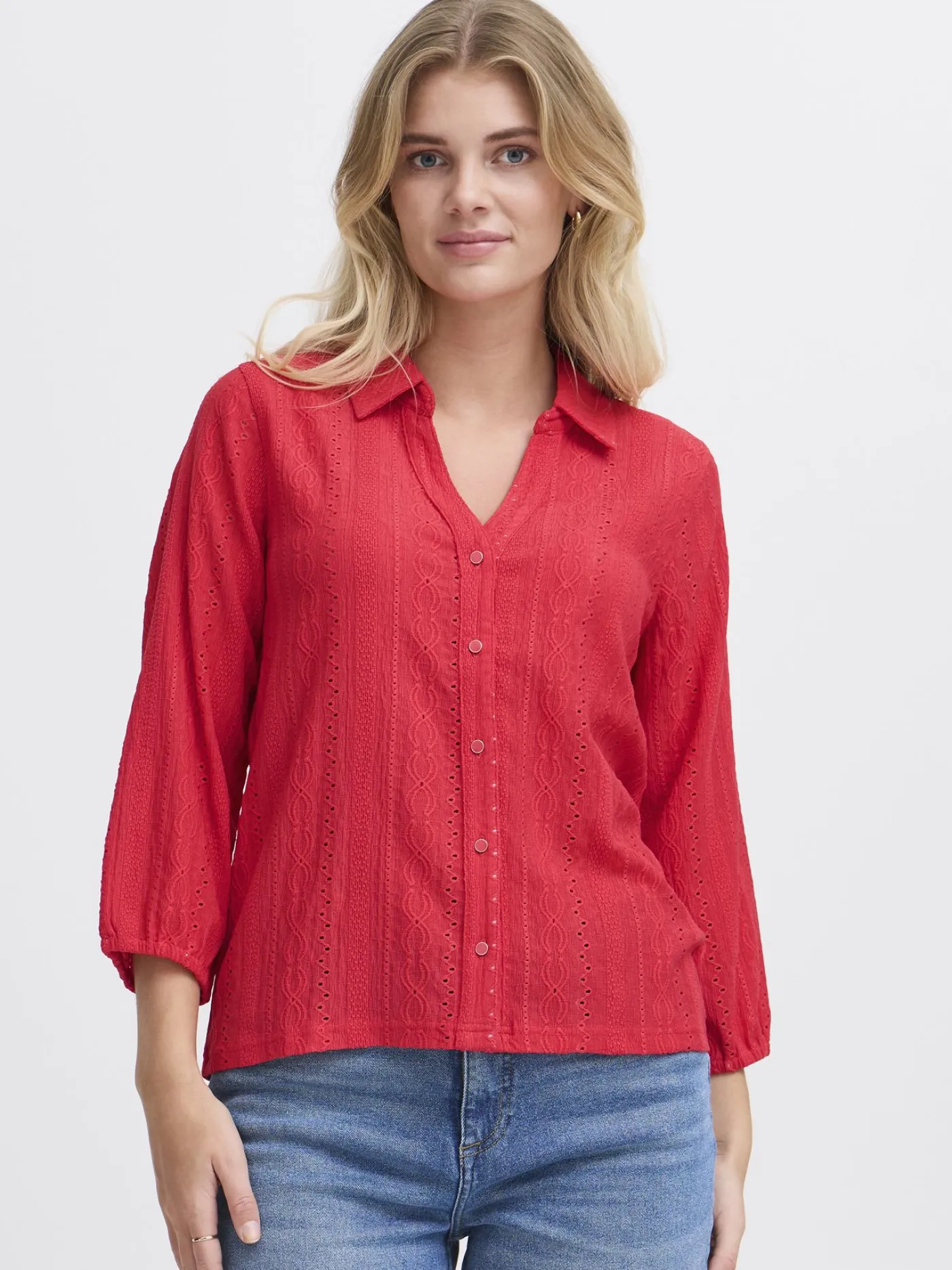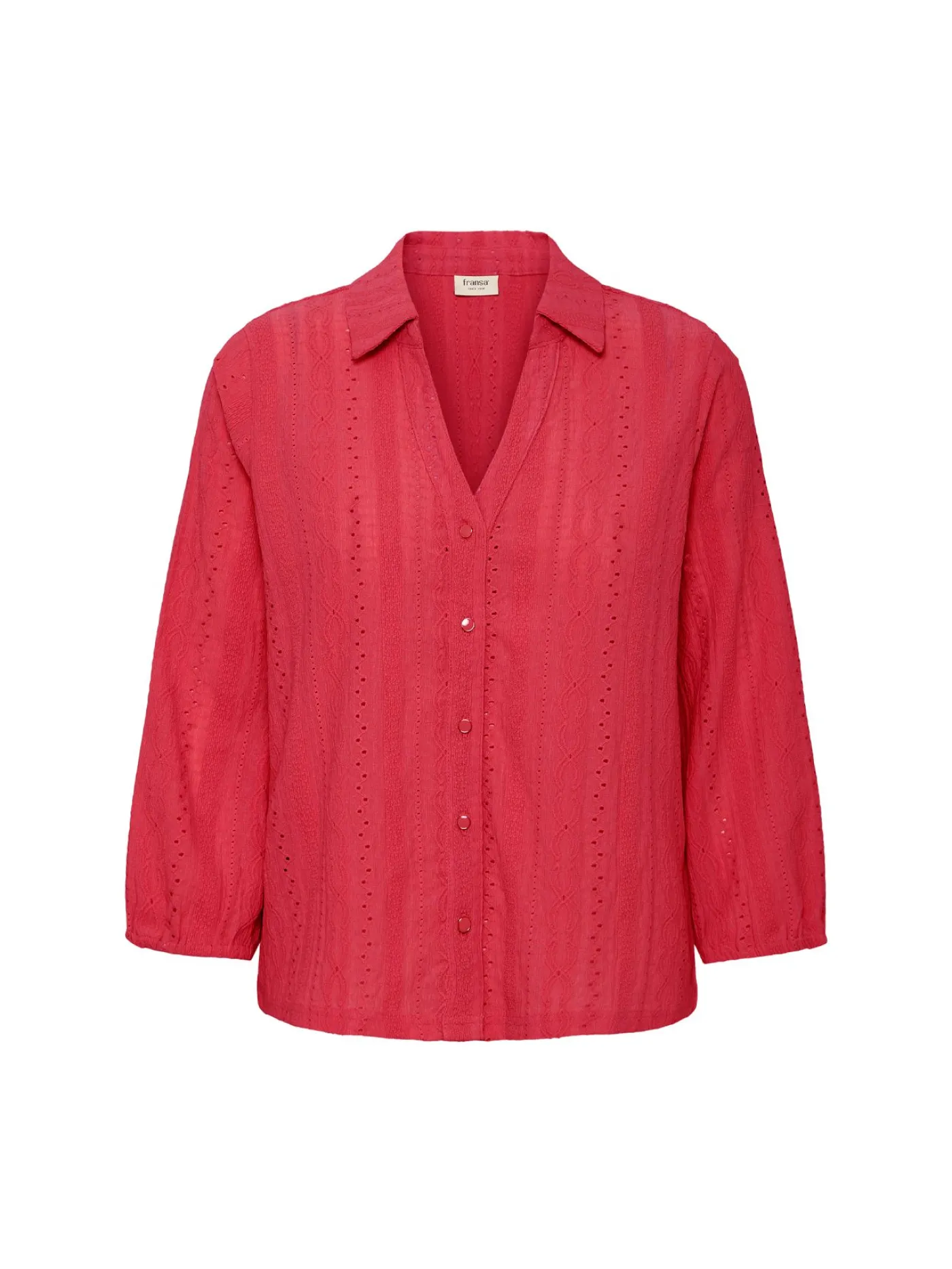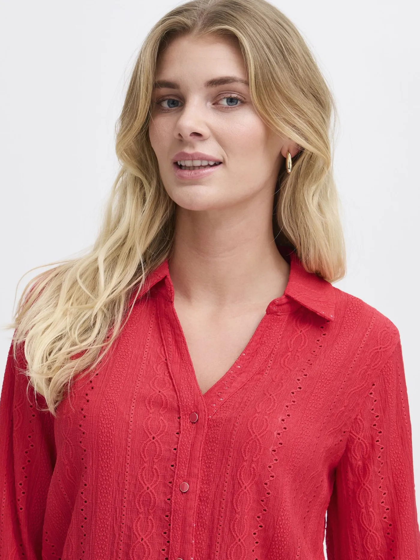 Deze rode blouse van het merk Fransa is een echte essential voor komend voorjaar. De blouse heeft een kraagje en sluit aan de voorkant met drukknopen. In de stof zit een werkje dat een patroon vormt. Dit geeft een leuk effect een maakt de blouse net iets specialer.