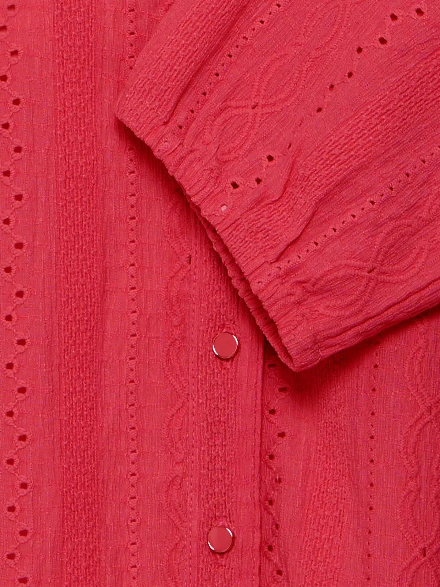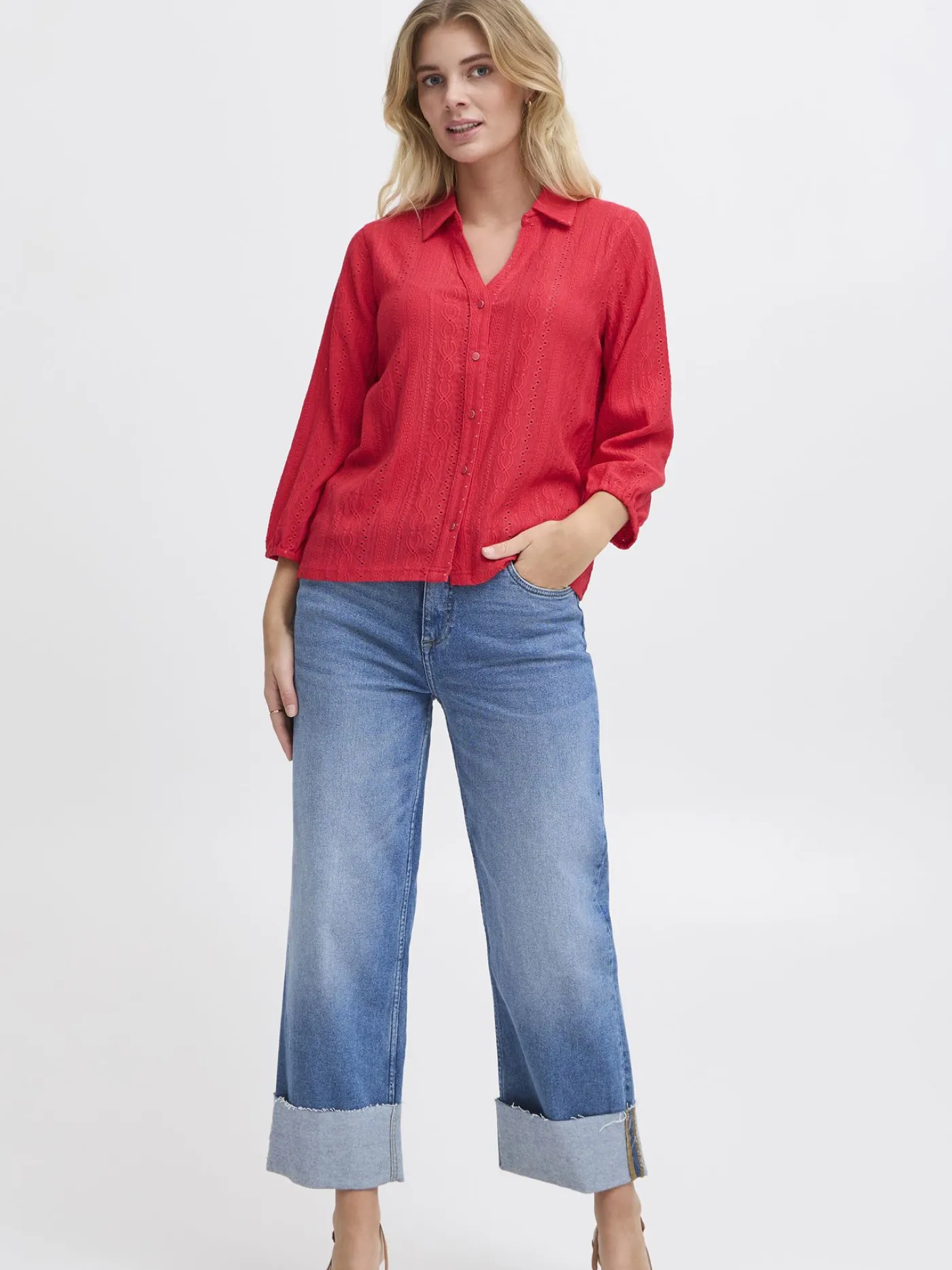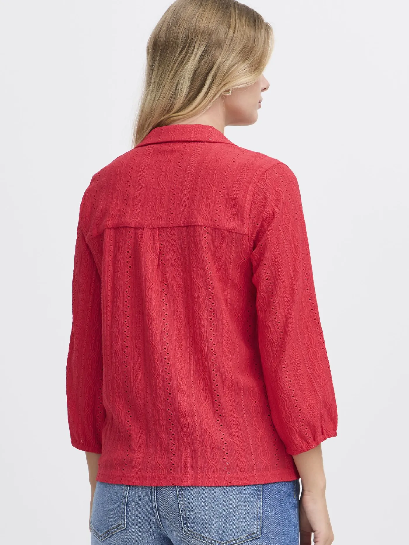 Deze rode blouse van het merk Fransa is een echte essential voor komend voorjaar. De blouse heeft een kraagje en sluit aan de voorkant met drukknopen. In de stof zit een werkje dat een patroon vormt. Dit geeft een leuk effect een maakt de blouse net iets specialer.