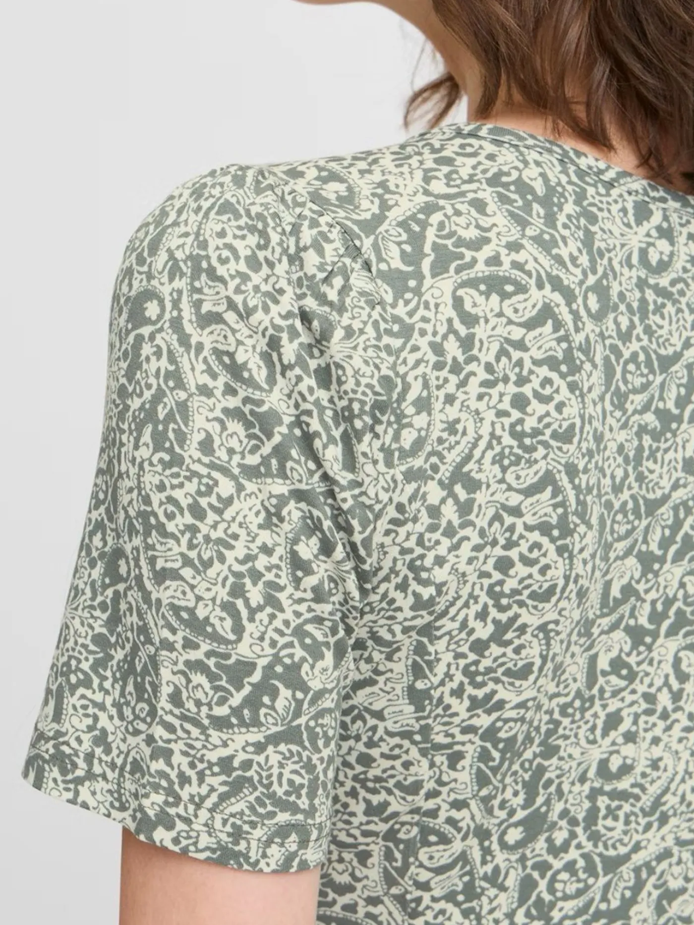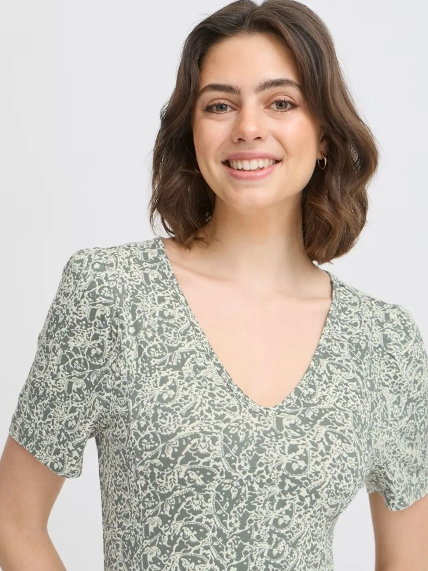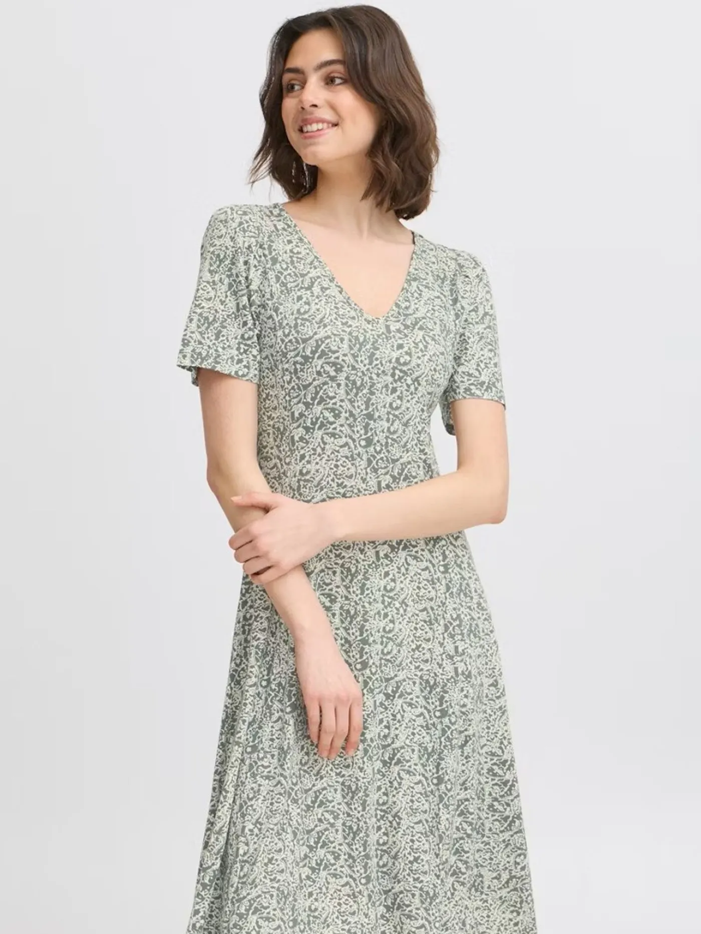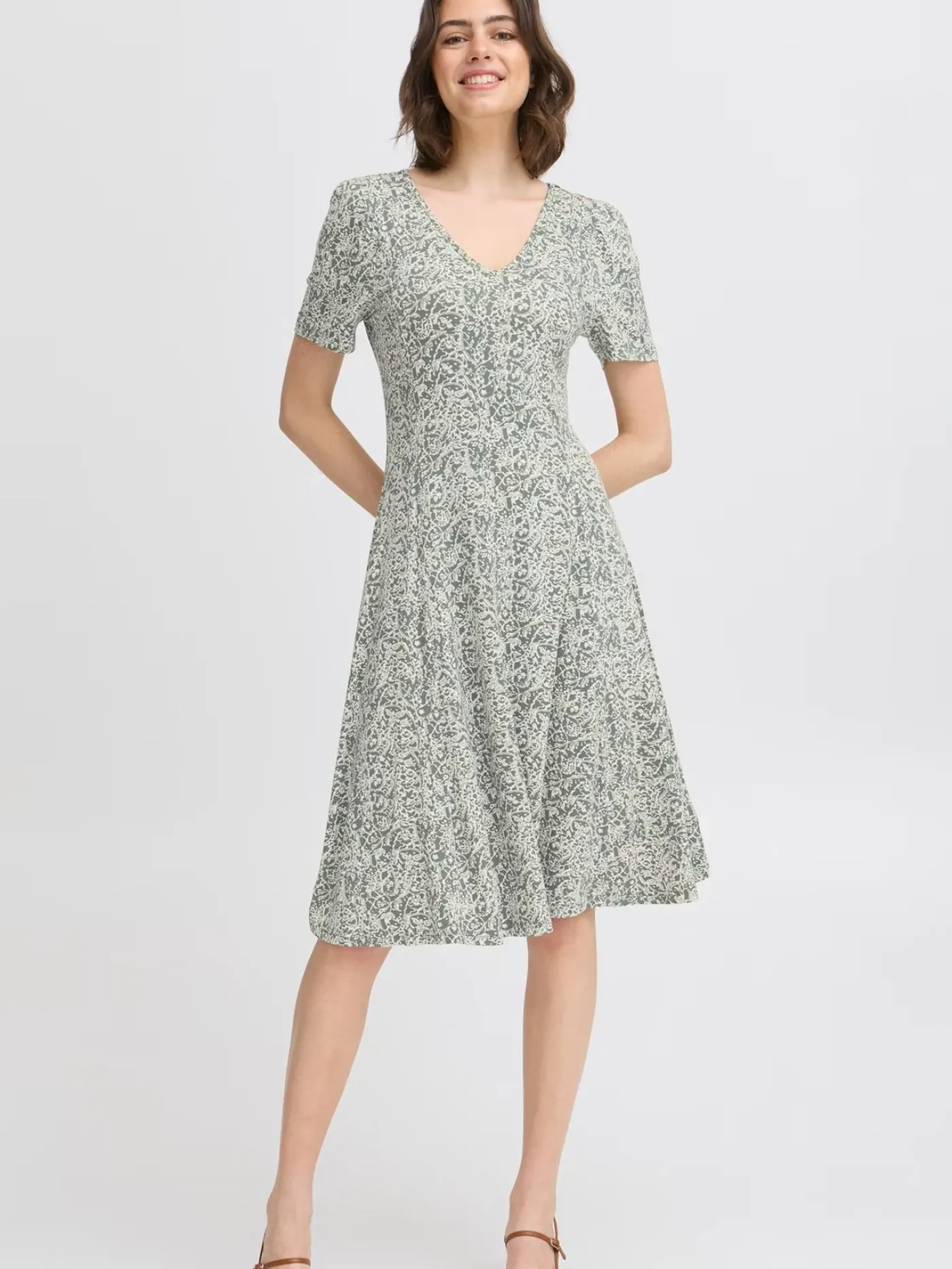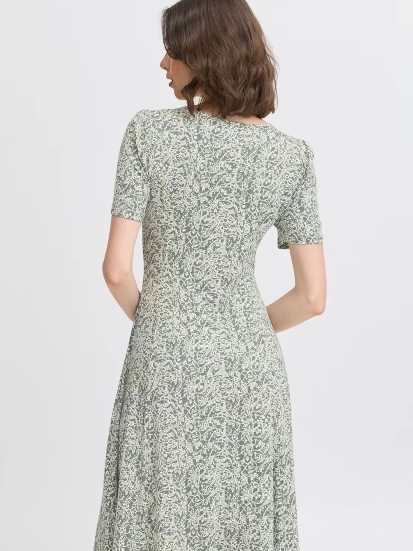 Deze zomerjurk met korte mouwen is onderdeel van de nieuwste collectie van het merk Fransa. De jurk is gemaakt van een comfortabele stretch stof, is wijduitlopend en valt op kuitlengte. De jurk is wit en heeft een groene al-over bloemenprint. Ook is het item voorzien van een lint waarmee je het om de middel kunt tailleren.