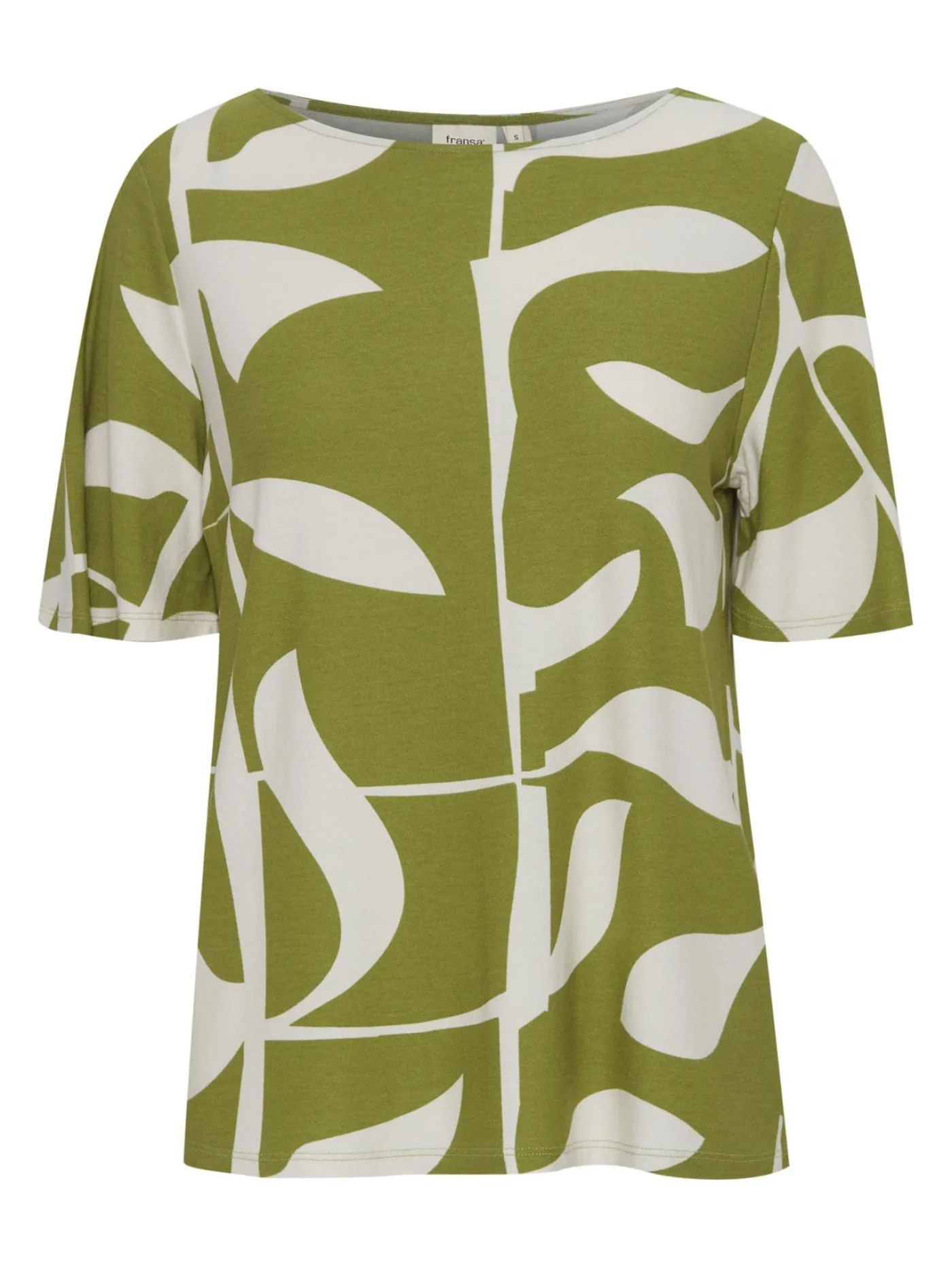 T-shirt van Fransa van een olijfgroene kleur met een witte print. Het T-shirt is van een heerlijk zachte stretch stof en heeft een ronde hals. Leuk te stijlen onder een blazer met een jeans!