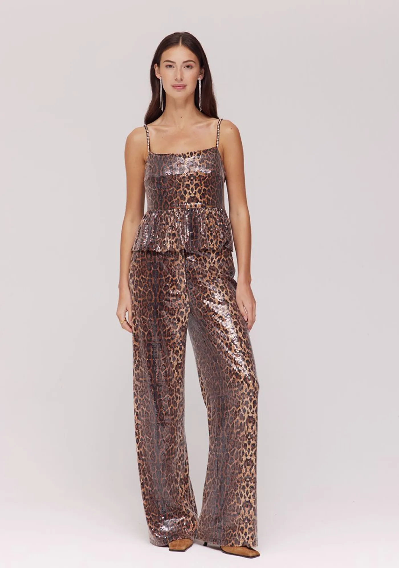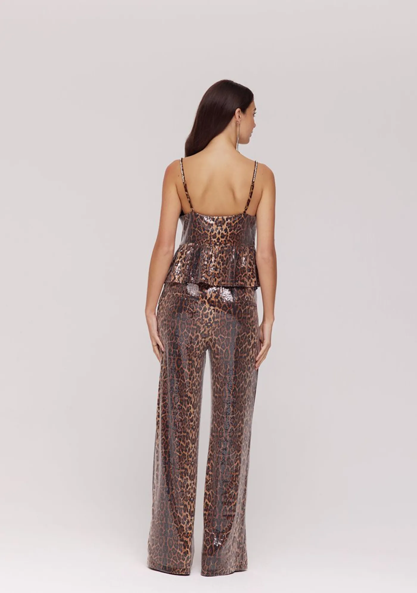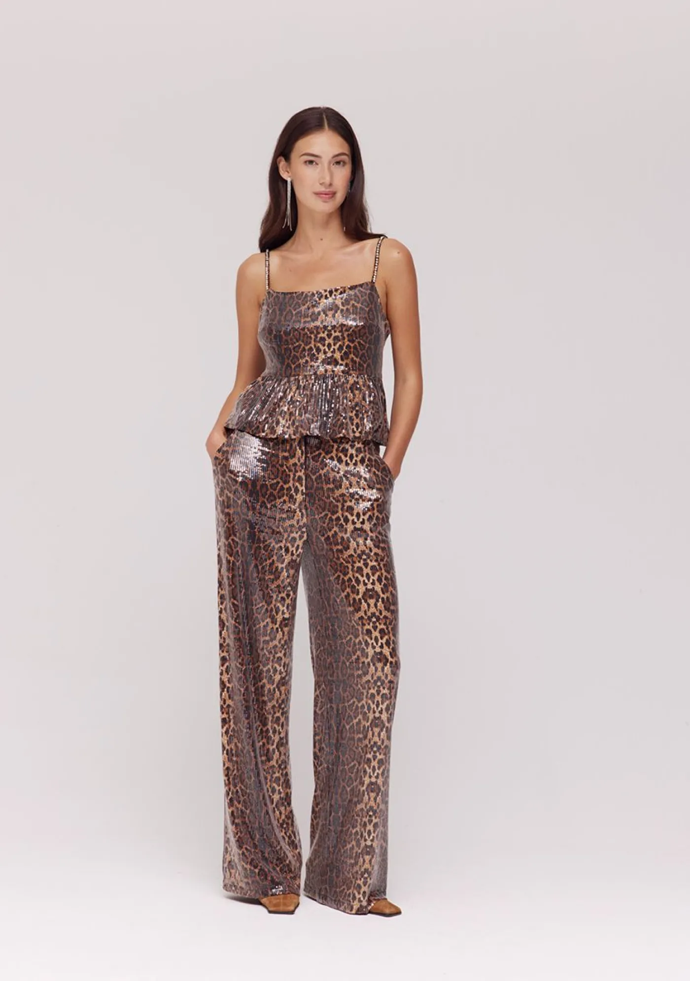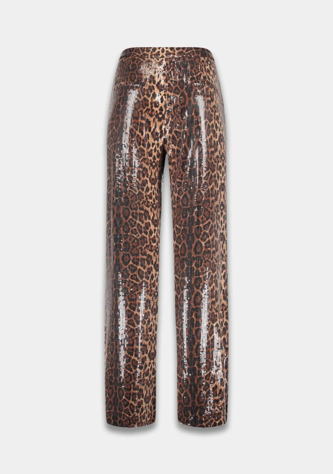 Laat je look schitteren met deze opvallende leopard pailletten broek, ontworpen voor wie graag een statement maakt. De broek is volledig bezet met glinsterende pailletten die het klassieke pantermotief extra diepte en luxe geven. De broek heeft een rechte, elegante pasvorm en sluit met twee haaksluiting, een knoop en rits. De achterkant van de broek bevat twee sierzakken. Of je nu kiest voor een avondje uit, een feestelijke gelegenheid of een gedurfde dagelijkse outfit: deze broek brengt instant glamour in elke combinatie. Draag hem met een eenvoudige top voor een gebalanceerde look, of ga all out met bijpassende print.