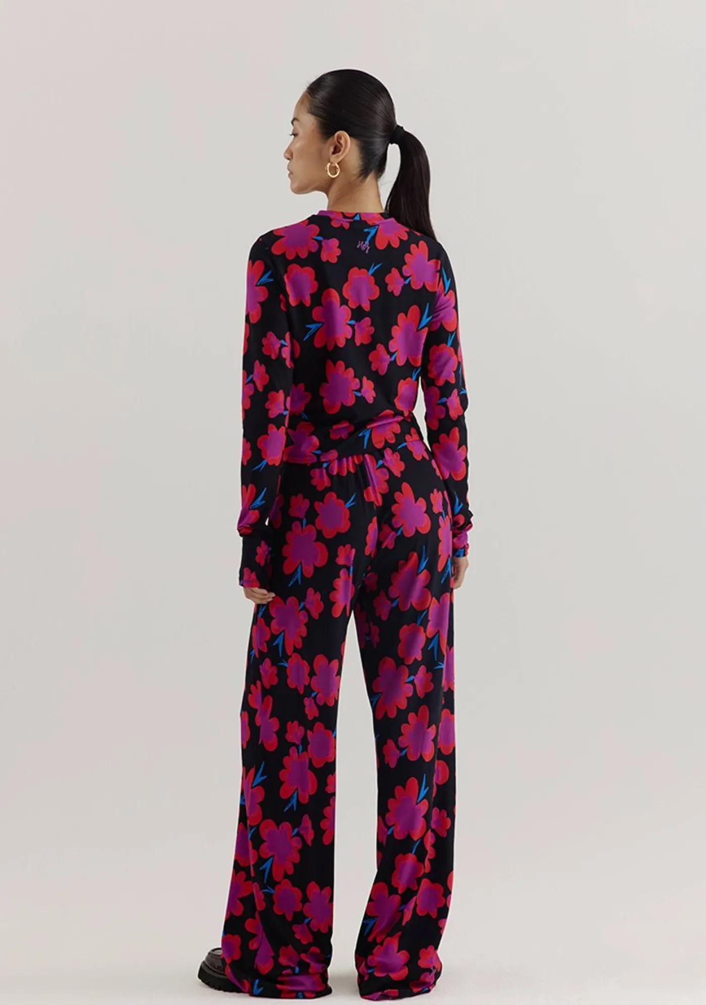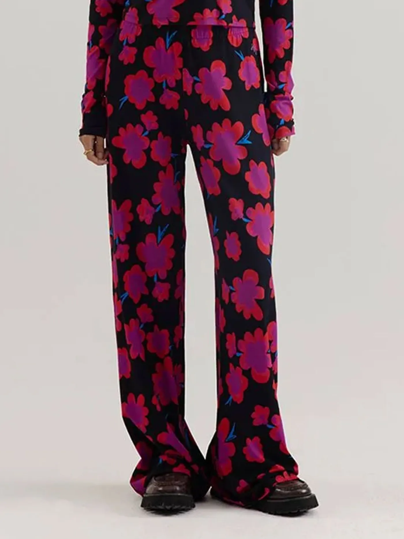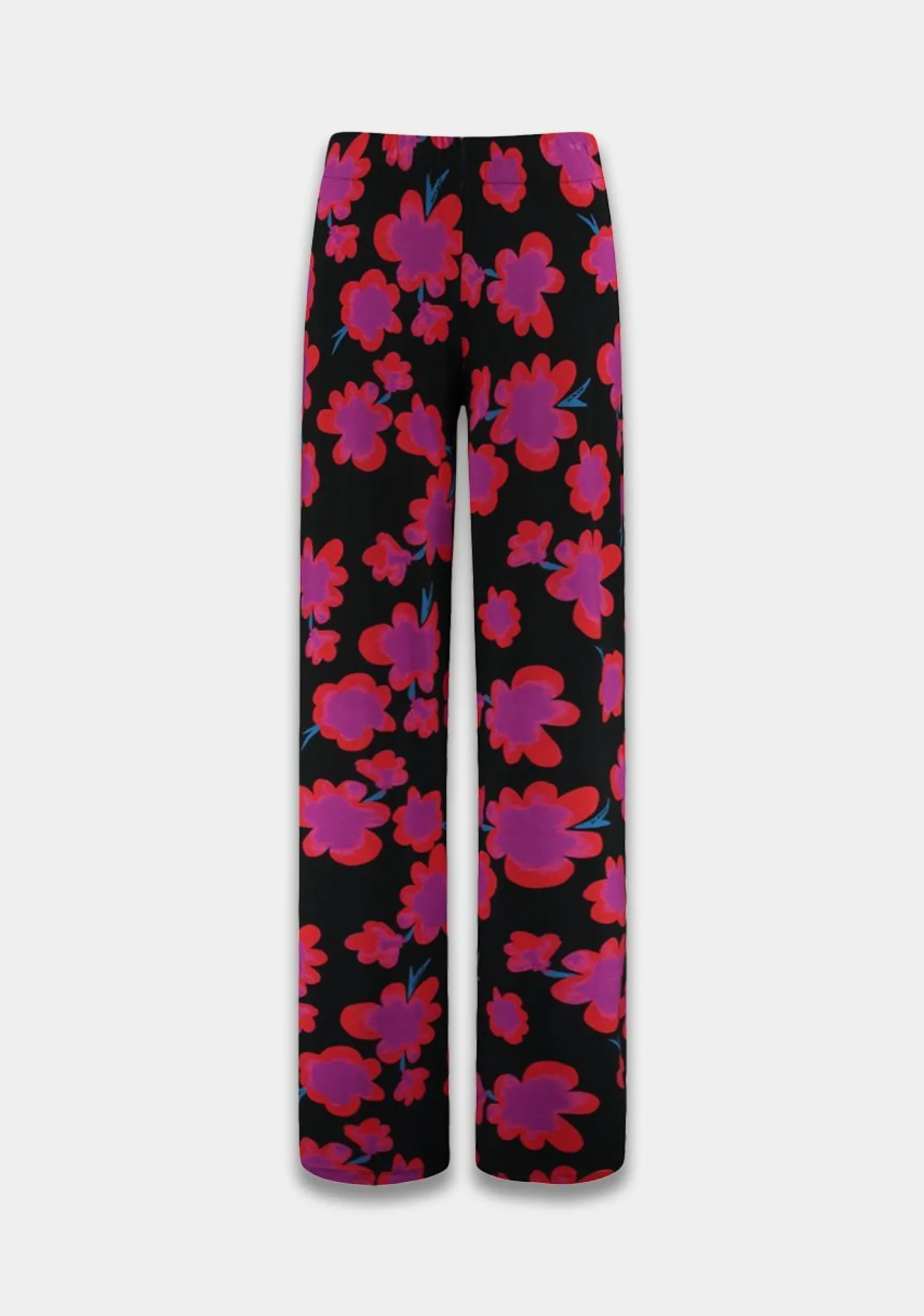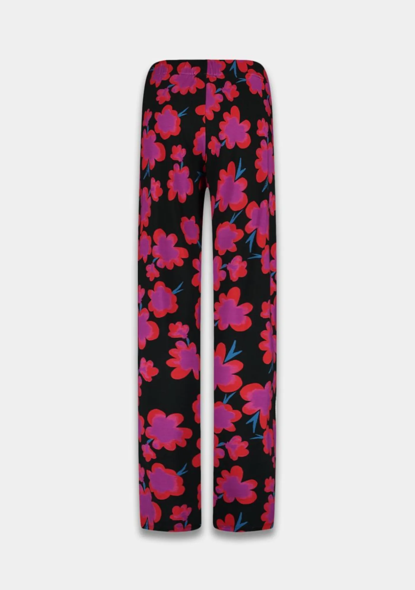 Deze broek heeft een modieuze en speelse uitstraling met een opvallend bloemmotief in levendige kleuren. Het ontwerp combineert een comfortabel, recht model met een trendy en eigentijdse stijl, perfect voor casual gelegenheden. De stof voelt zacht aan en heeft een stretch voor extra bewegingsvrijheid. De broek heeft een elastische tailleband, wat zorgt voor een comfortabele pasvorm. In het patroon zit de merknaam subtiel verwerkt. Deze broek is ideaal om te combineren met een eenvoudig topje voor een relaxte, maar stijlvolle look. Perfect voor elke gelegenheid waar je een statement wilt maken met je outfit. Combineer met het bijpassende shirt voor een complete look.