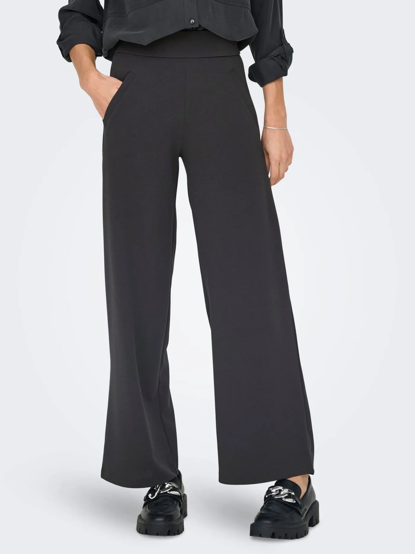 De JDY damesbroek met hoge taille, elastische tailleband, wijde rechte pijpen en zijzakken. Verkrijgbaar in meerdere kleuren. Leuk te combineren met witte frisse sneakers!