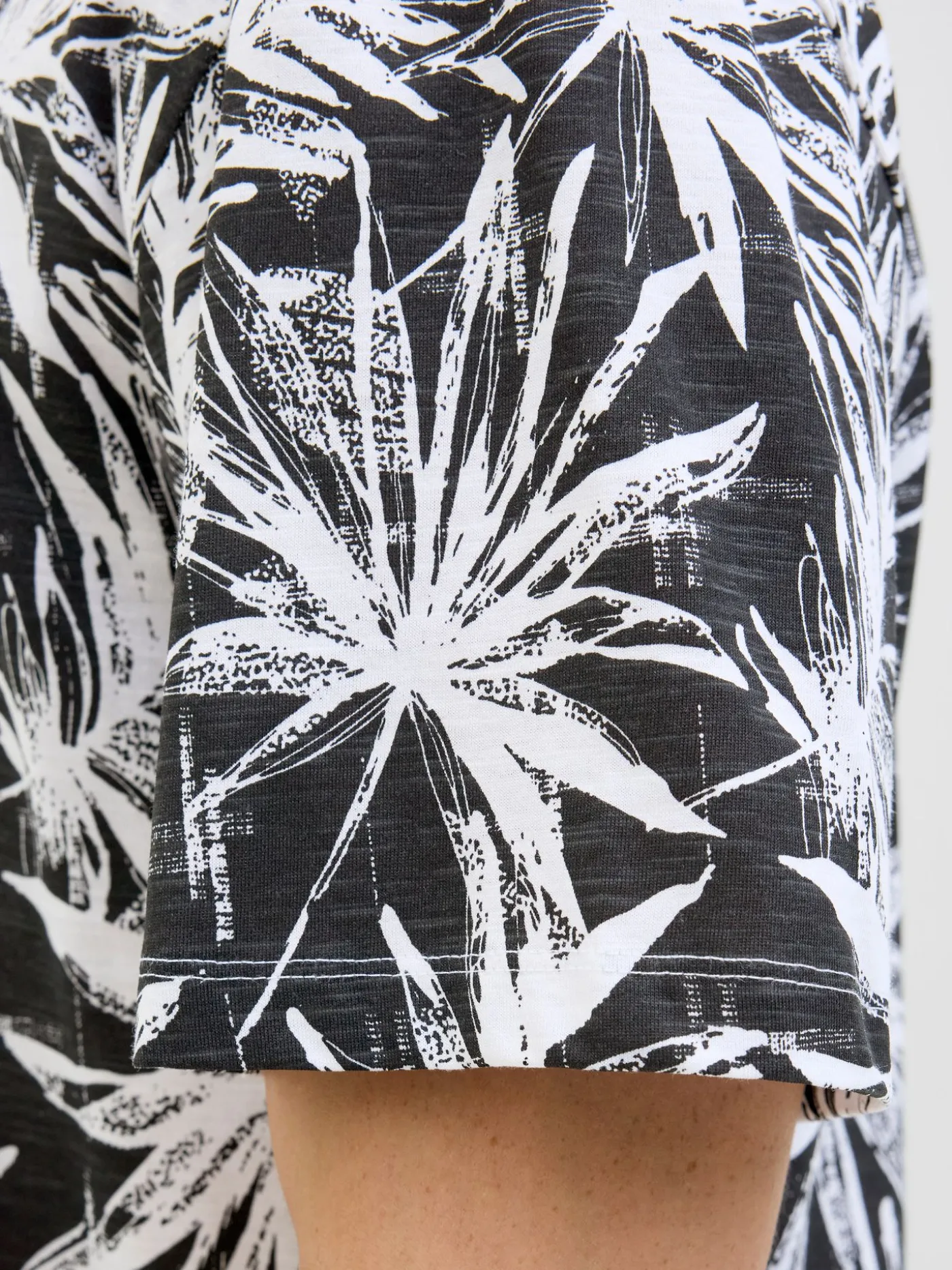 Dit zwart met witte t-shirt van Jack & Jones heeft een ronde hals en korte mouwen. het t-shirt zelf is zwart met witte bloemen en bladeren erop. Door de kleur is het item makkelijk te combineren. Je kunt dit item combineren met een korte broek en slippers voor een zomerse look.