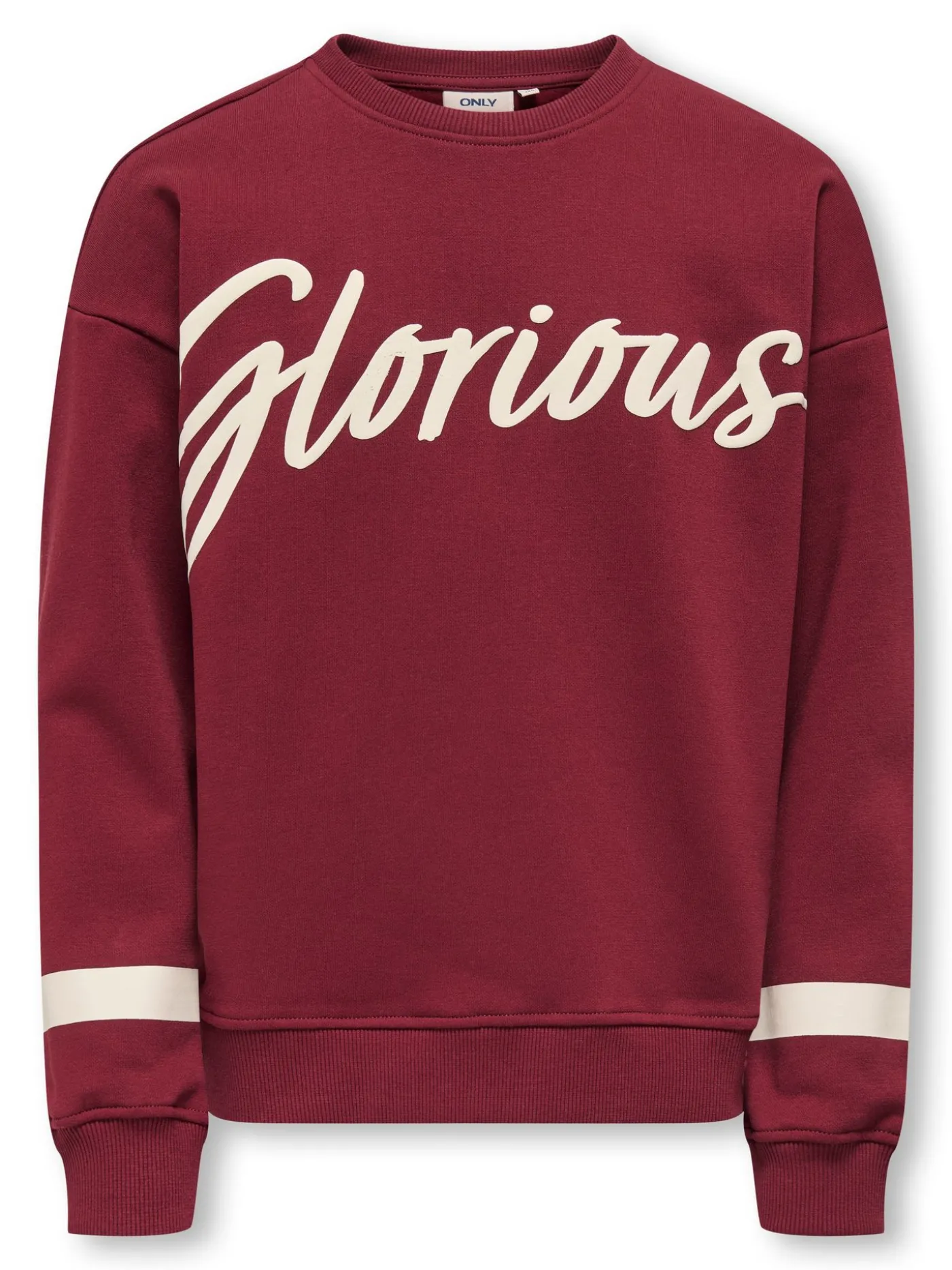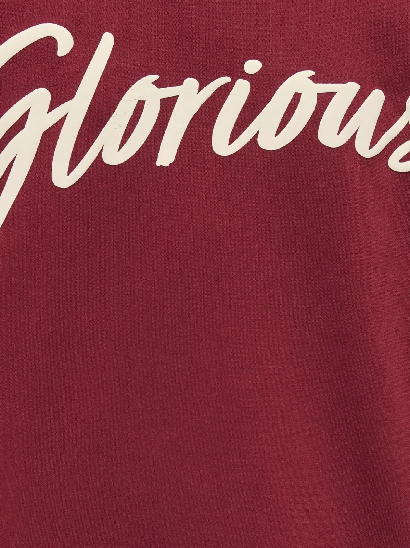 Een bordeaux rode sweatermet daarop de tekst ‘Glorious’ in crème letters. Op allebei de mouwen zit een streep rond de polsen. De sweater is afgewerkt met een crew neck. Een leuke trui om te dragen in het najaar.