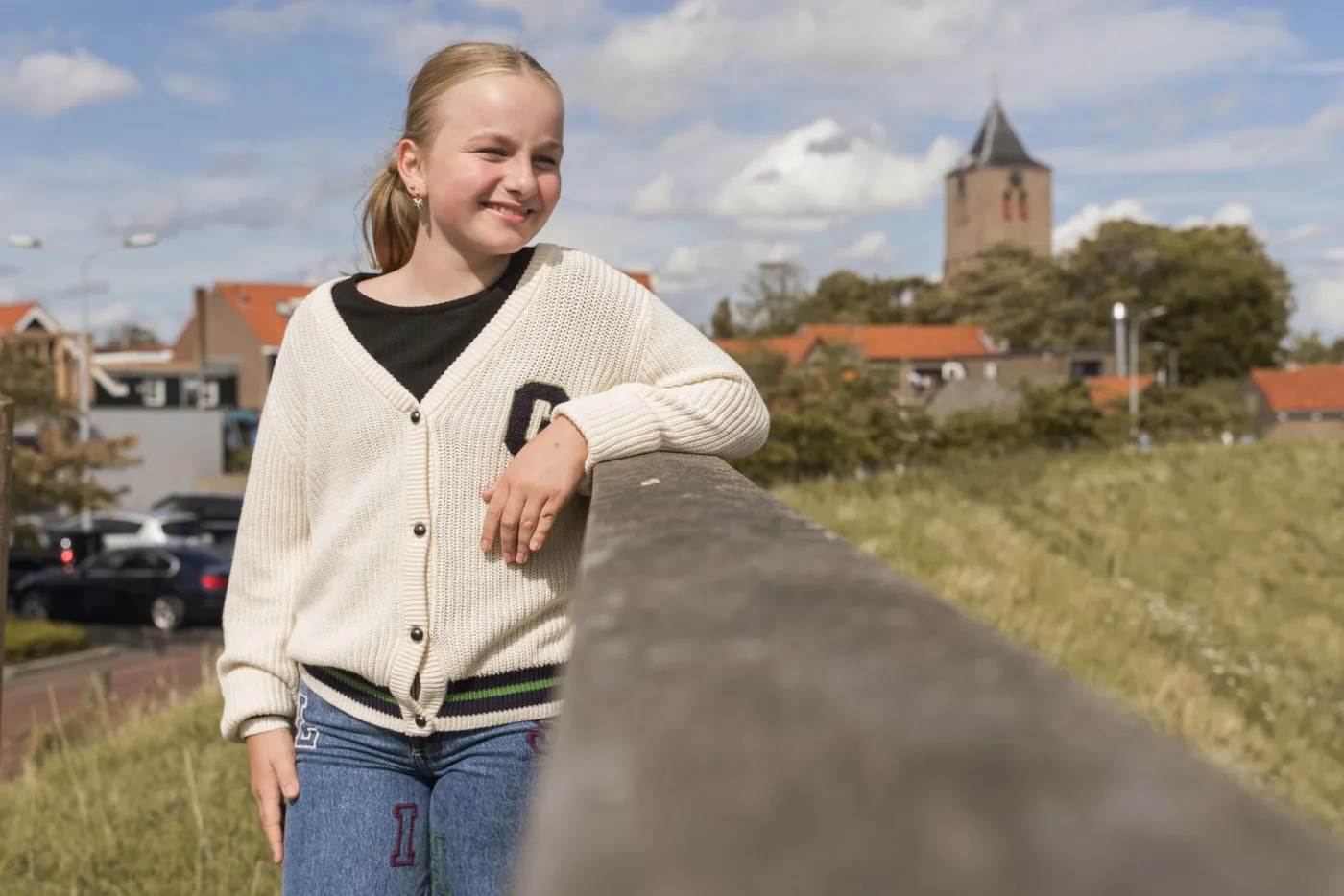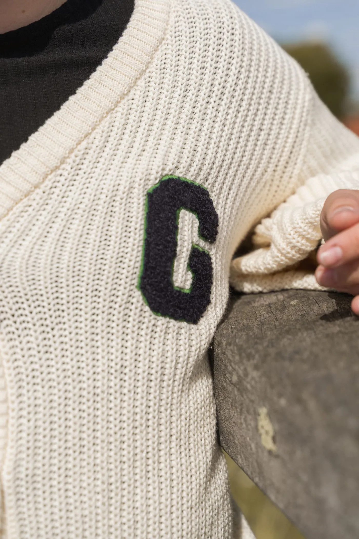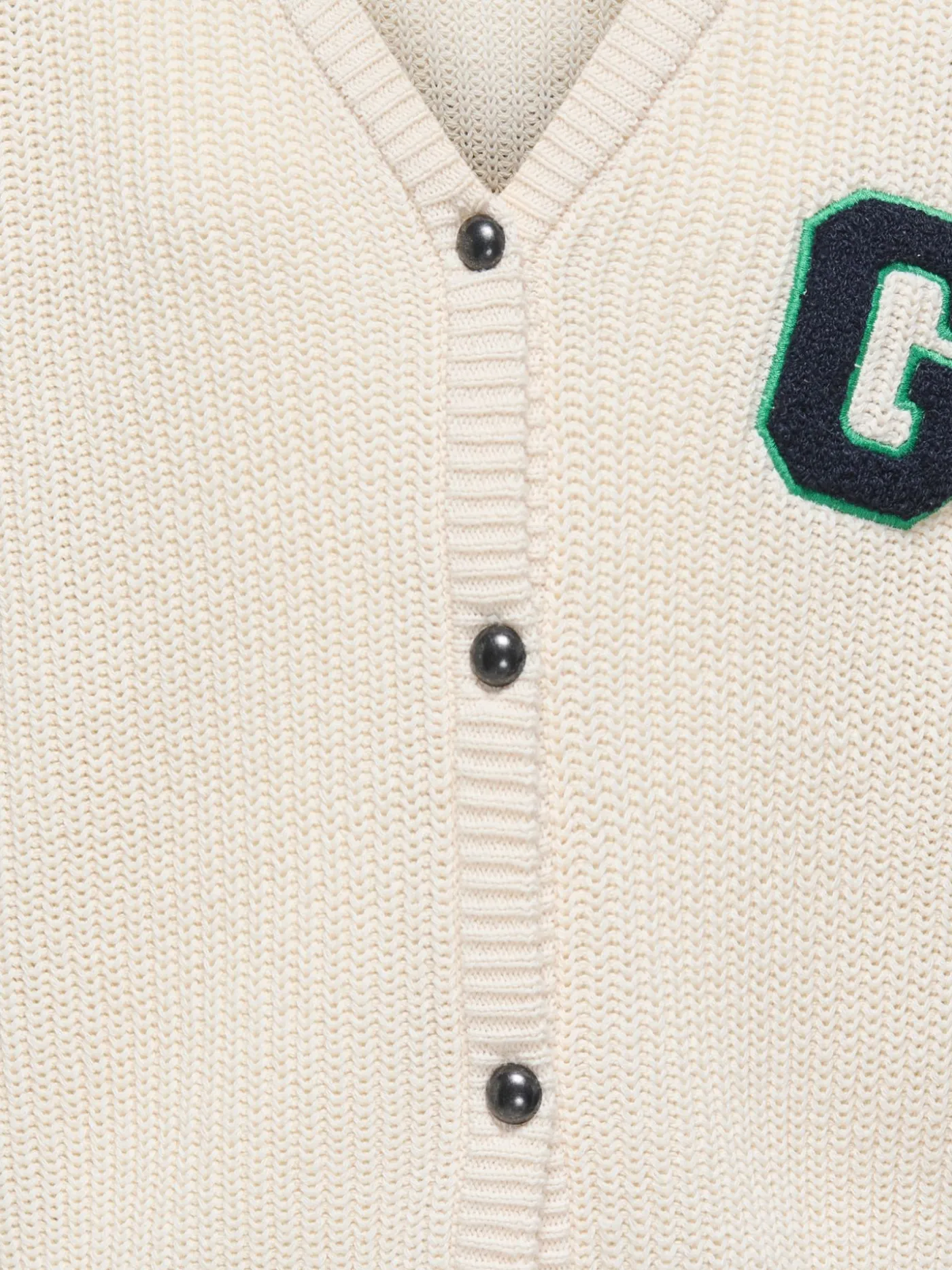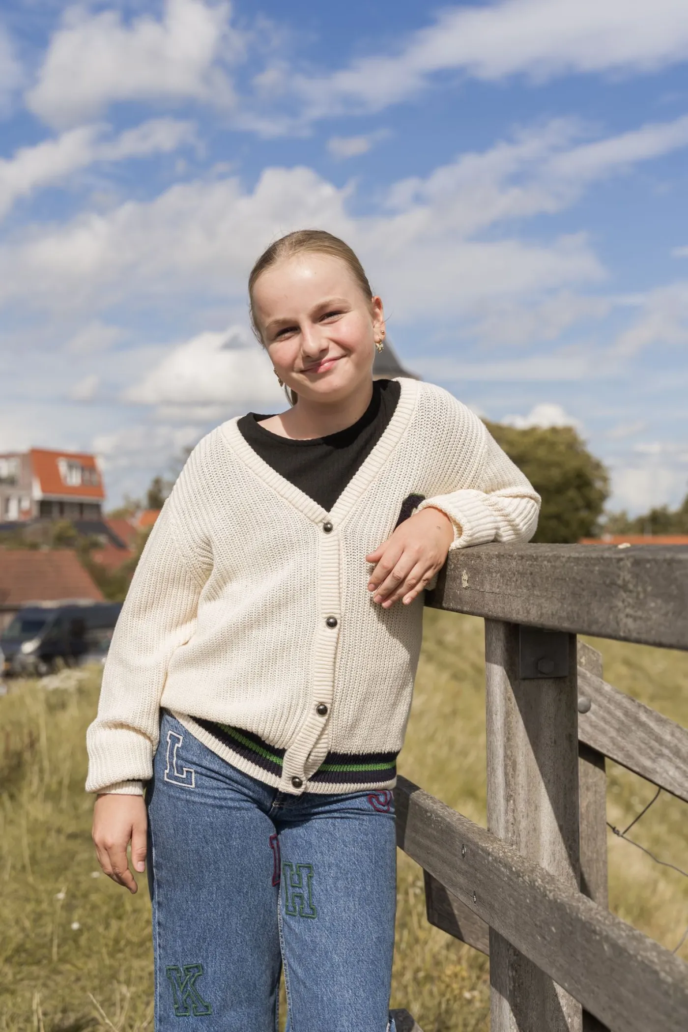 Dit speelse vest in crèmekleur heeft een sportieve uitstraling dankzij de contrasterende gestreepte boorden in navy en groen. Op de borst zit een grote patch in matchende kleuren. Het vest is voorzien van een V-hals en sluit met opvallende knopen aan de voorkant. De stof valt soepel, waardoor dit een erg lekker vest is. Draag dit met vest met een shirt eronder en jeans voor een casual look.