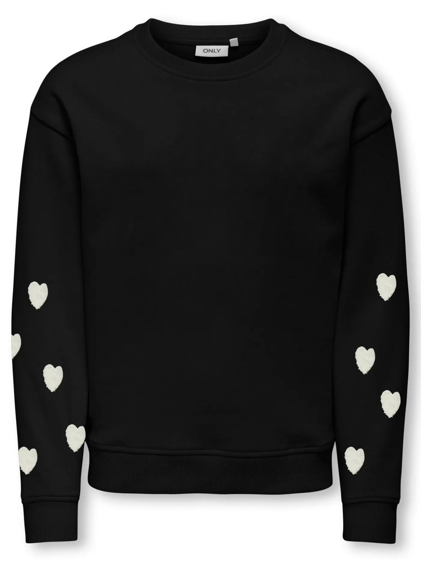Deze zwarte meisjestrui is een stoere en comfortabele keuze voor dagelijks gebruik. De witte hartjes op de onderkant van de mouwen zorgen voor een speels en lief detail. Gemaakt van zachte, stevige stof die prettig zit en goed bestand is tegen spelen en bewegen. De ronde hals en normale pasvorm bieden veel bewegingsvrijheid en draagcomfort. Perfect voor school, buitenspelen of een gezellige dag thuis.