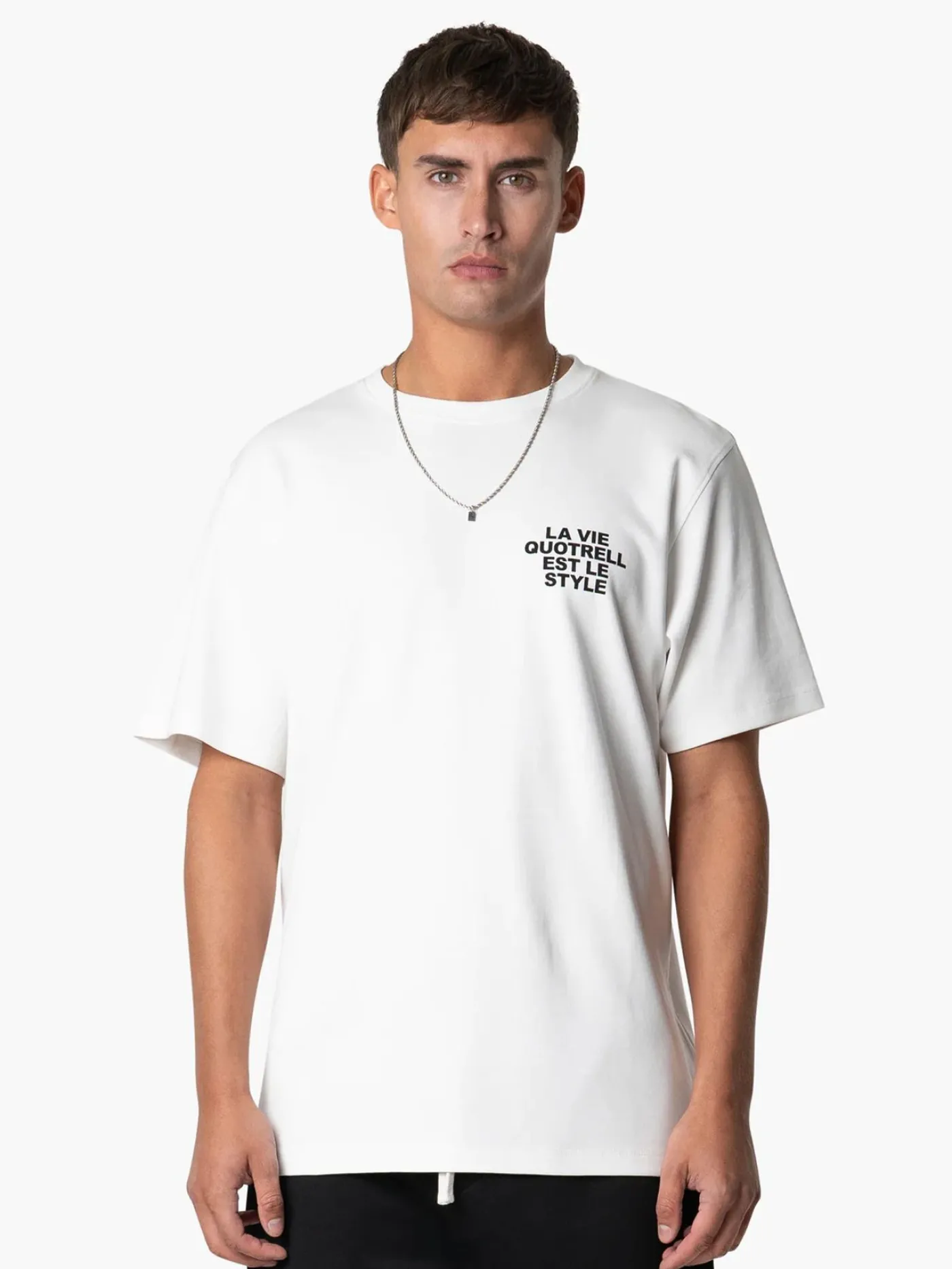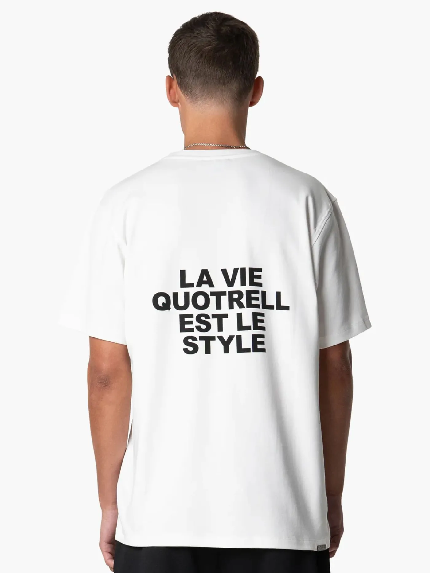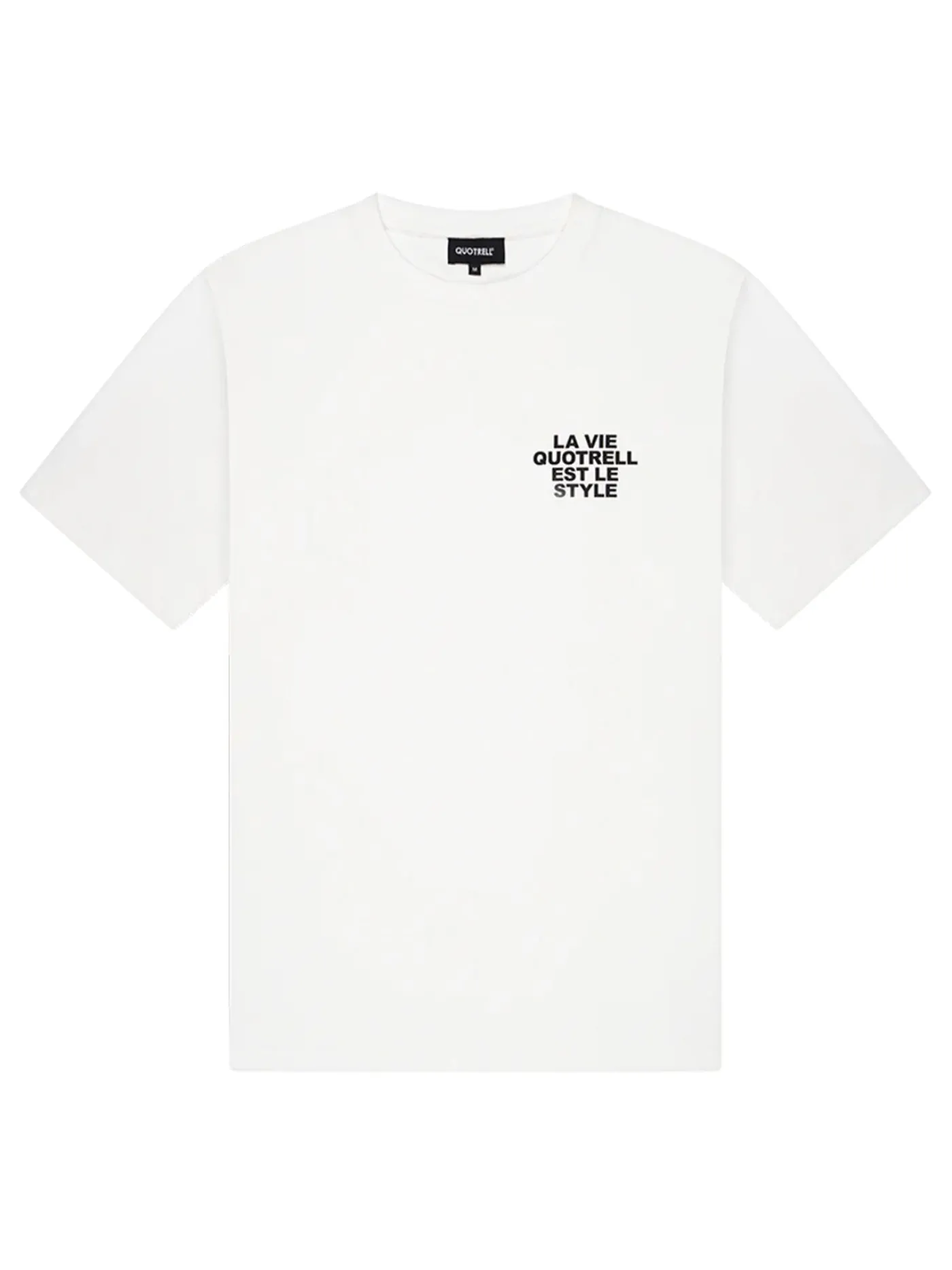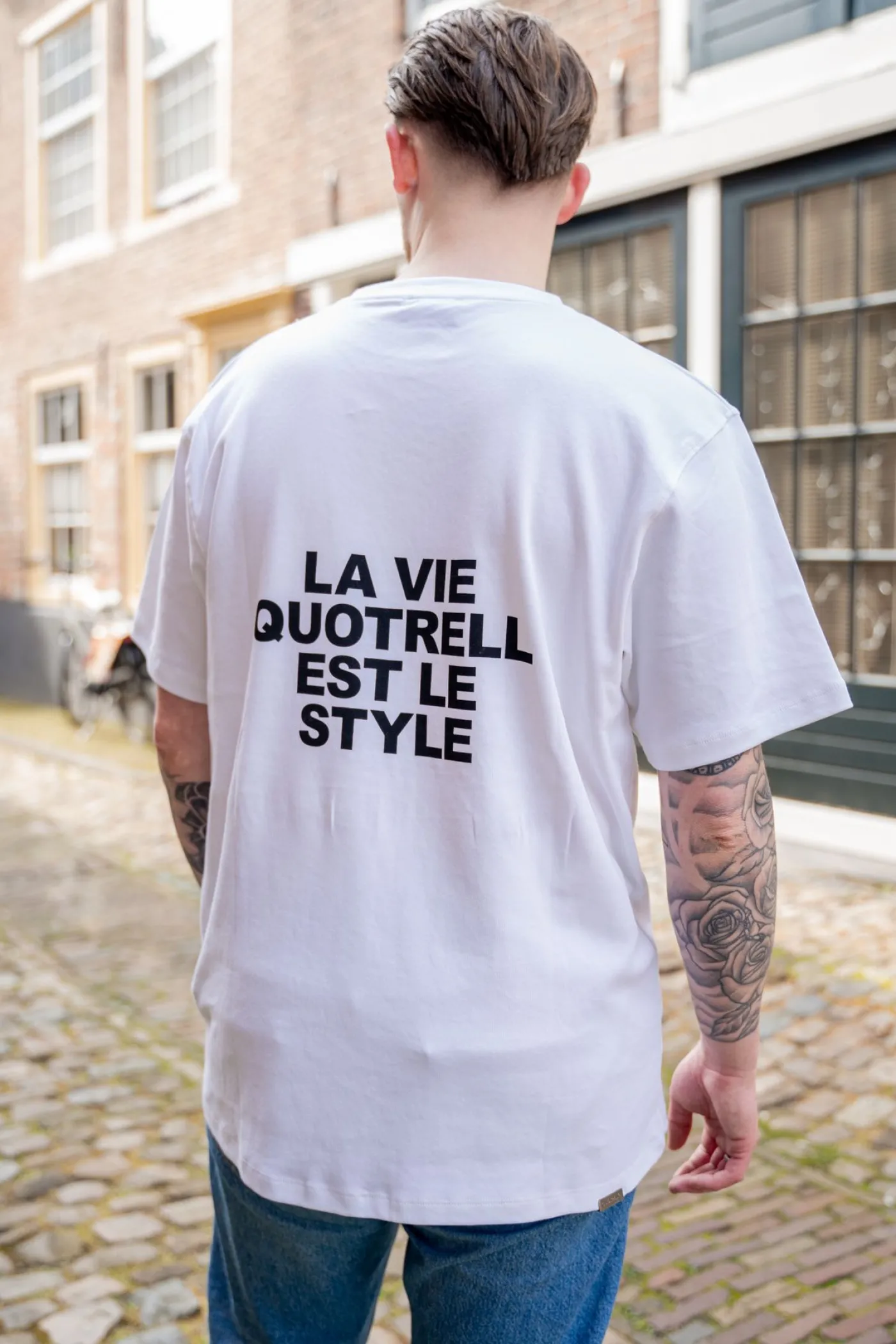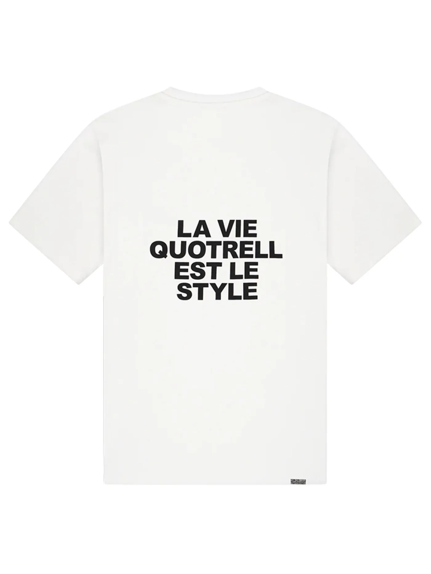 Wit oversized T-Shirt van het merk Quotrell. Dit model heeft een ronde halslijn en korte mouwen. Aan de voorzijde staat op de borst een zwart merklogo en op de rug een bedrukking.