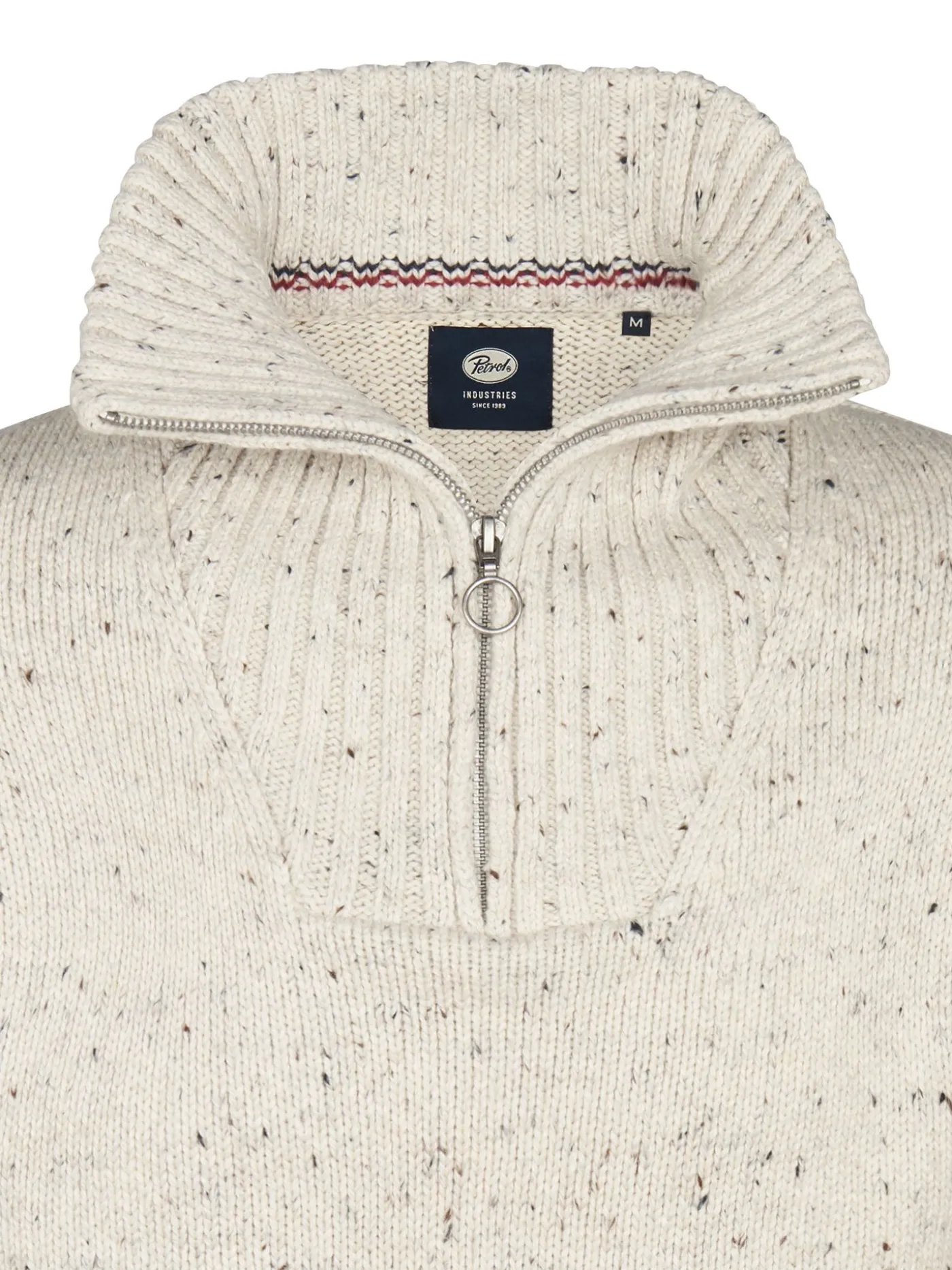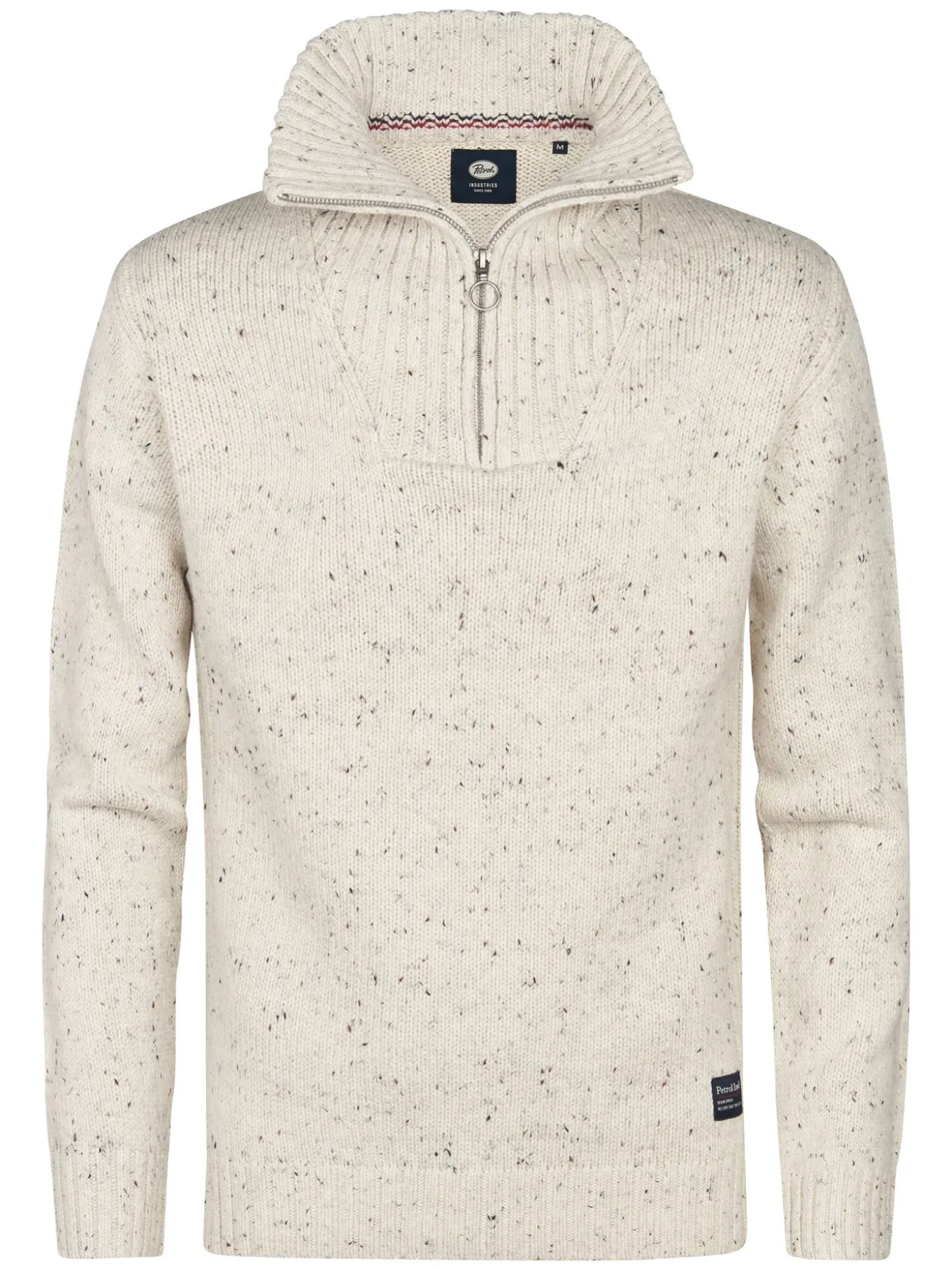 Deze witte zip sweater van Petrol Industries heeft een frisse, cleane look met subtiele bruine stipjes voor een unieke touch. De iets zwaardere stof geeft de trui een kwalitatieve uitstraling en voelt stevig maar comfortabel aan. Dankzij de regular fit zit hij lekker ruim zonder vorm te verliezen. Perfect voor frisse dagen en makkelijk te combineren met jeans of een lichte jas voor een casual, moderne stijl.