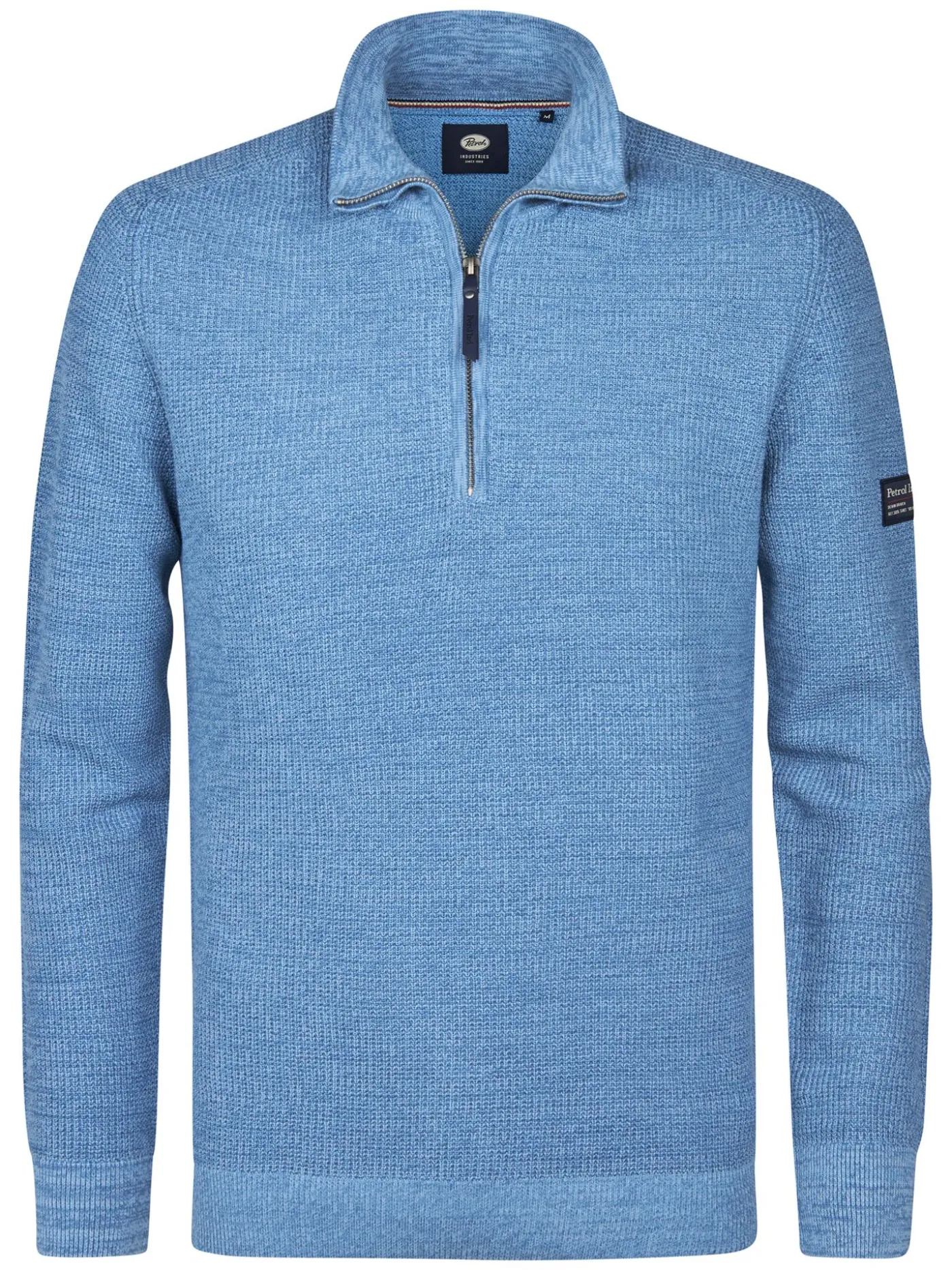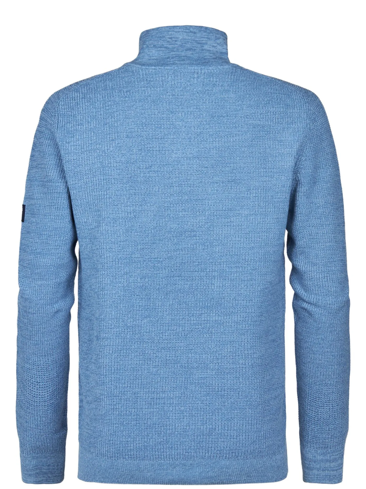 Deze lichtblauwe knitwear trui van Petrol Industries combineert comfort met een stoere uitstraling. De opstaande kraag met halve ritssluiting geeft de trui een sportieve touch, ideaal om zowel open als gesloten te dragen. De trui is gemaakt van een grofgebreide stof met structuur en heeft geribde boorden.De regular fit zorgt voor een fijne pasvorm zonder in te leveren op bewegingsvrijheid. Het subtiele Petrol-logo op de mouw maakt de look compleet. Perfect te combineren met een jeans voor een casual outfit met karakter.