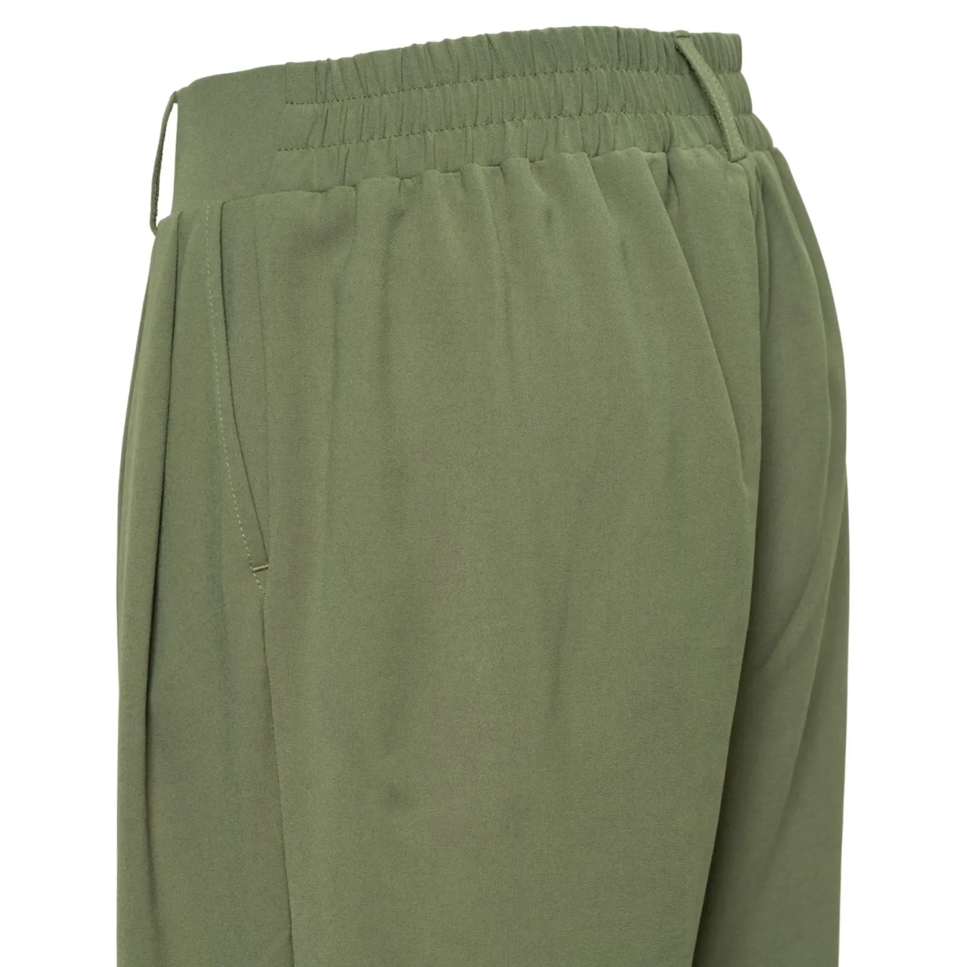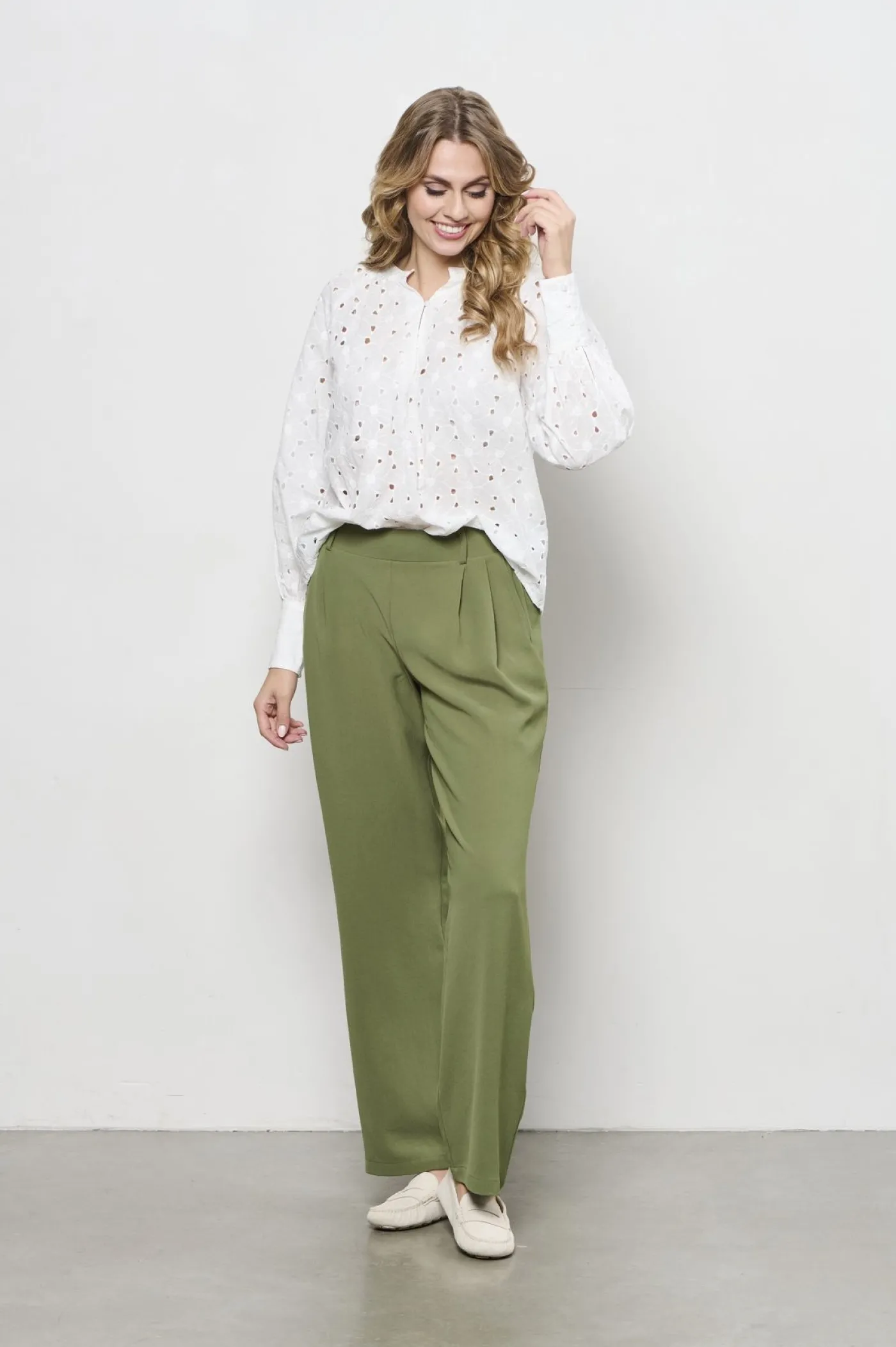 Deze toffe groene pantalon van &Co Woman is een echte musthave voor elke kleding kast. De broek heeft een wijde pijp, elastische tailleband en riemlussen. De broek is gemaakt van een comfortabele stretch stof en heeft steekzakken aan de voorkant. Door de groene kleur is deze pantalon eindeloos te combineren. Je kunt de broek bijvoorbeeld voor een chique look combineren met een mooie blouse of voor een wat meer casual look met een t-shirt of trui erop.