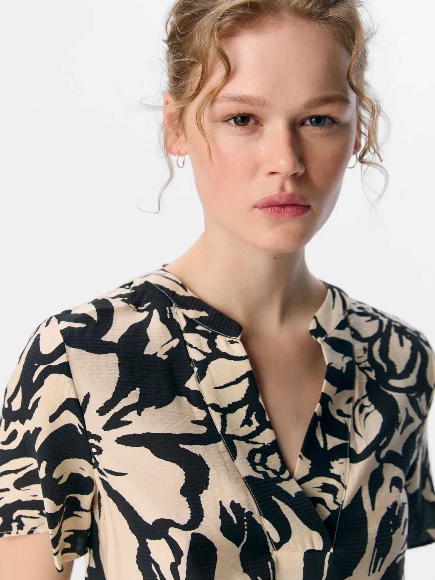 Deze top met korte mouwen en v-hals is onderdeel van de nieuwste collectie van Object. De top heeft een all-over print in gebroken wit met zwart. Je kunt deze top combineren met bijvoorbeeld een lichtgekleurde jeans of een pantalon.