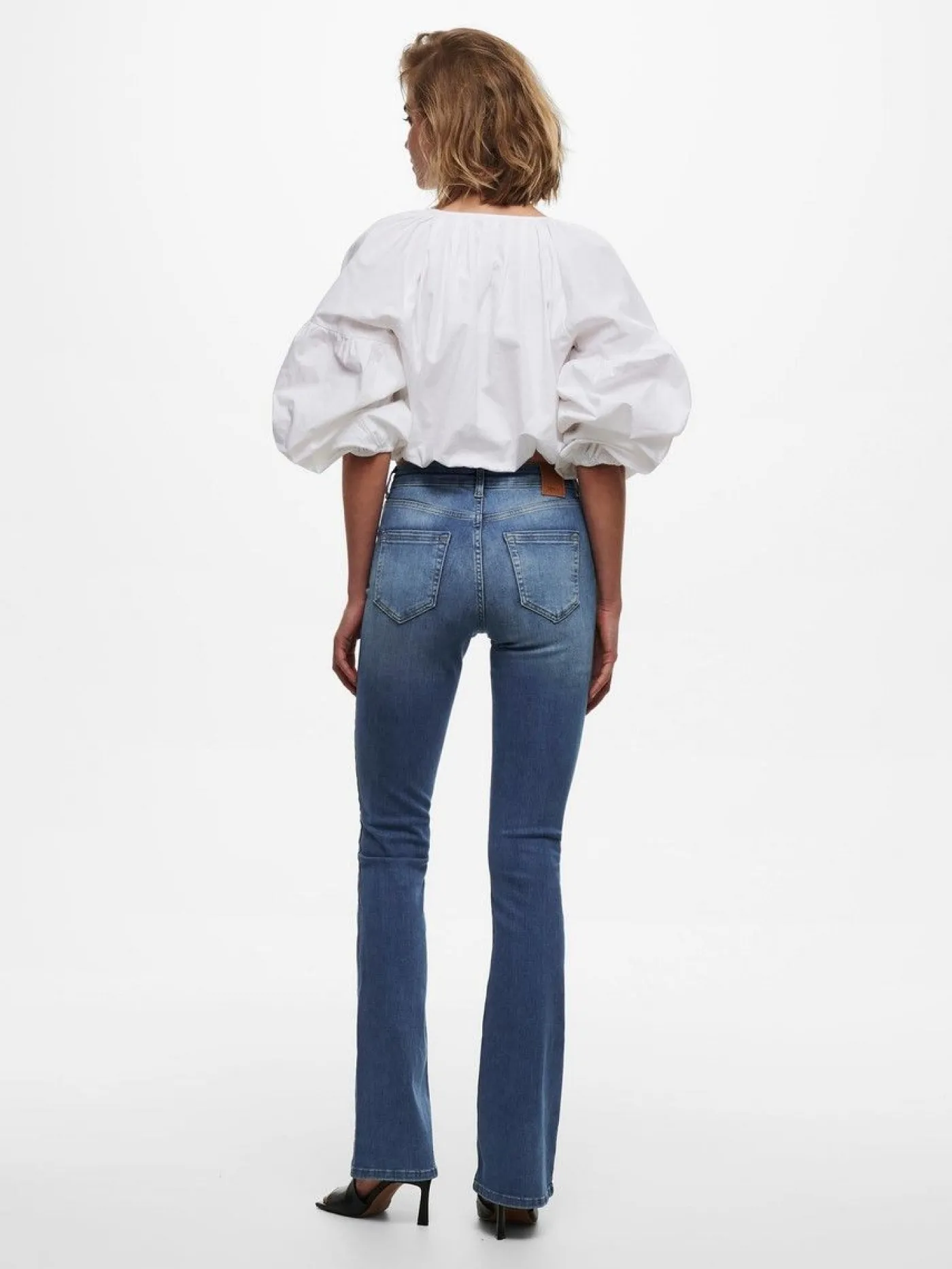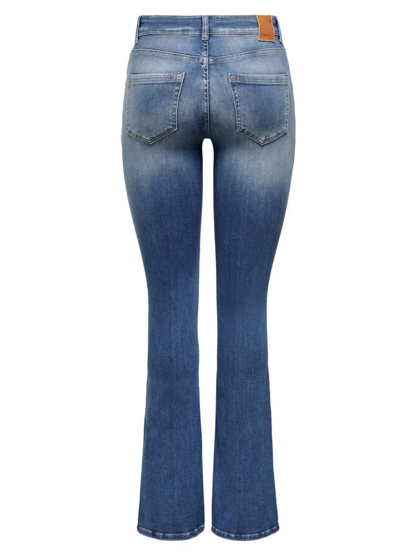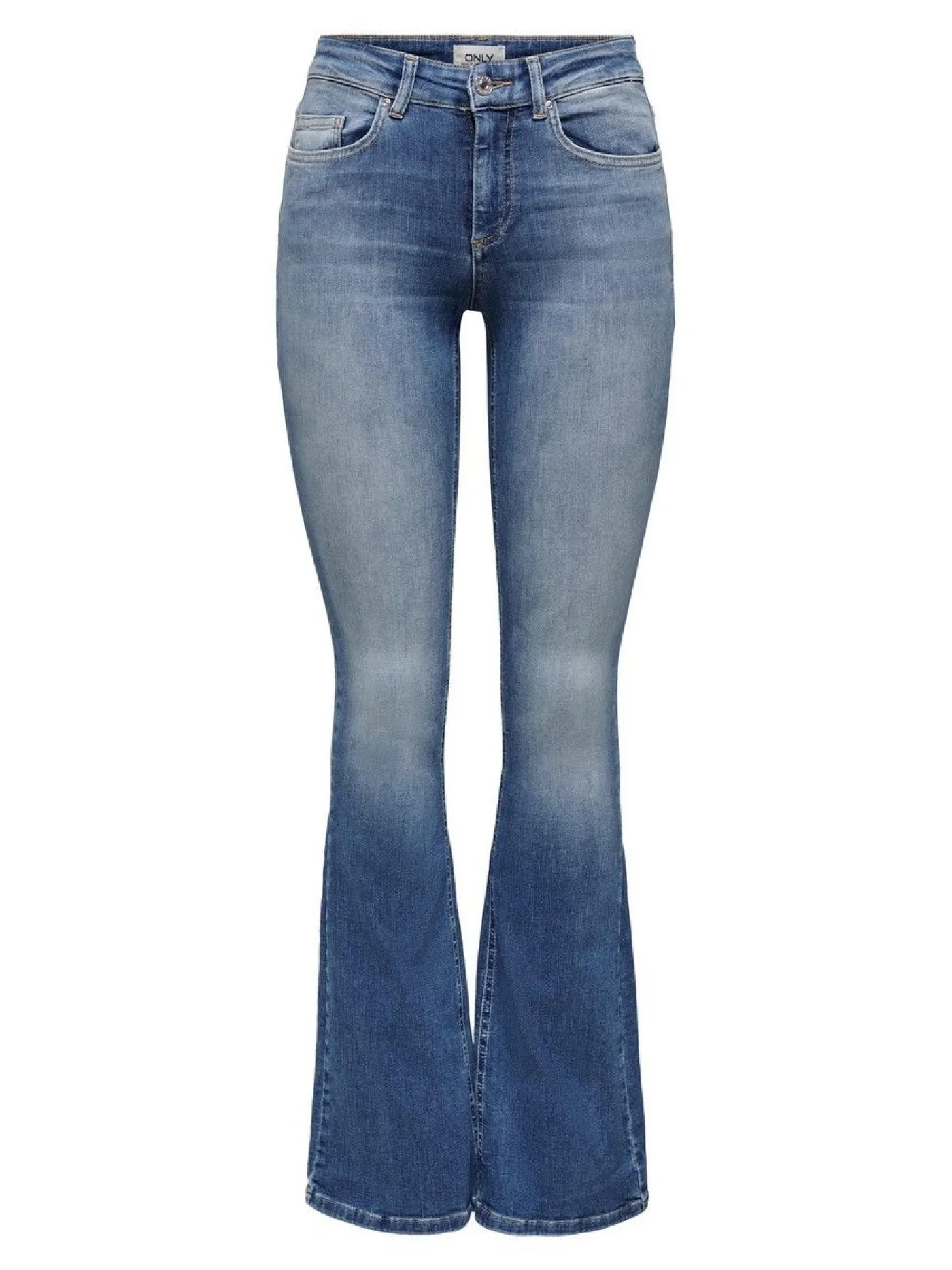 Jeans in een blauwe kleur van het merk Only. De jeans is een flared model met een mid waist. Combineer met een leuke blouse en een hakje voor een extra vrouwelijke look.
