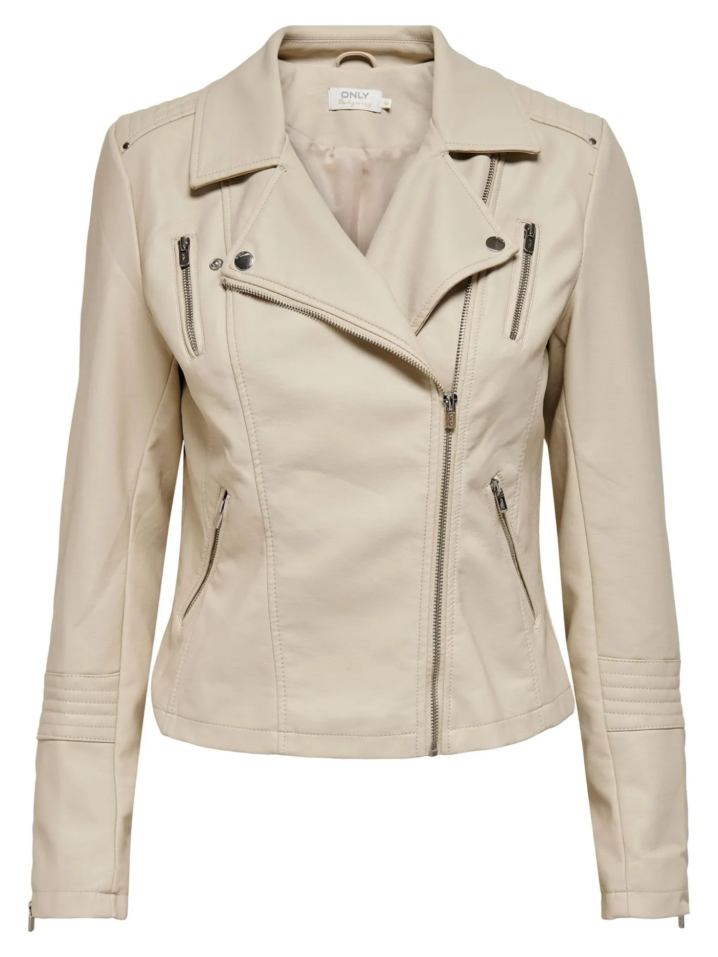 Lederlook bikerjack in de kleur beige van het merk Only. Dit jasje heeft een asymmetrische rits aan de voorzijde en twee steekzakken ook voorzien van een rits. Dit jack heeft lange mouwen en een kraagje voorzien drukknopen. De onderzijde van de mouwen hebben ook een rits.