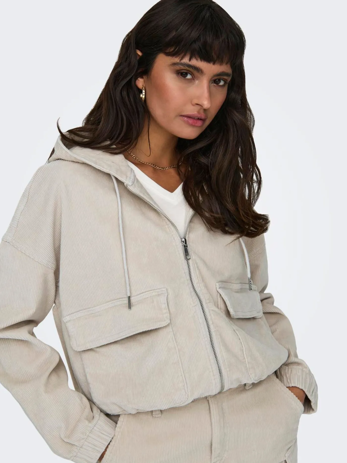 Deze zomerjas is van de nieuwe collectie van Only. Hij is gemaakt van een ribstof, heeft een ritssluiting en een capuchon met trekkoord. Ook aan de onderkant heeft de jas een trekkoord waarmee je de jas kunt aantrekken. De jas heeft aan de voorkant twee klepzakken.