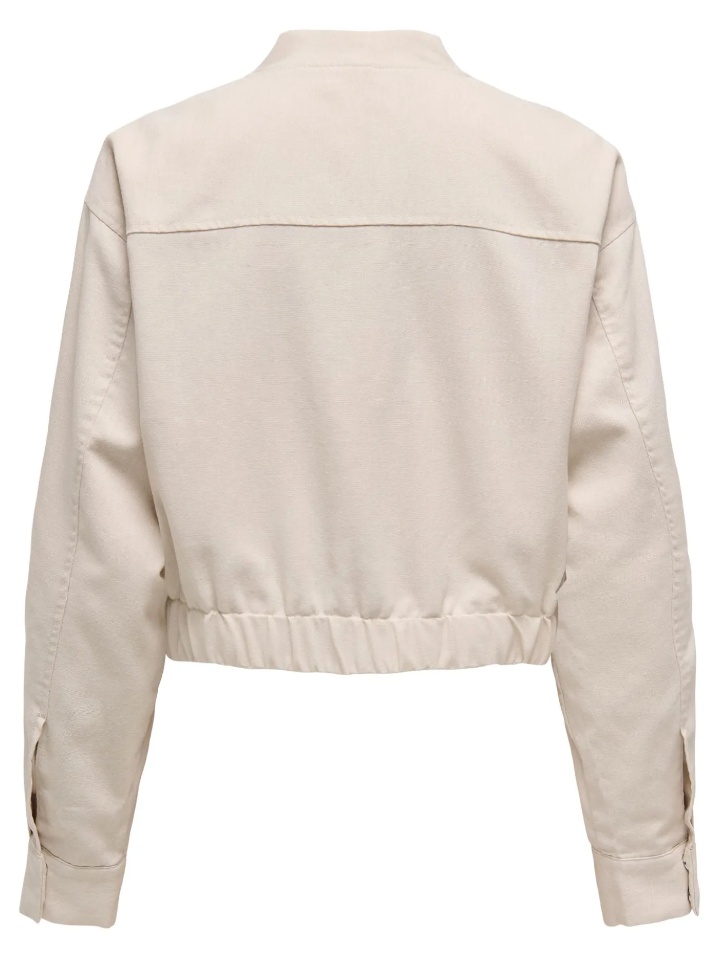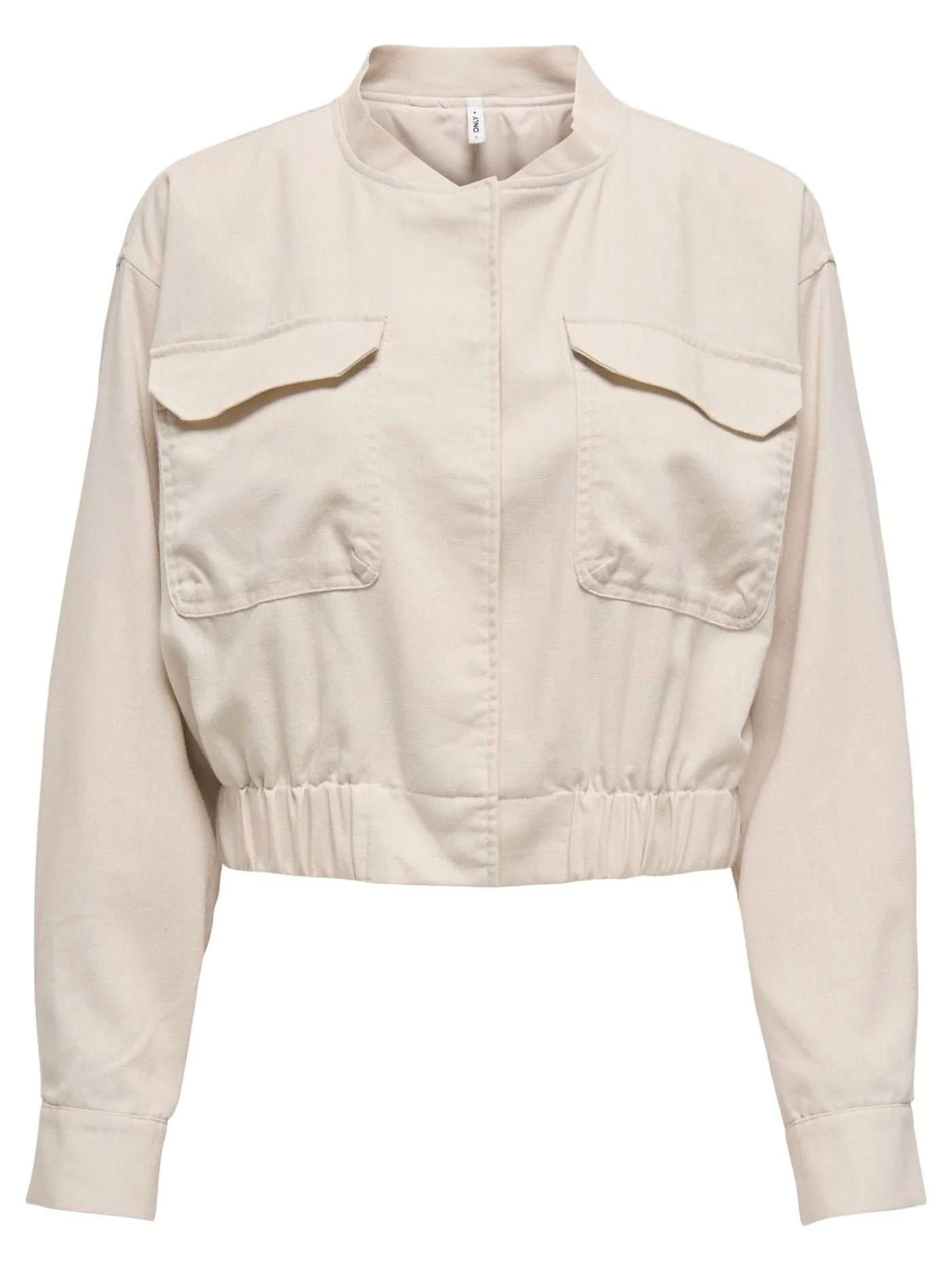 Beige linnen bomber jasje van het merk Only. Dit item is voorzien van een opstaand kraagje en drukknoopsluitingen. Verder heeft het jasje lange mouwen, twee grote borstzakken met klepsluiting een elastische band in de taille.