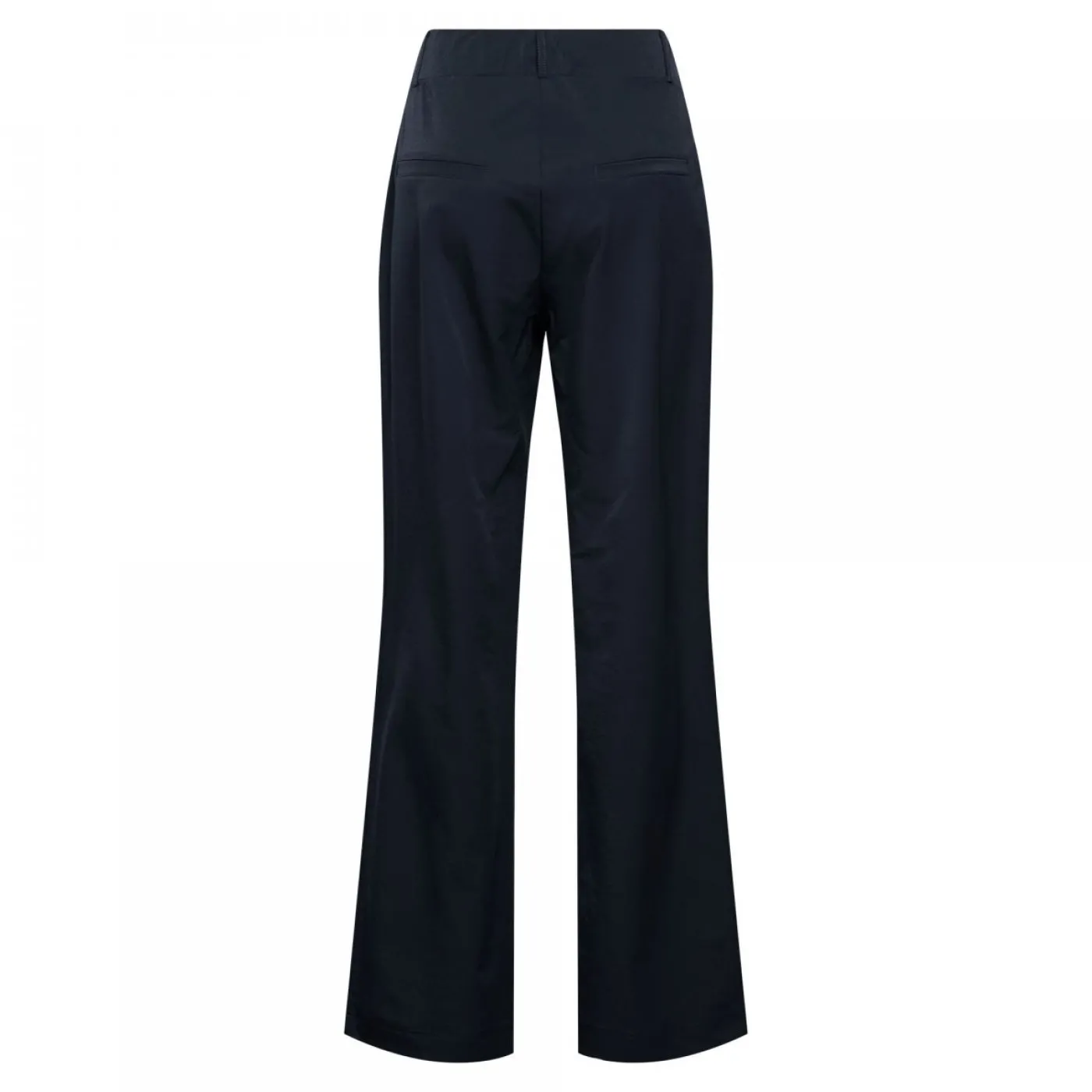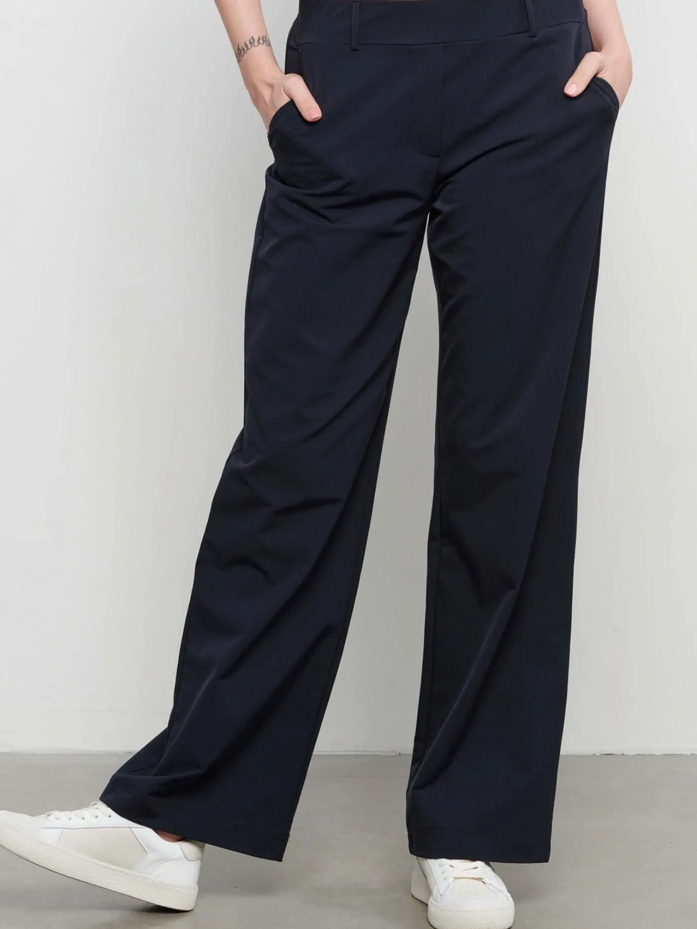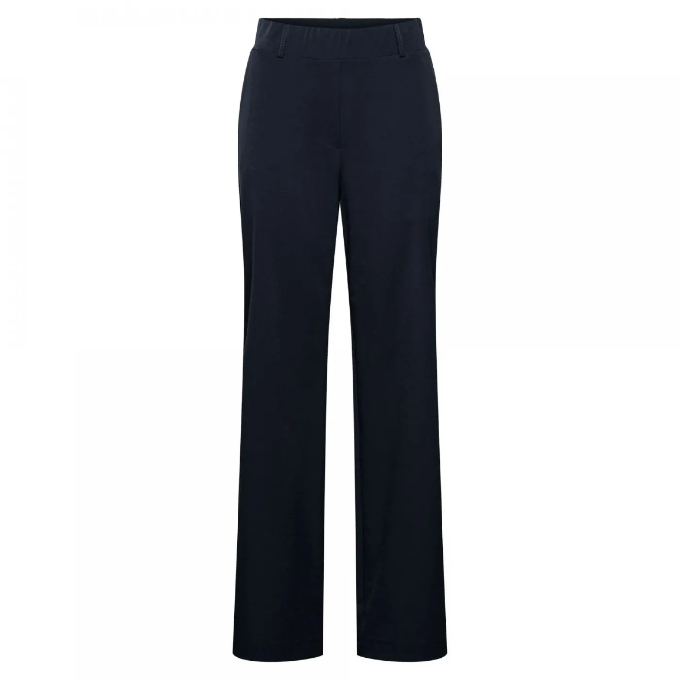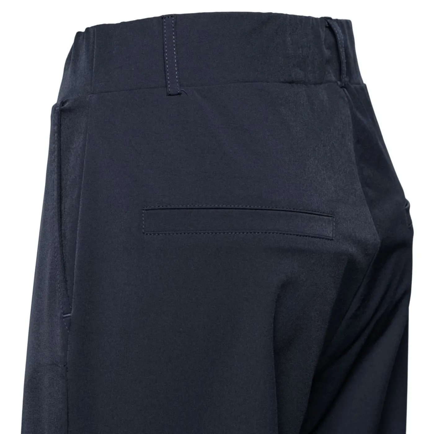 Deze donkerblauwe straight fit broek van het merk &Co woman met steekzakken is uitgevoerd in een travel-kwaliteit. Aan de achterzijde heeft de broek sierzakken en hij is voorzien van een elastische tailleband met riemlussen.
