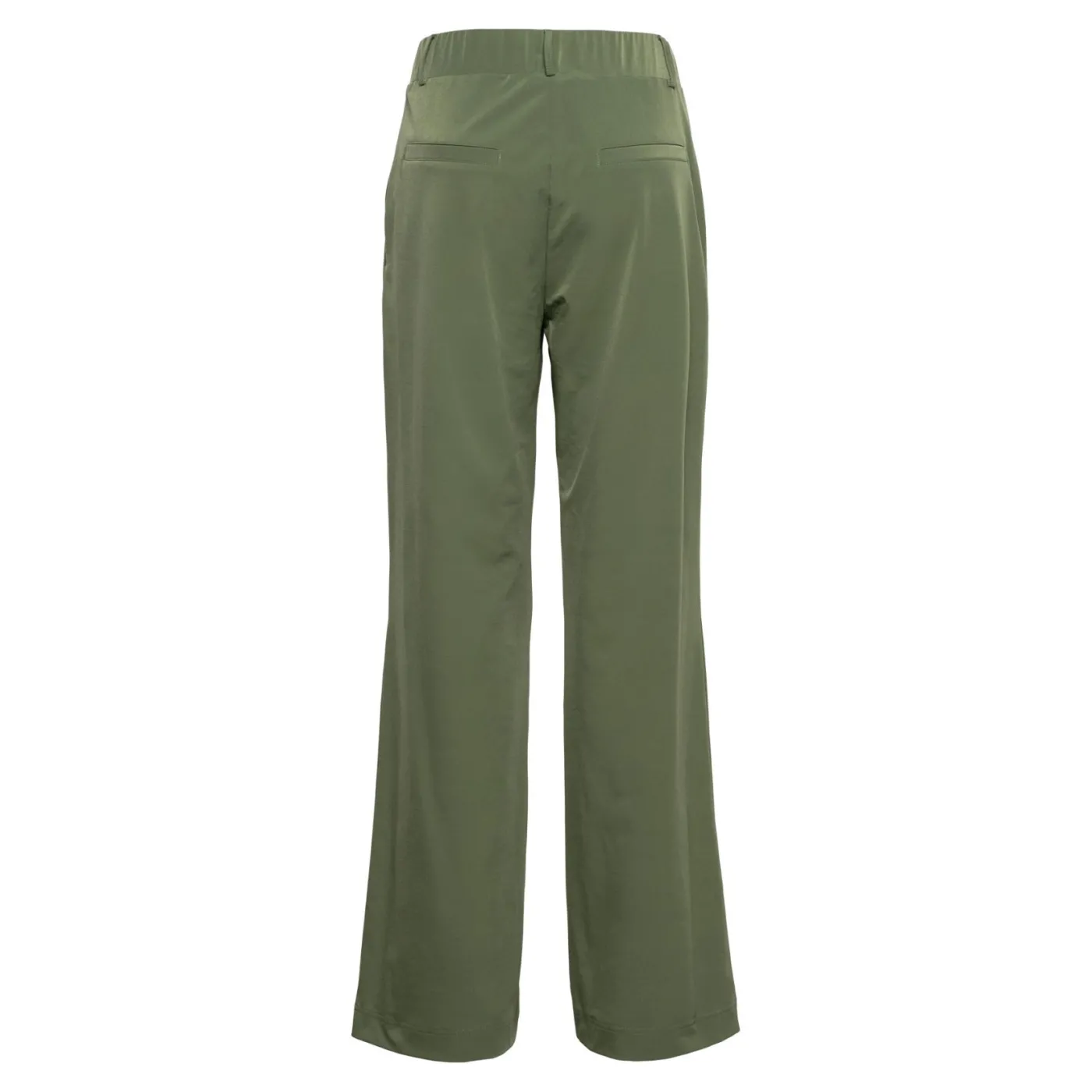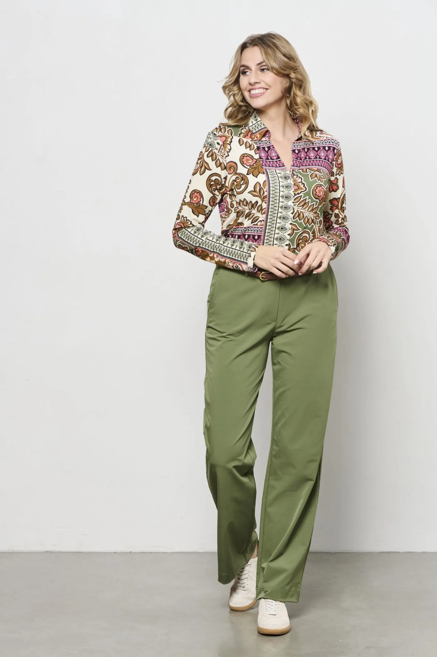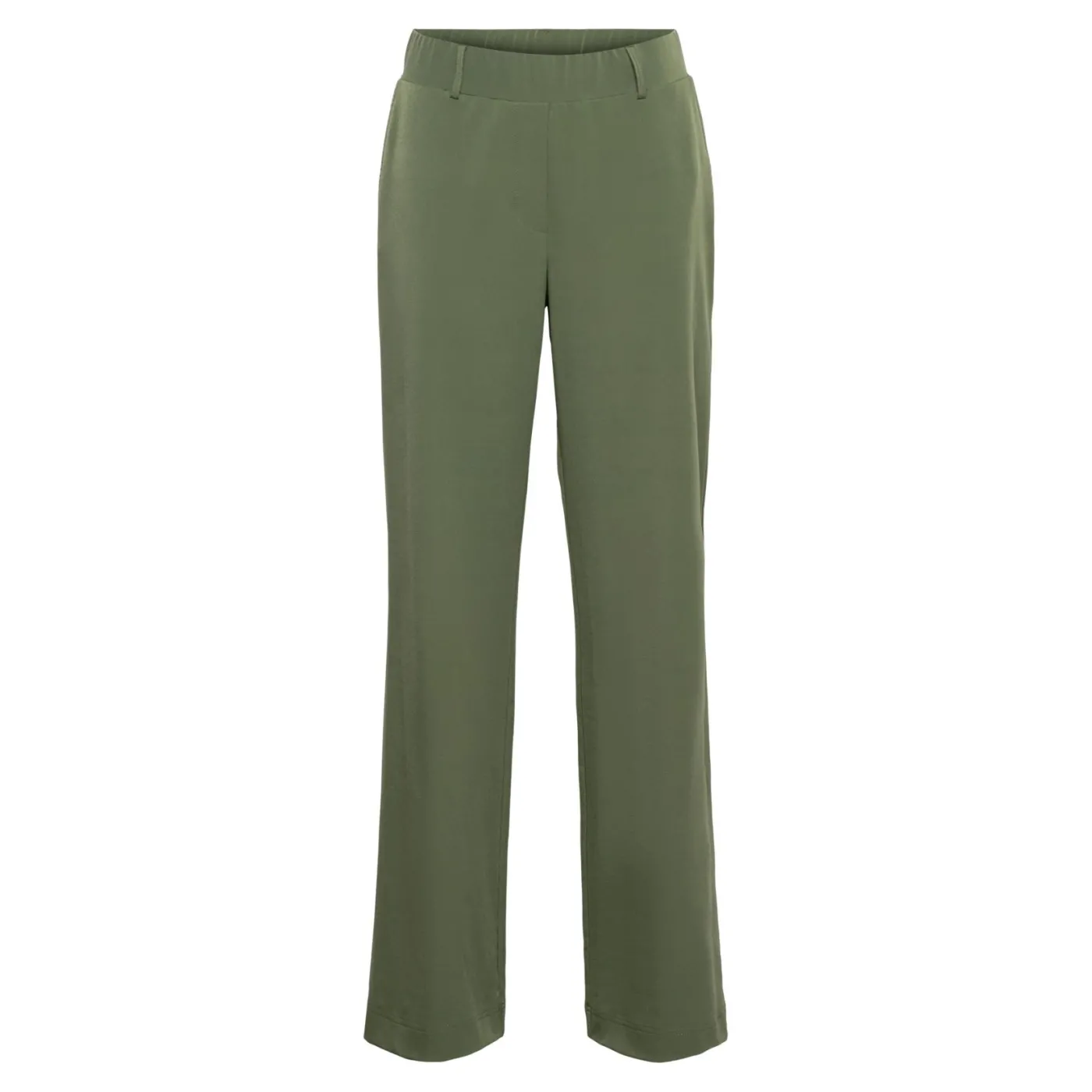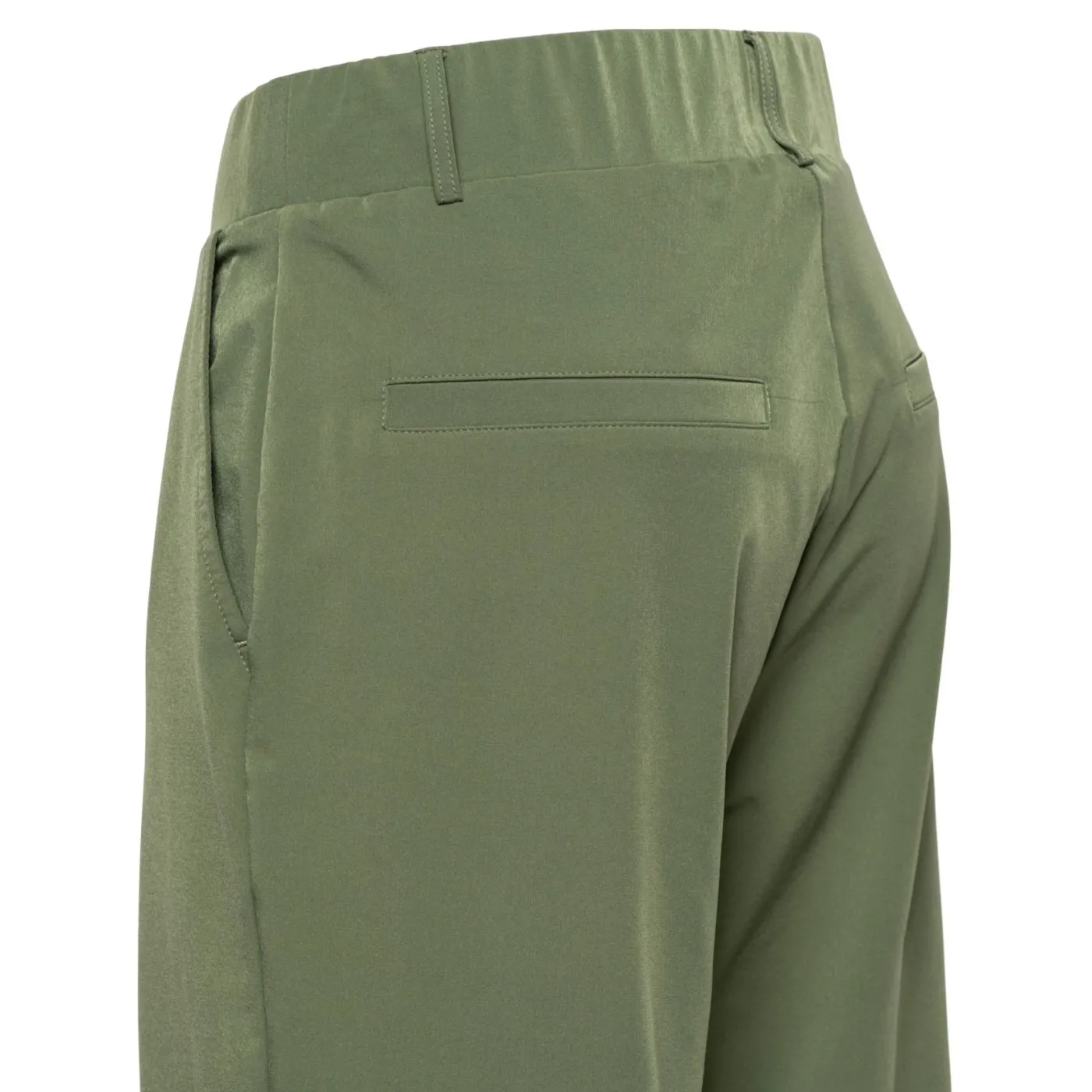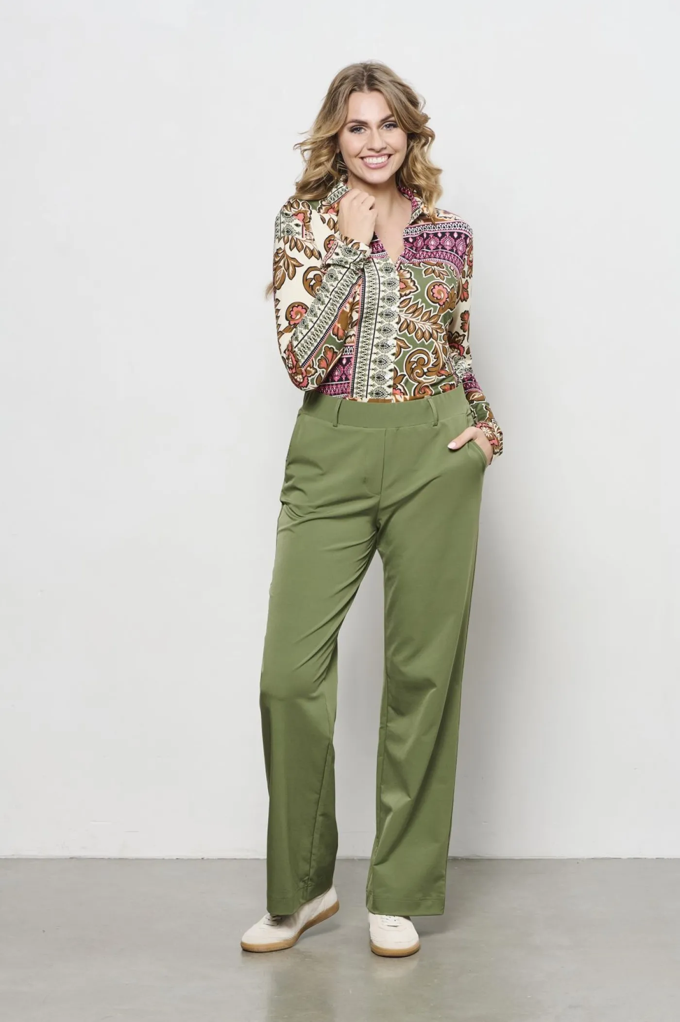 Deze olijf groene broek van travelstof is van het met &Co Woman. De broek heeft een uitlopende broekspijp en is voorzien van steekzakken aan de voorkant en nepzakken aan de achterkant. De broek is voorzien van een elastische tailleband en riemlussen. Je kunt de broek combineren met deVayen leafblouse en dePhileine blazervoor een chiquere look.