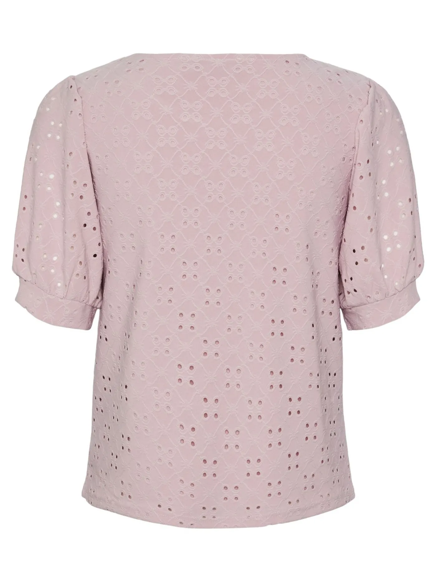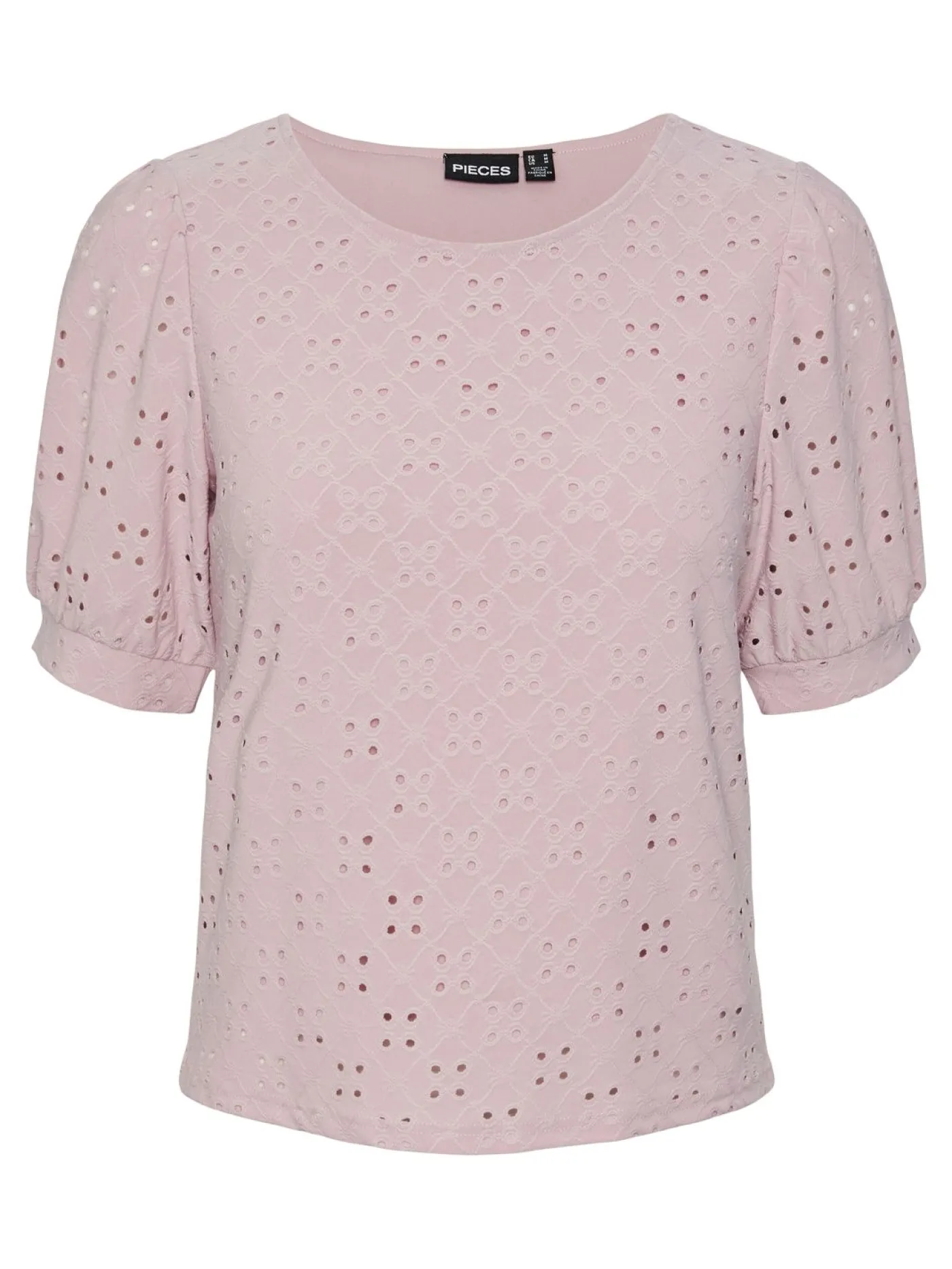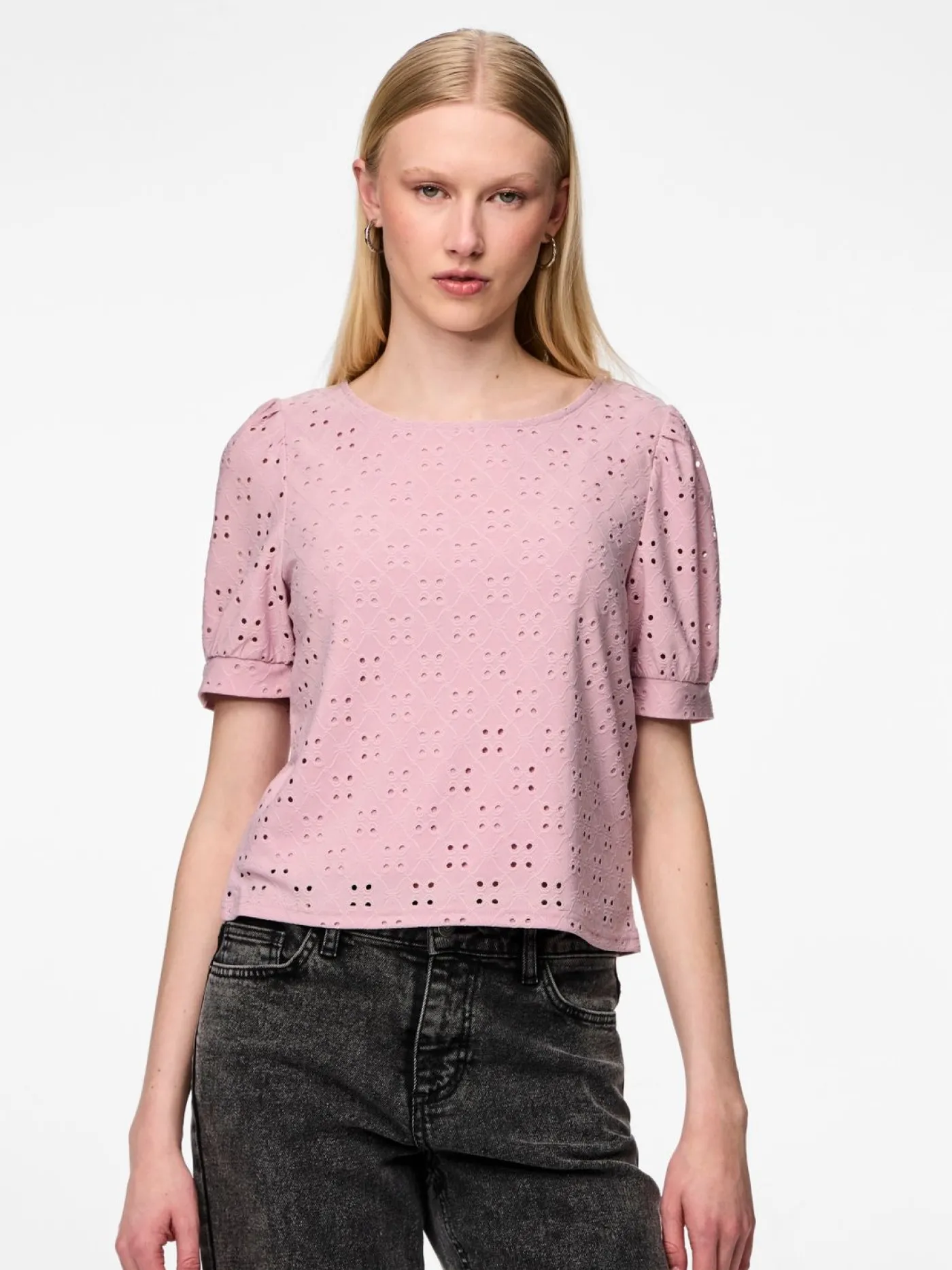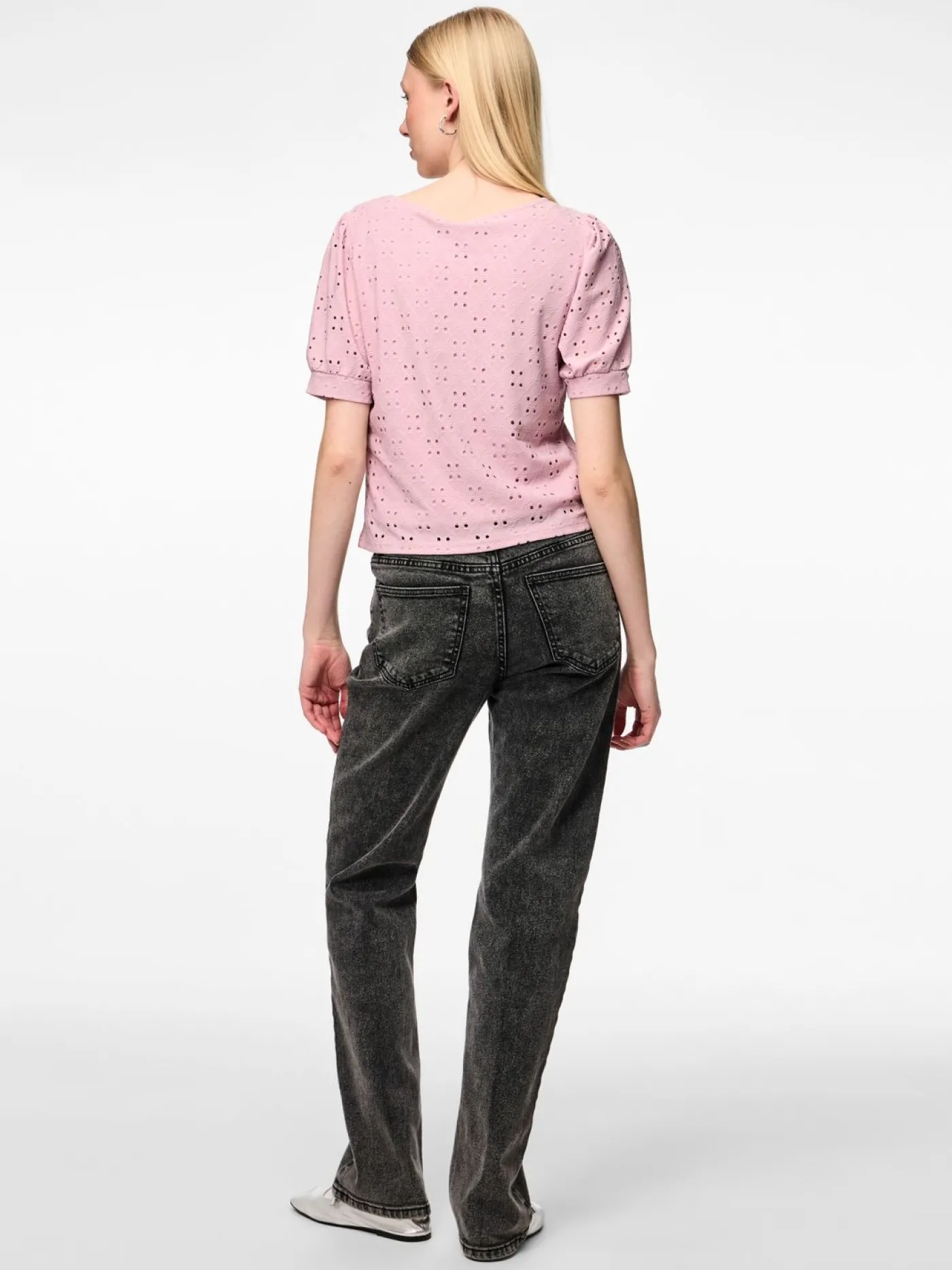 Deze rozeembroiderytop is van het merk Pieces. De top heeft korte mouwen en een ronde hals, je kan combineren met een paar jeans of een pantalon.