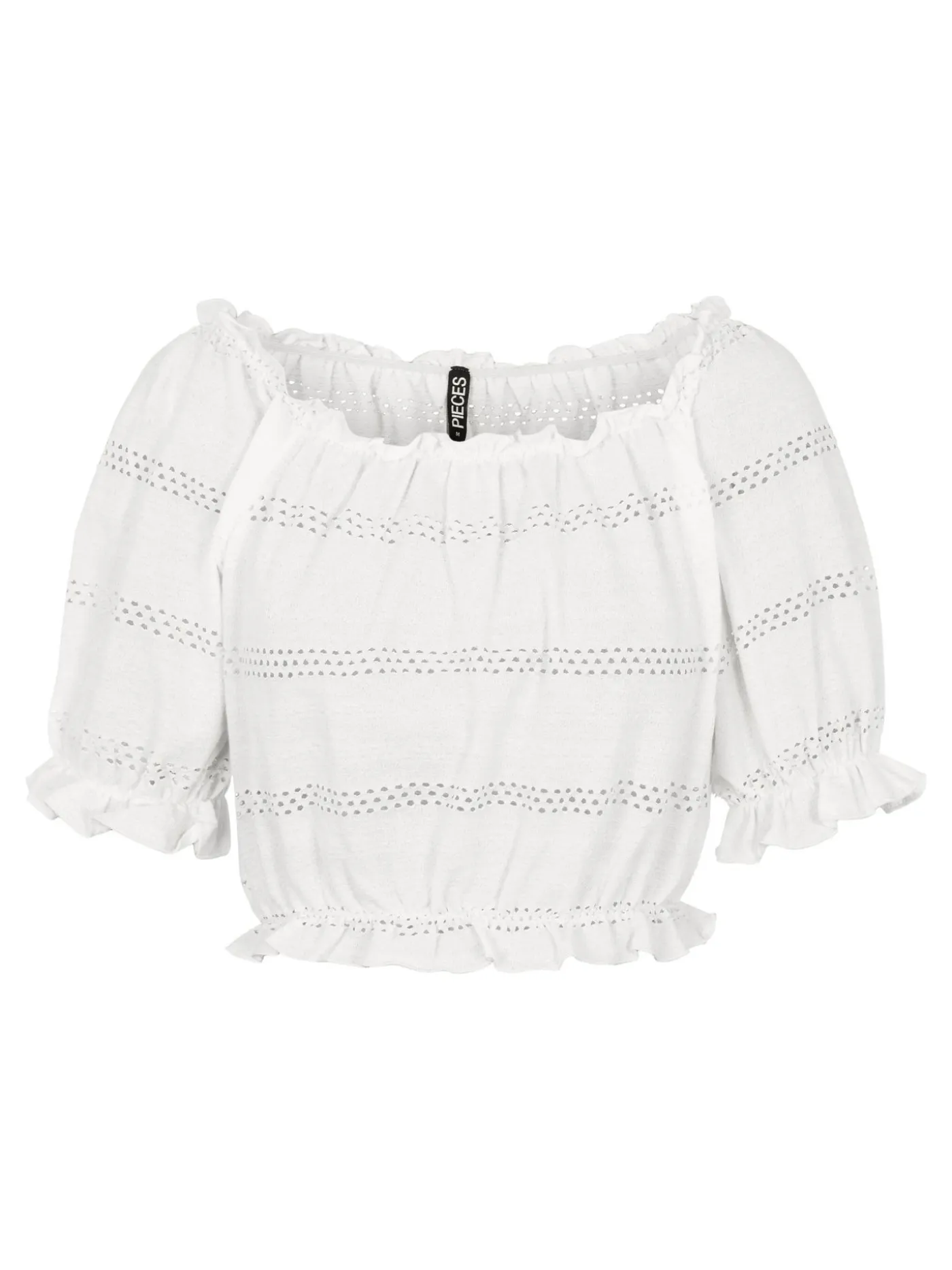 Deze witte top van PIECES straalt zomerse charme uit met haar luchtige stof en romantische details. De elastische halslijn en mouwen zorgen voor een speels, vrouwelijk silhouet, terwijl de broderie-achtige details een boho-touch toevoegen. De top valt mooi getailleerd dankzij het elastiek in de taille en aan de mouwuiteinden. Perfect te dragen off-shoulder voor een extra zomerse look. Combineer met een denim short of rok voor een frisse en vrouwelijke outfit. Ideaal voor warme dagen of een casual dagje uit.